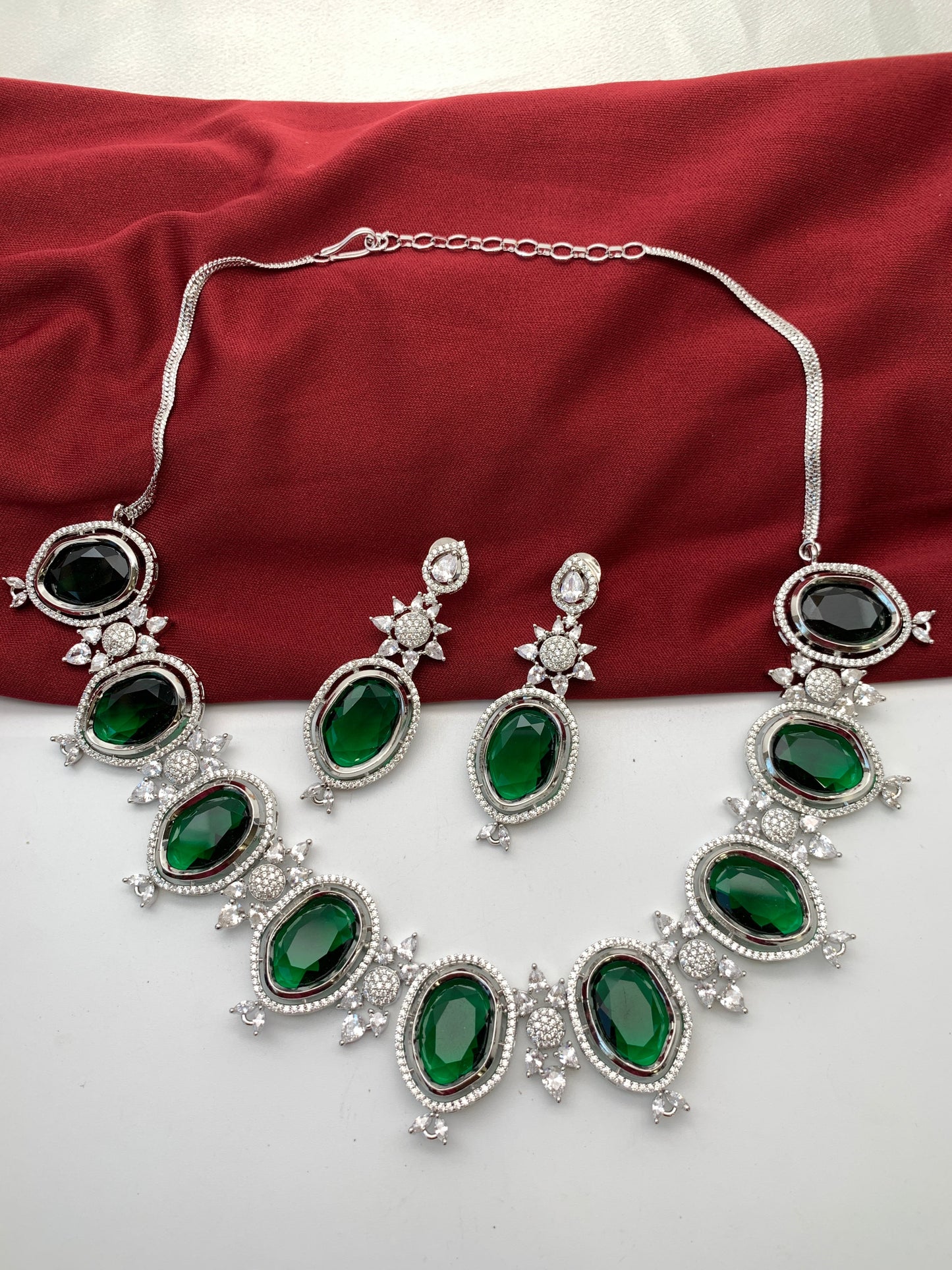 CZ Green Doublet Stone Silver Finish Short Neckalce with Matching EarringsColor : Silver ADSize : Necklace Length : Approx 16 Inches; Earrings Length : 2.25 InchesStones : American Diamond Green Stone