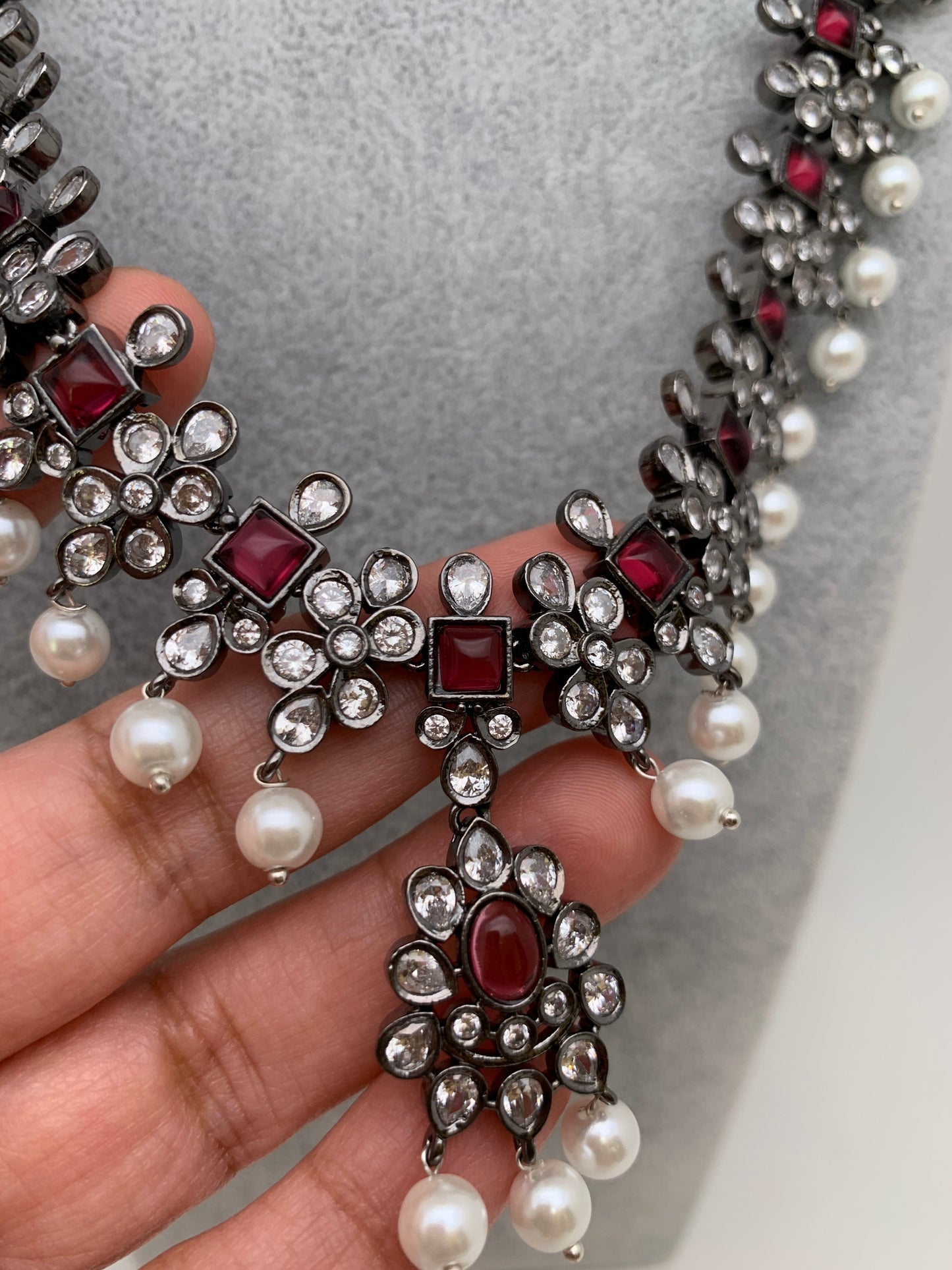 CZ Pink Stone Pearls Victorian Finish Short Neckalce