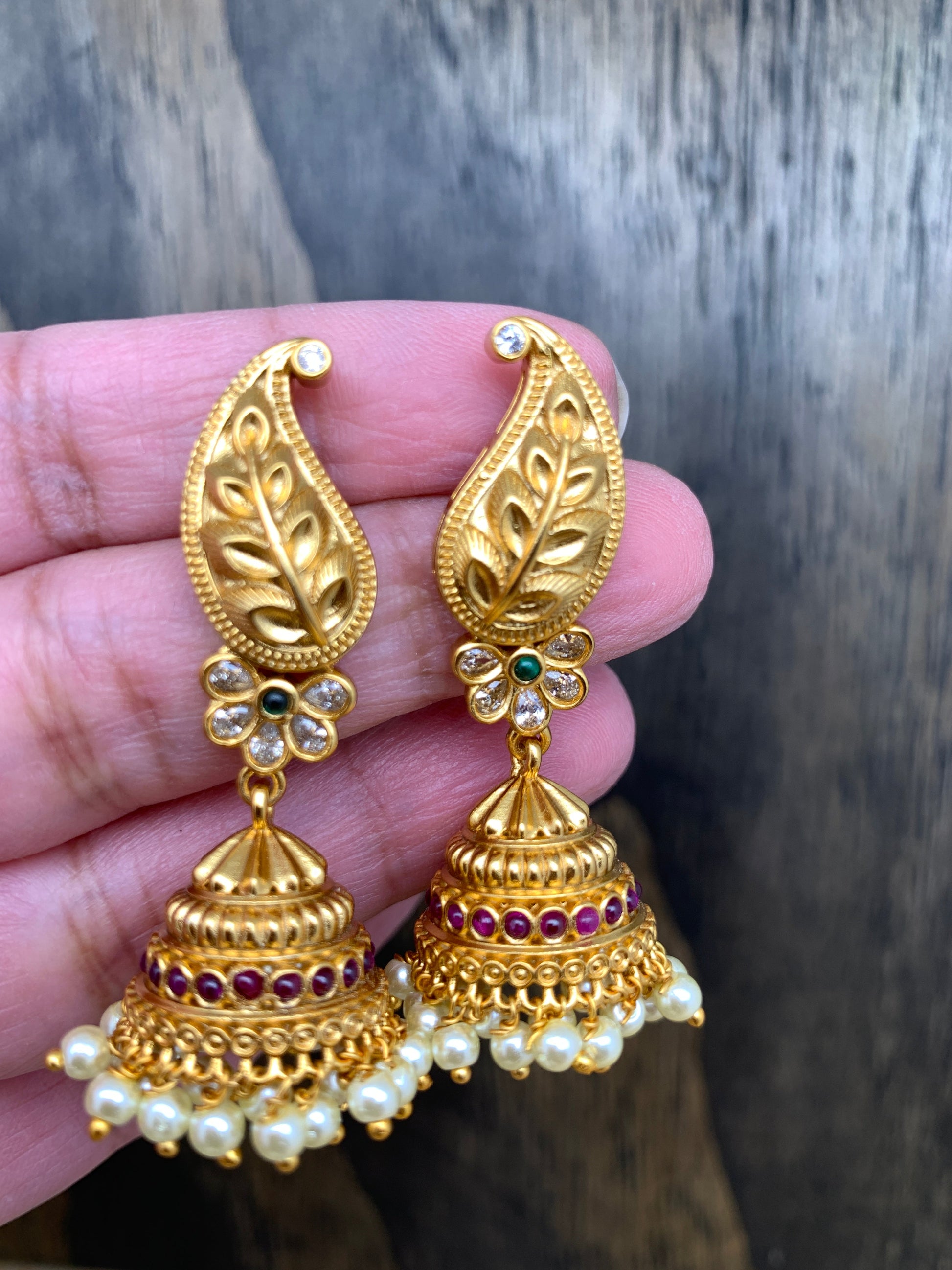 CZ Red Green Kemp and Pearls Mango Leaf JhumkiColor : GoldenSize : Approx 2 InchesStones : Red Green Kemp CZ Pearls