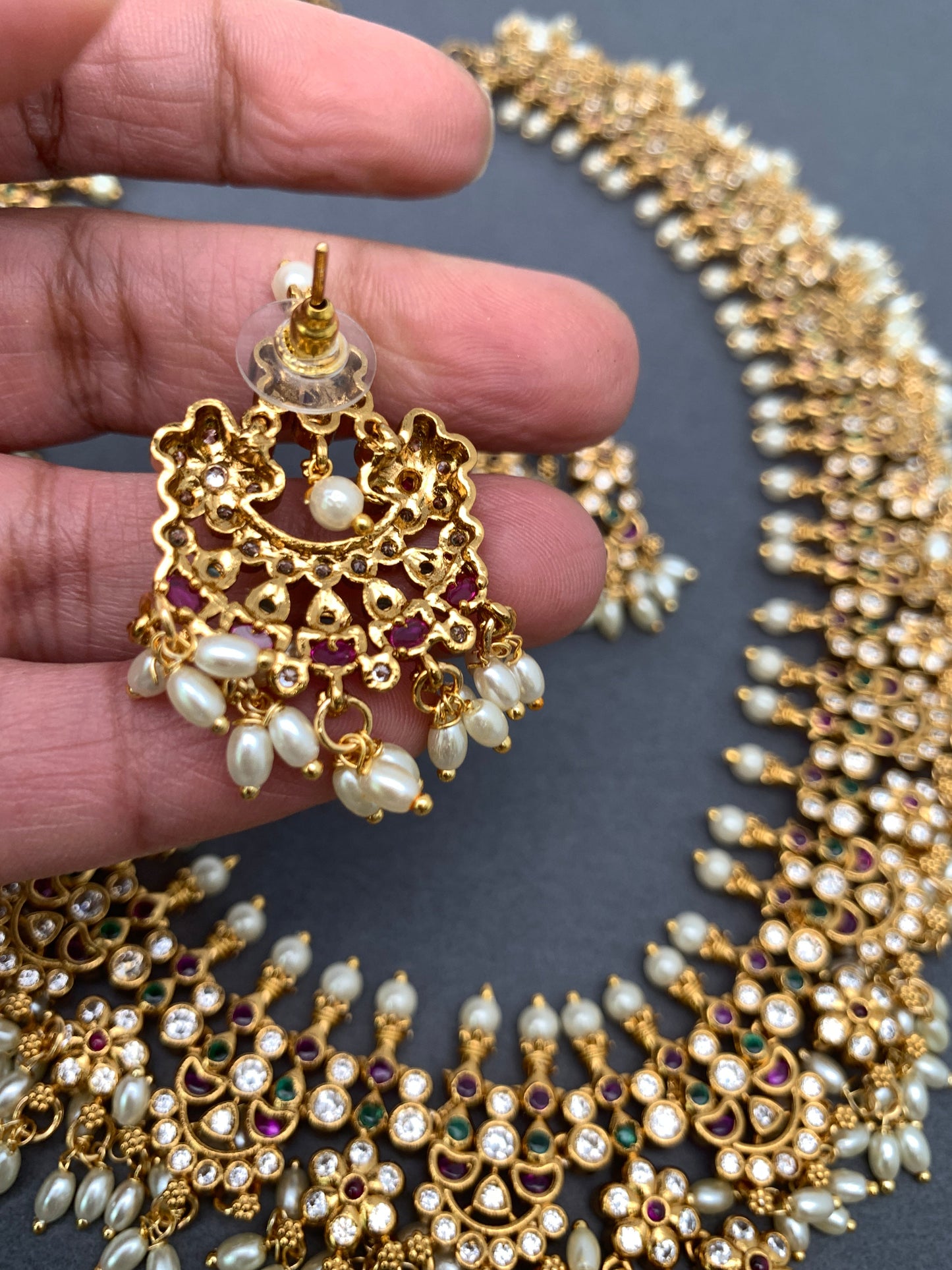 CZ Red Green Multi Stone Rice Pearls Guttapusalu with matching earringsColor : GoldenSize : Necklace Length : 24 Inches; Earring Length : 1.75 Inches ApproxStones : CZ Red Green Stone Pearls