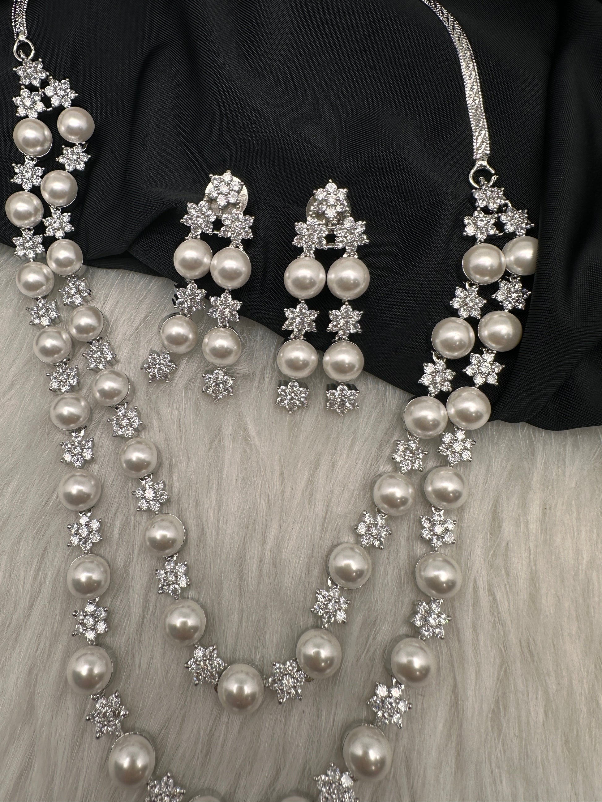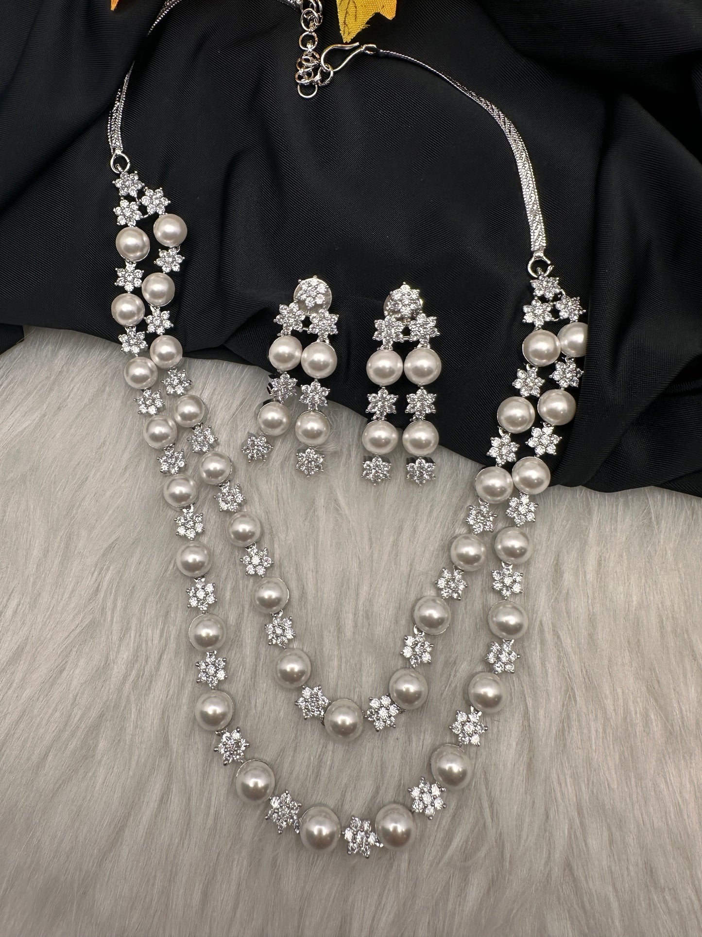 Double Layer Silver Pearl Necklace with matching earringsColor : SilverSize : Necklace Length : Approx 18 Inches; Earring Length: 1.75 InchesStones : CZ and Pearls