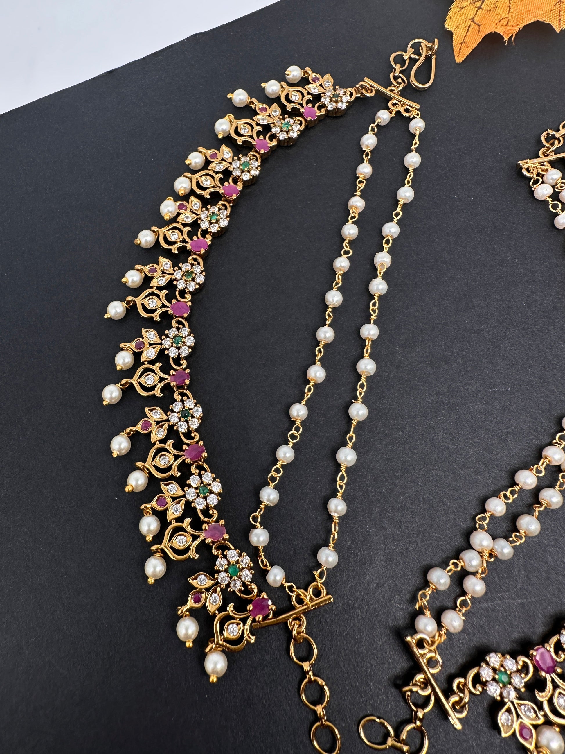 Floral Matte Multi stone EarChainColor : MatteSize : Length : Approx 5.5 inchesStones : Red Green CZ Stone and Pearls