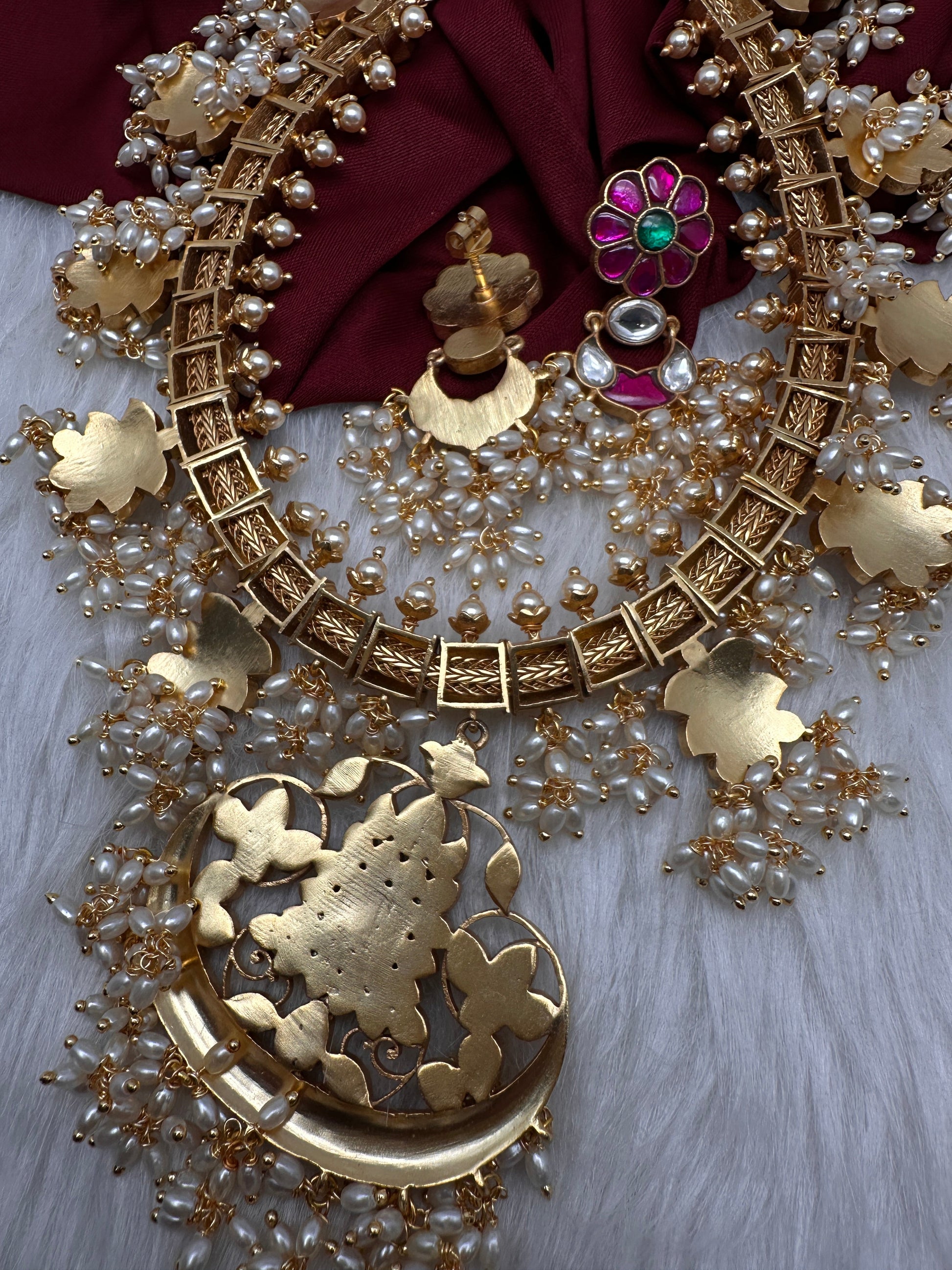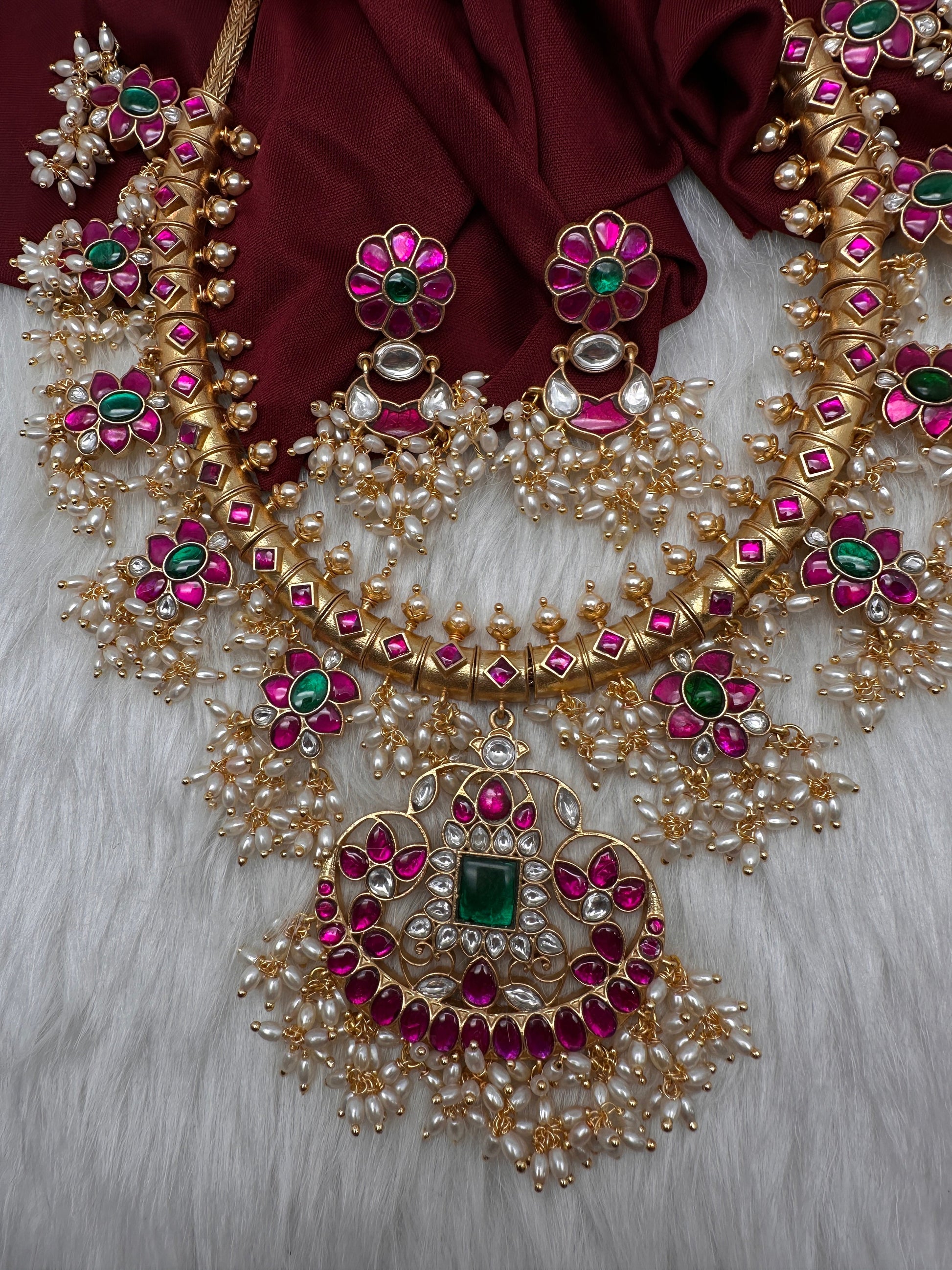 Floral Rice Pearls Jadau Kundan Necklace Color : GoldenSize : Necklace Length : 16 Inches; Earrings : 2.25 InchesStones : Red Green Clear Stones Coral Pearls