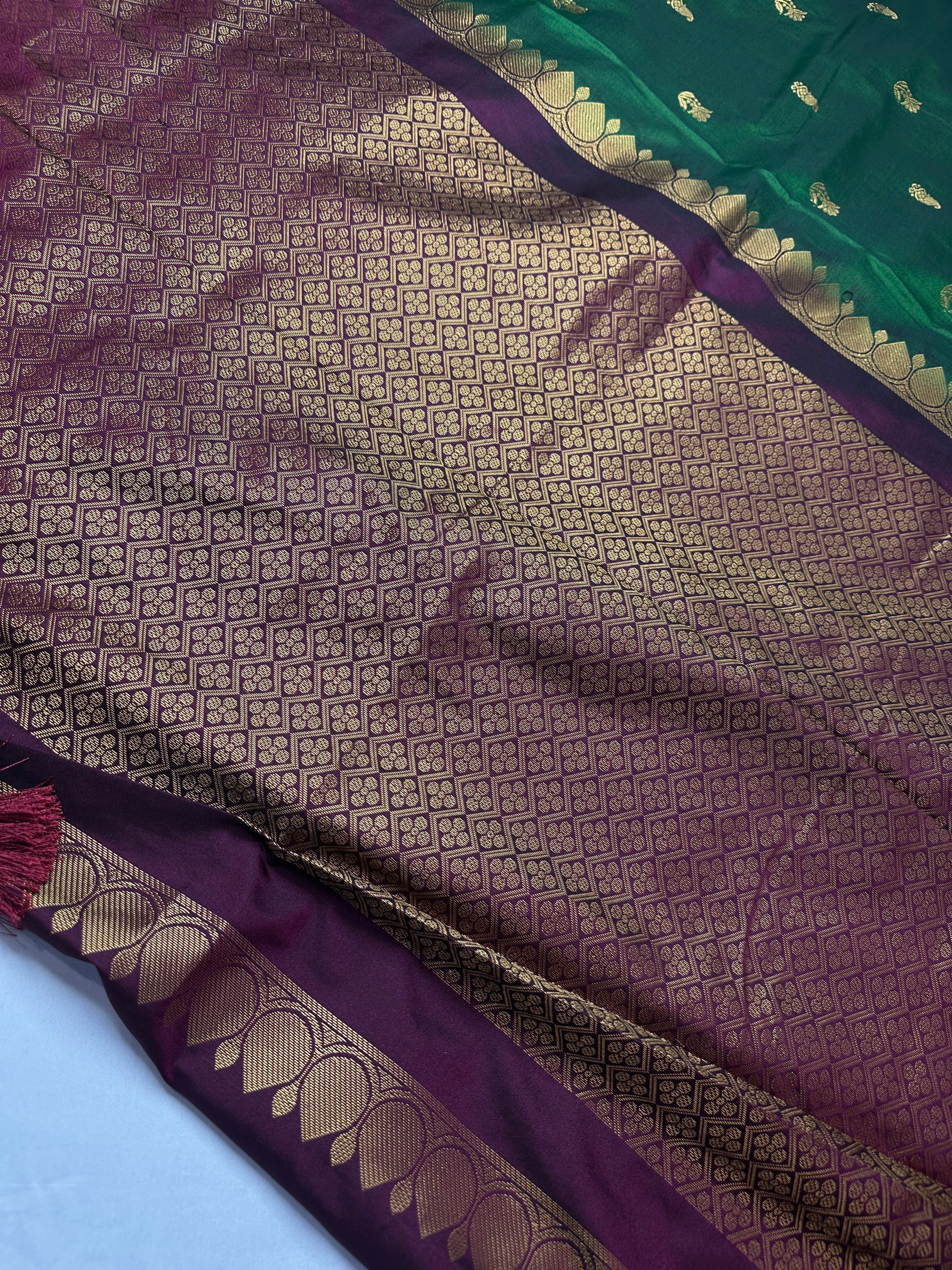 Gadwal Pattu Green Maroon Soft Silk Saree Saree Details : Green Color Saree Red Maroon Pallu Fall and Pico done Blouse Details : Maroon Blouse Size 38 and has margin to go up to Size 46; Sleeves Length : 10 Inches: Blouse Length : 15 Inches; Front Neck : 8 Inches; Back Neck : 10 Inches Inches