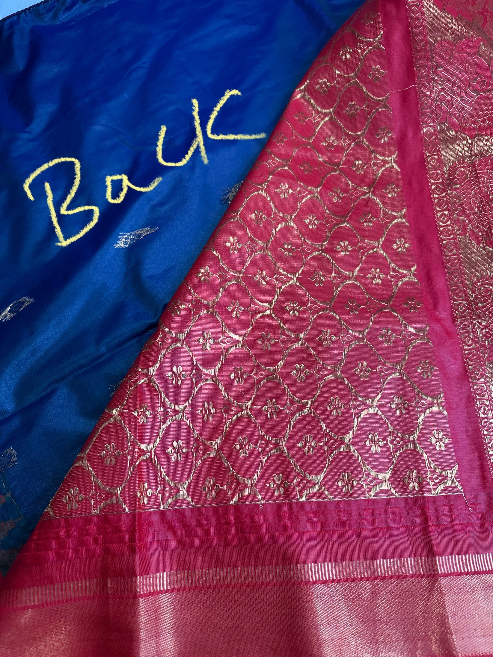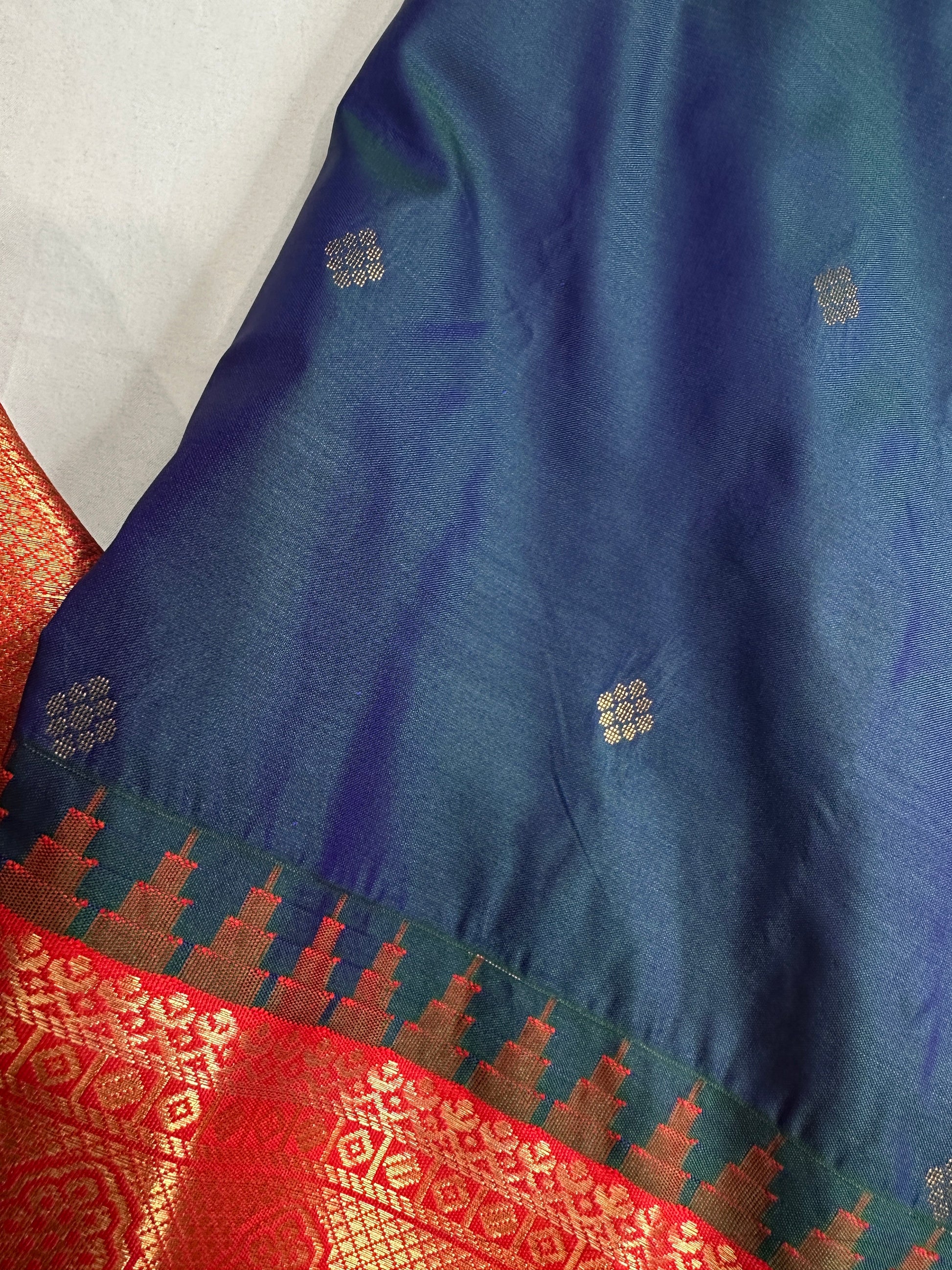 Gadwal Peacock Green Red Saree Saree Details : Peacock Green Color Saree Red Pallu Fall and Pico done Blouse Details : Red Blouse Size 38 and has margin to go up to Size 46; Sleeves Length : 10 Inches: Blouse Length : 15 Inches; Front Neck : 8 Inches; Back Neck : 10 Inches Inches