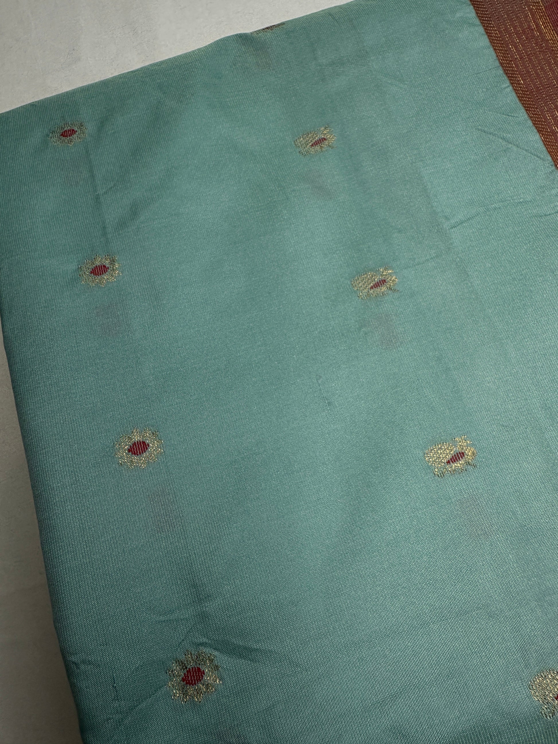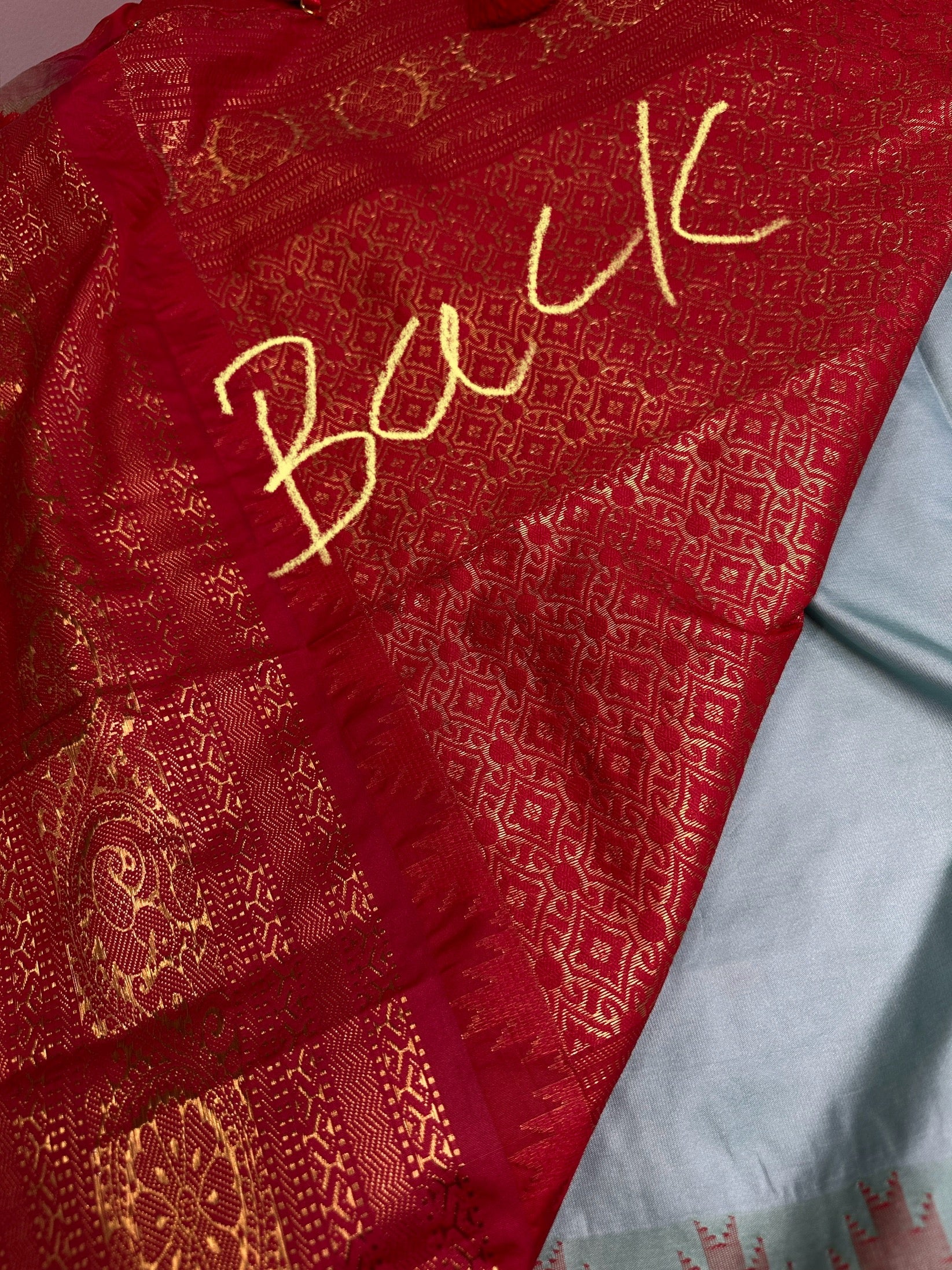 Gadwal Semi Silk Blue Red Saree Saree Details : Blue Color Saree Red Pallu Fall and Pico done Blouse Details : Red Blouse Size 38 and has margin to go up to Size 46; Sleeves Length : 10 Inches: Blouse Length : 15 Inches; Front Neck : 7 Inches; Back Neck : 11 Inches Inches