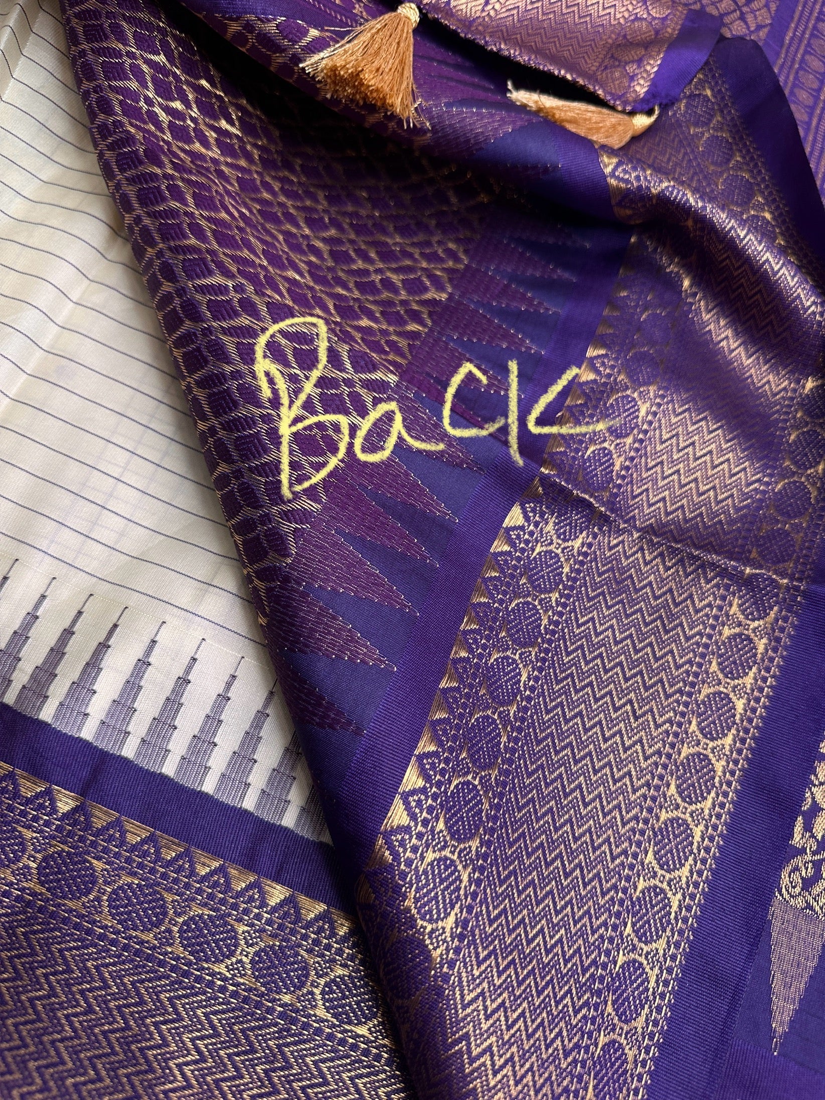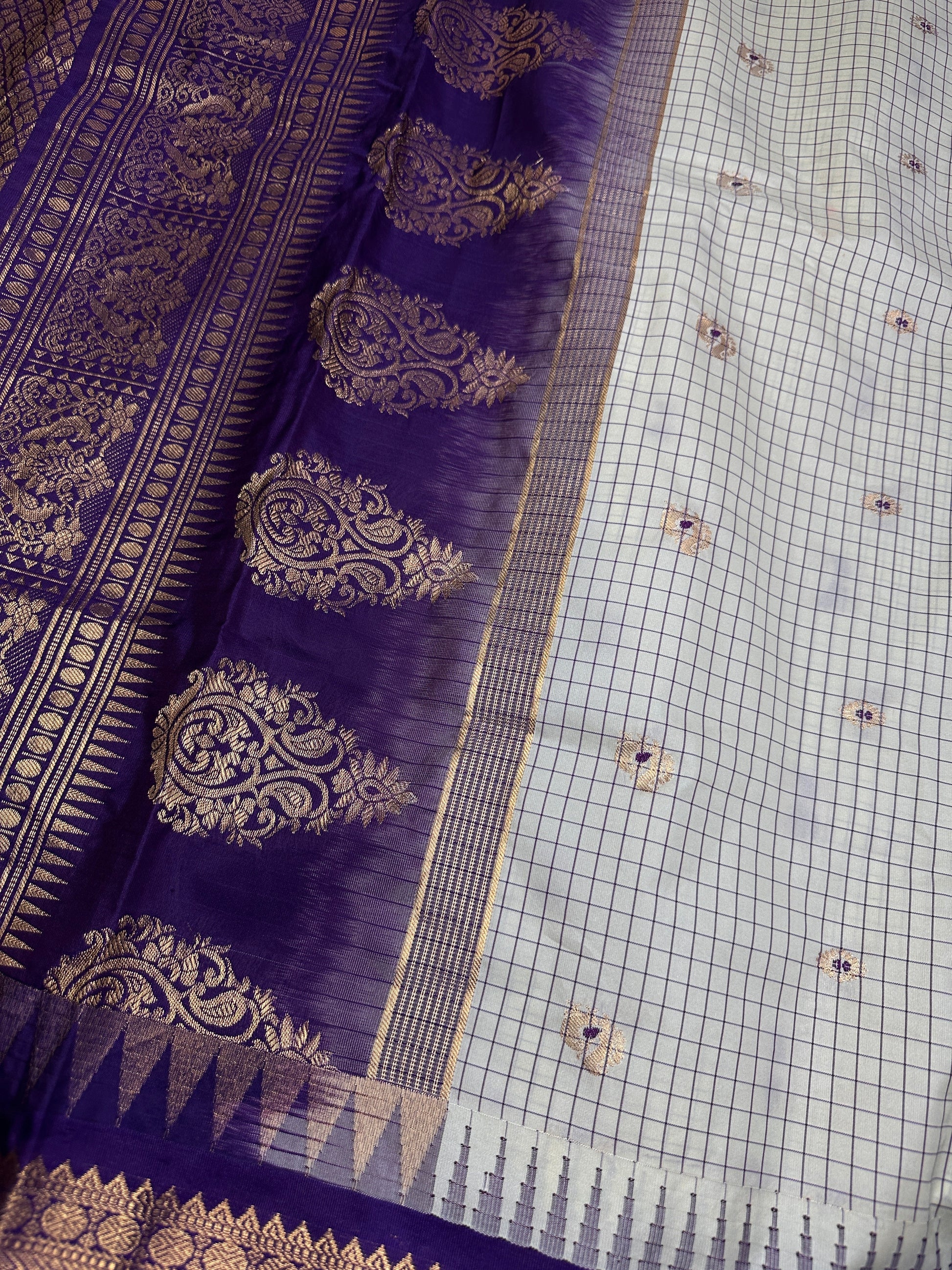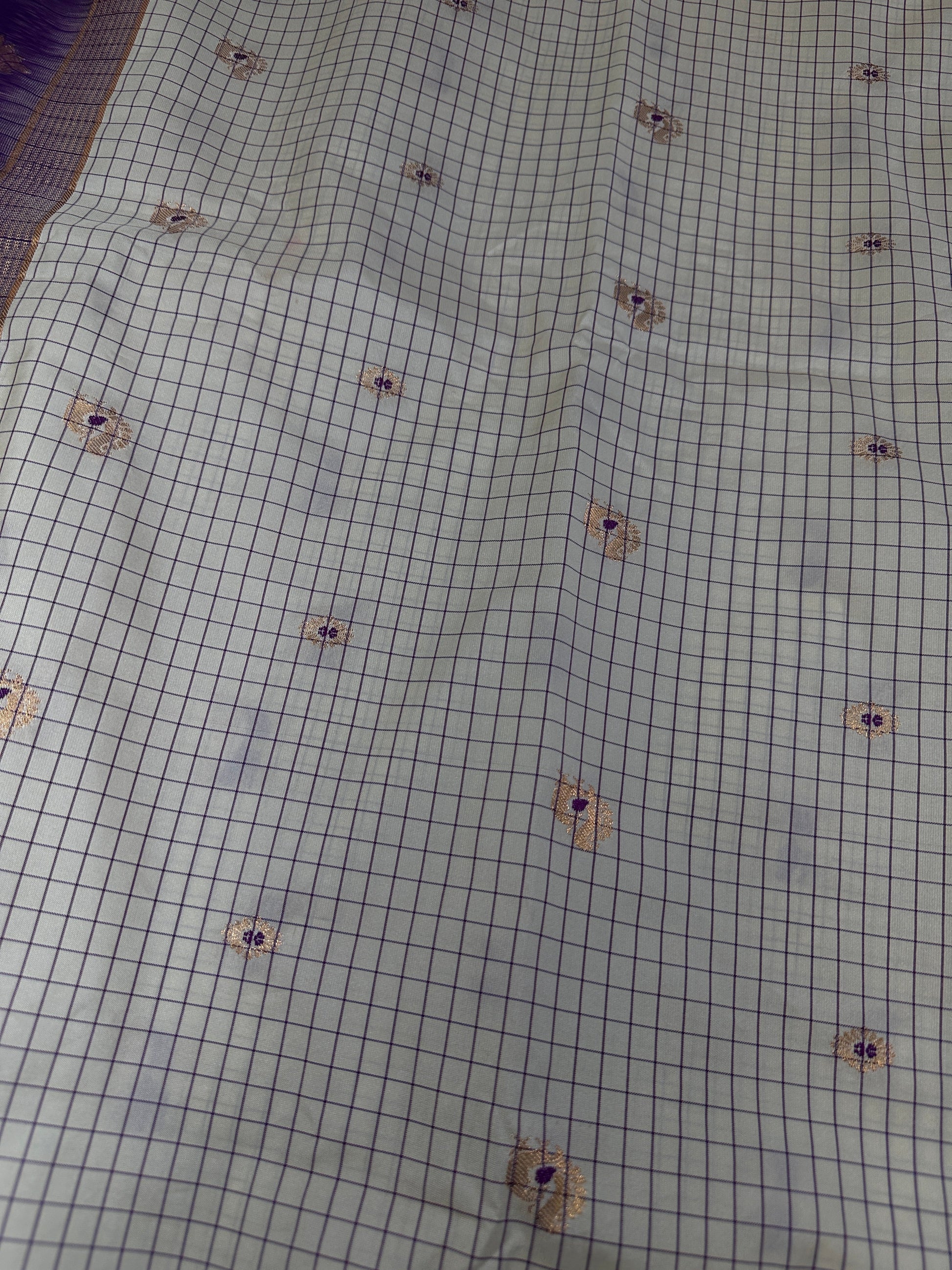 Gadwal Semi Silk Cream Purple Checks SareeSaree Details : Cream Color Saree Purple Pallu Fall and Pico doneBlouse Details : Purple Blouse Size 38 and has margin to go up to Size 46; Sleeves Length : 10 Inches: Blouse Length : 15 Inches; Front Neck : 7 Inches; Back Neck : 11 Inches Inches