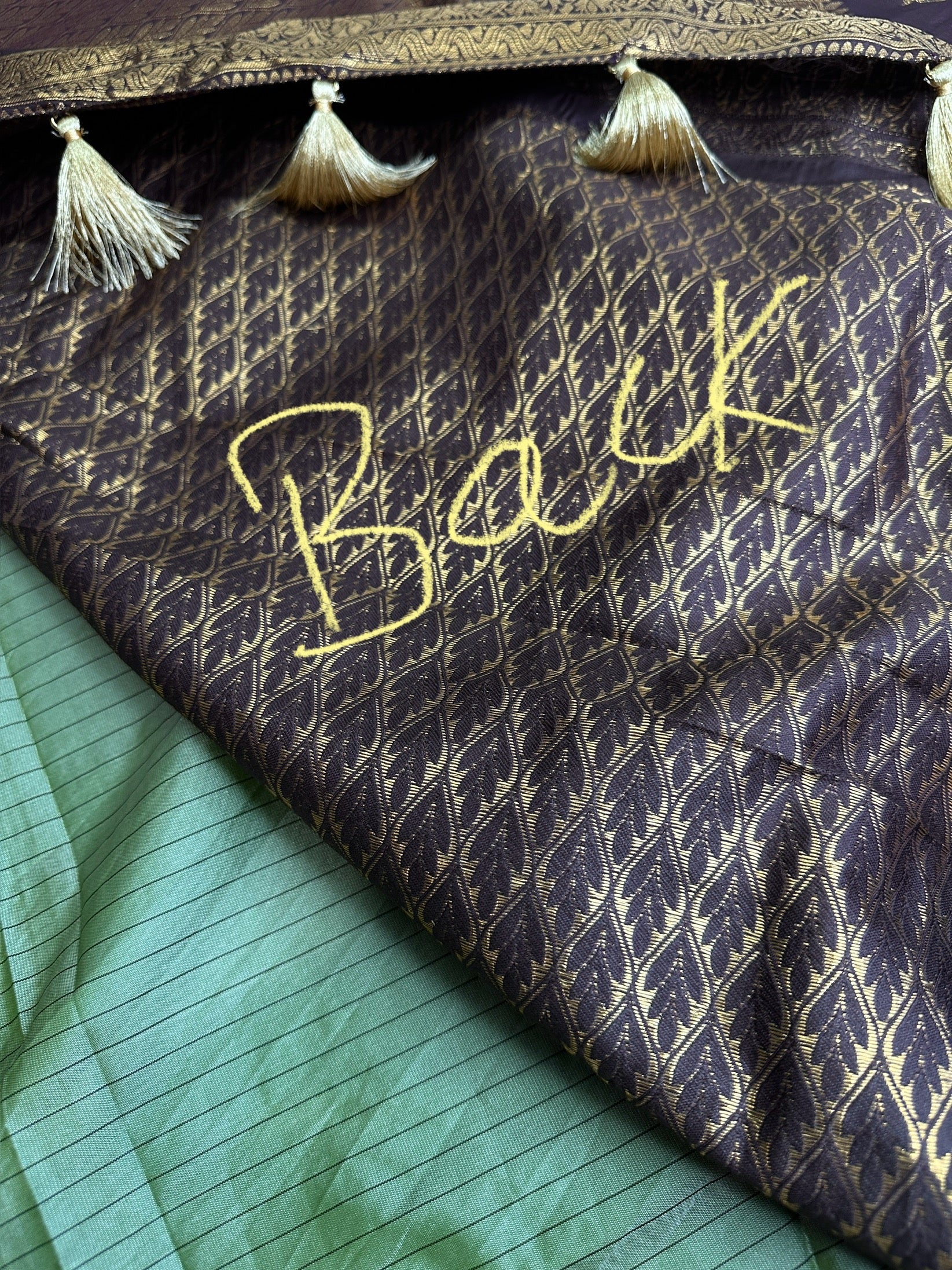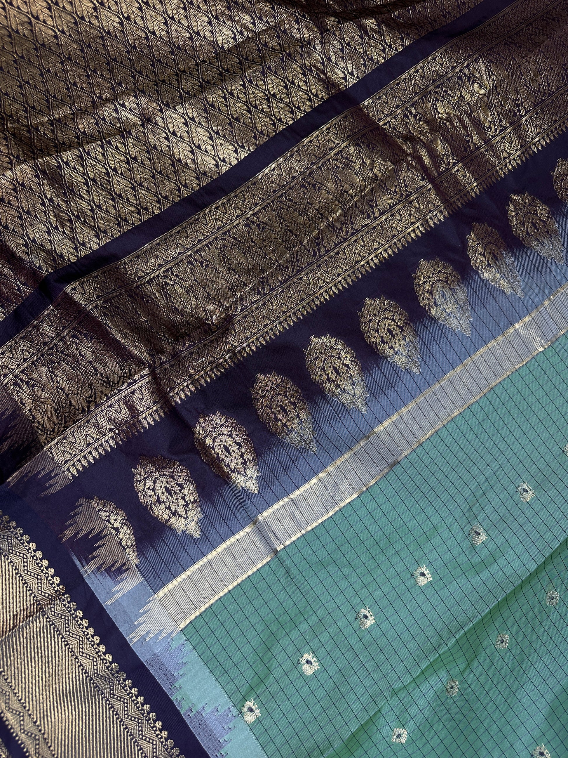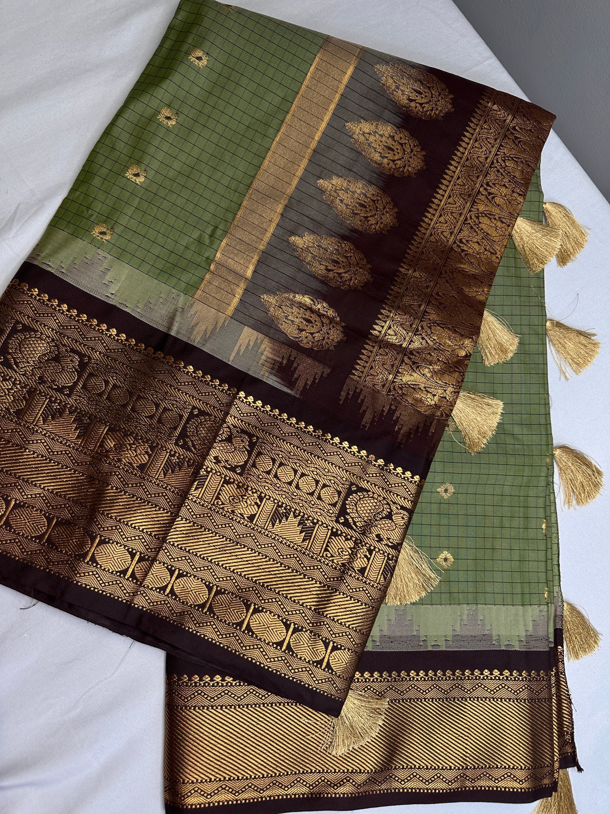 Gadwal Semi Silk Green Brown Checks Saree Saree Details : Green Color Saree Brown Pallu Fall and Pico done Blouse Details : Brown Blouse Size 38 and has margin to go up to Size 46; Sleeves Length : 10 Inches: Blouse Length : 15 Inches; Front Neck : 7 Inches; Back Neck : 11 Inches Inches