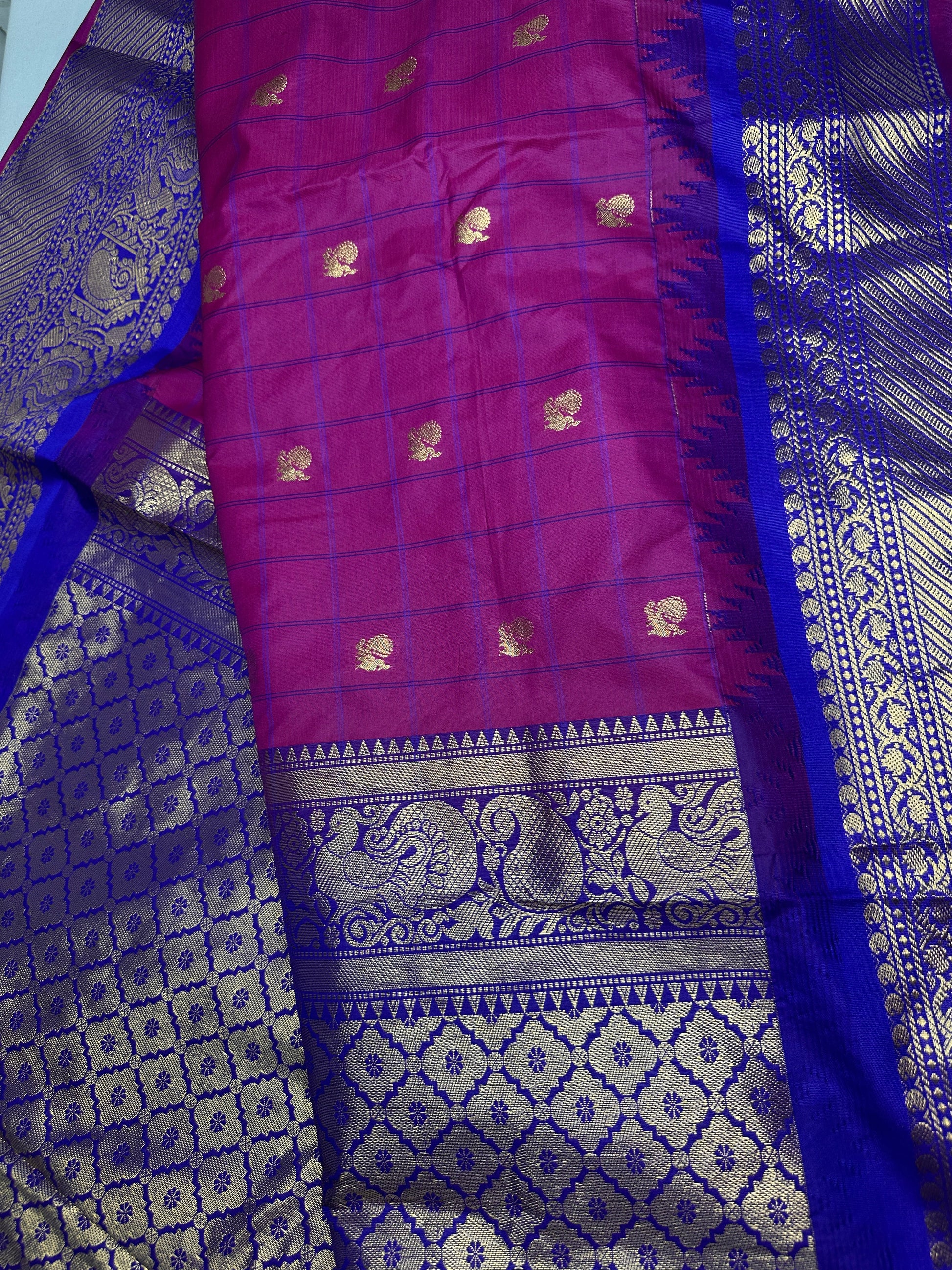 Gadwal Semi Silk Pink Blue Checks Saree Saree Details : Pink Color Saree Blue Pallu Fall and Pico done Blouse Details : Blue Blouse Size 38 and has margin to go up to Size 46; Sleeves Length : 10 Inches: Blouse Length : 15 Inches; Front Neck : 7 Inches; Back Neck : 11 Inches Inches
