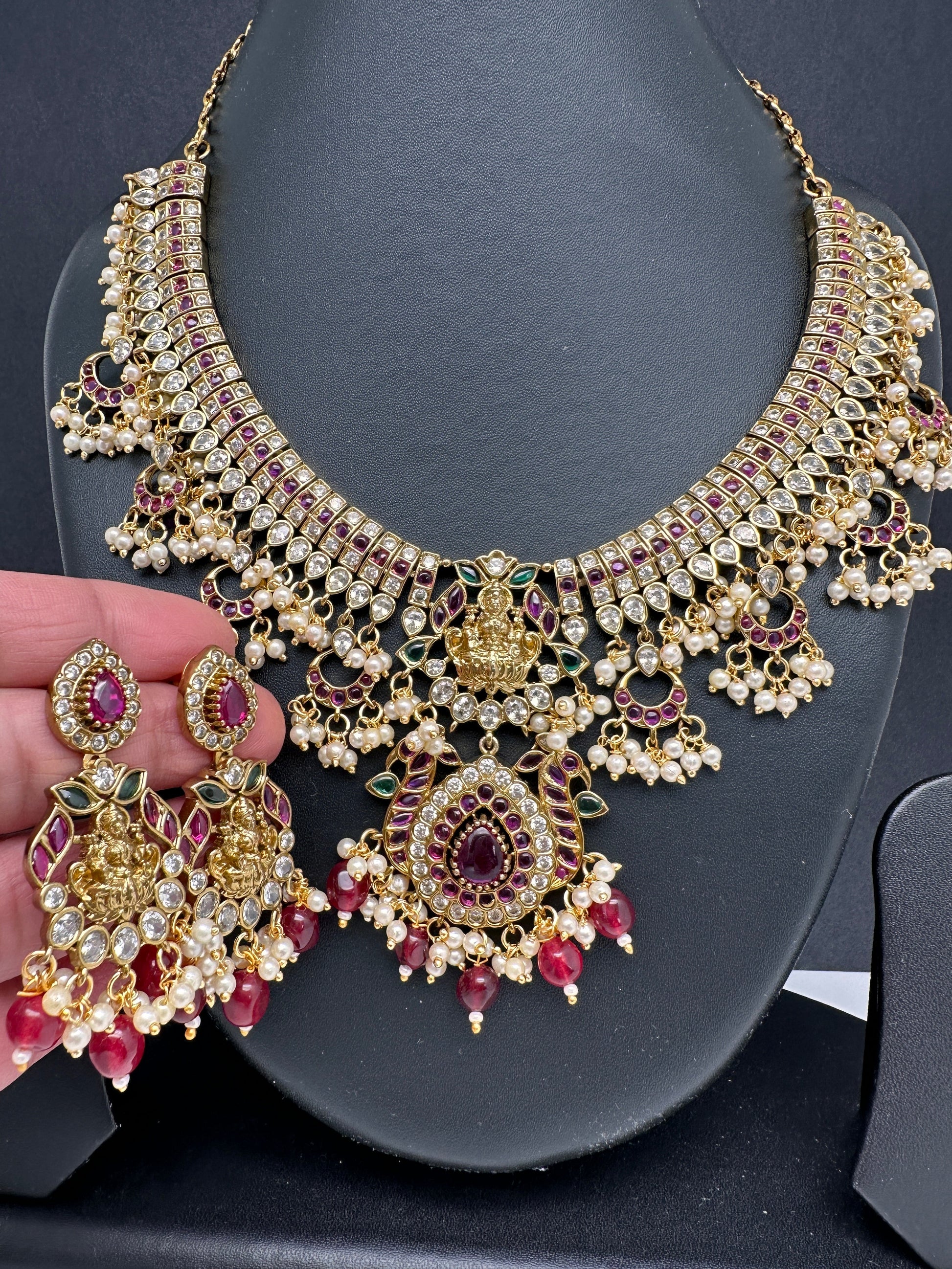 Goddess Lakshmi AD Red Kemp Red Beads Guttapusalu Necklace with Matching EarringsColor : Golden Premium MatteSize : Necklace Length : 16 Inches; Earring Length : 2.25 Inches ApproxStones : CZ Red Green Stone Red Beads Pearls