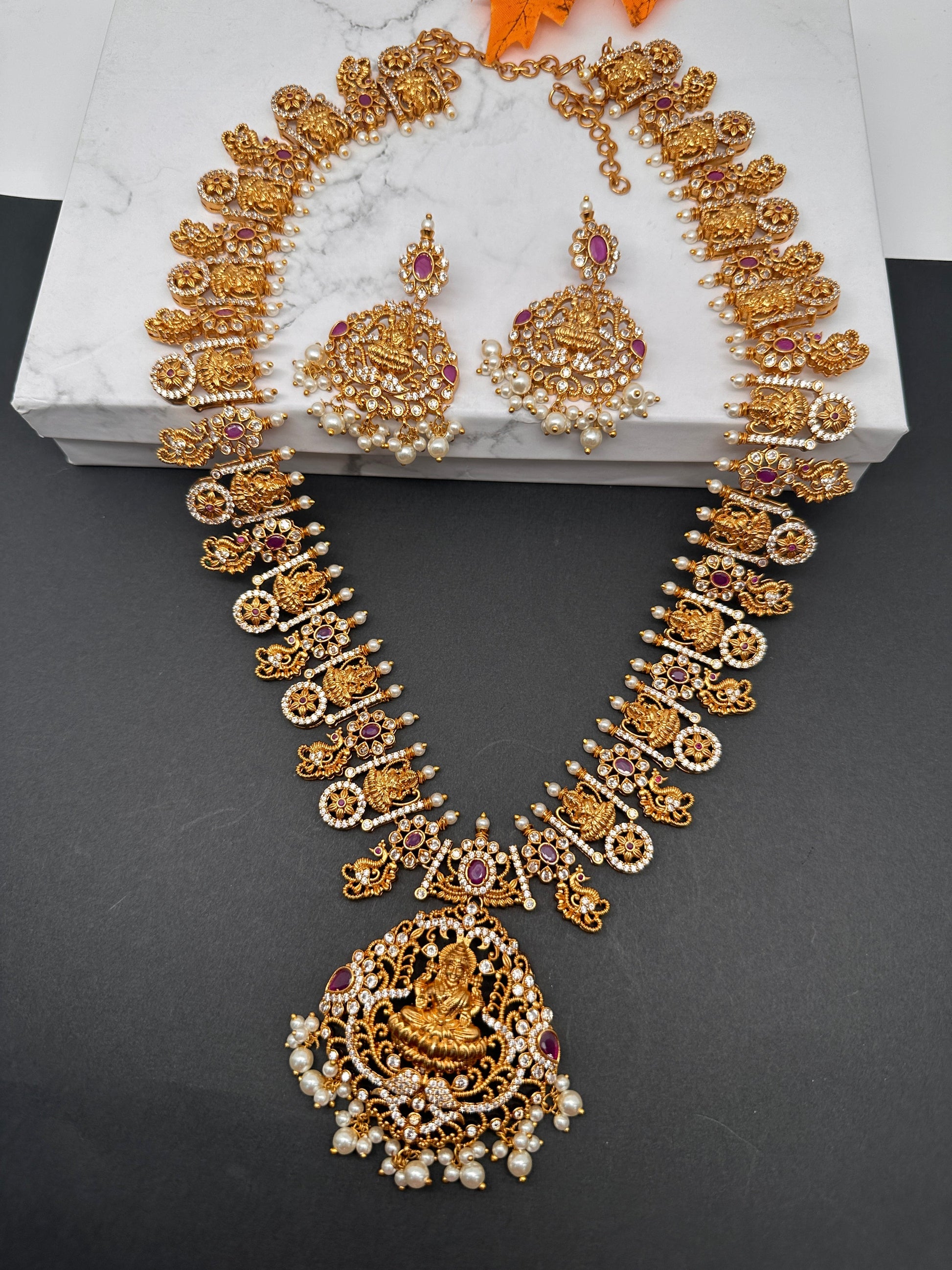 Goddess Lakshmi Botu Mala Long Necklace with matching screwback earringsColor : GoldenSize : Necklace Length : 24 Inches; Earring Length : Approx 2.5 inchesStones : Red Green Stone CZ Pearls