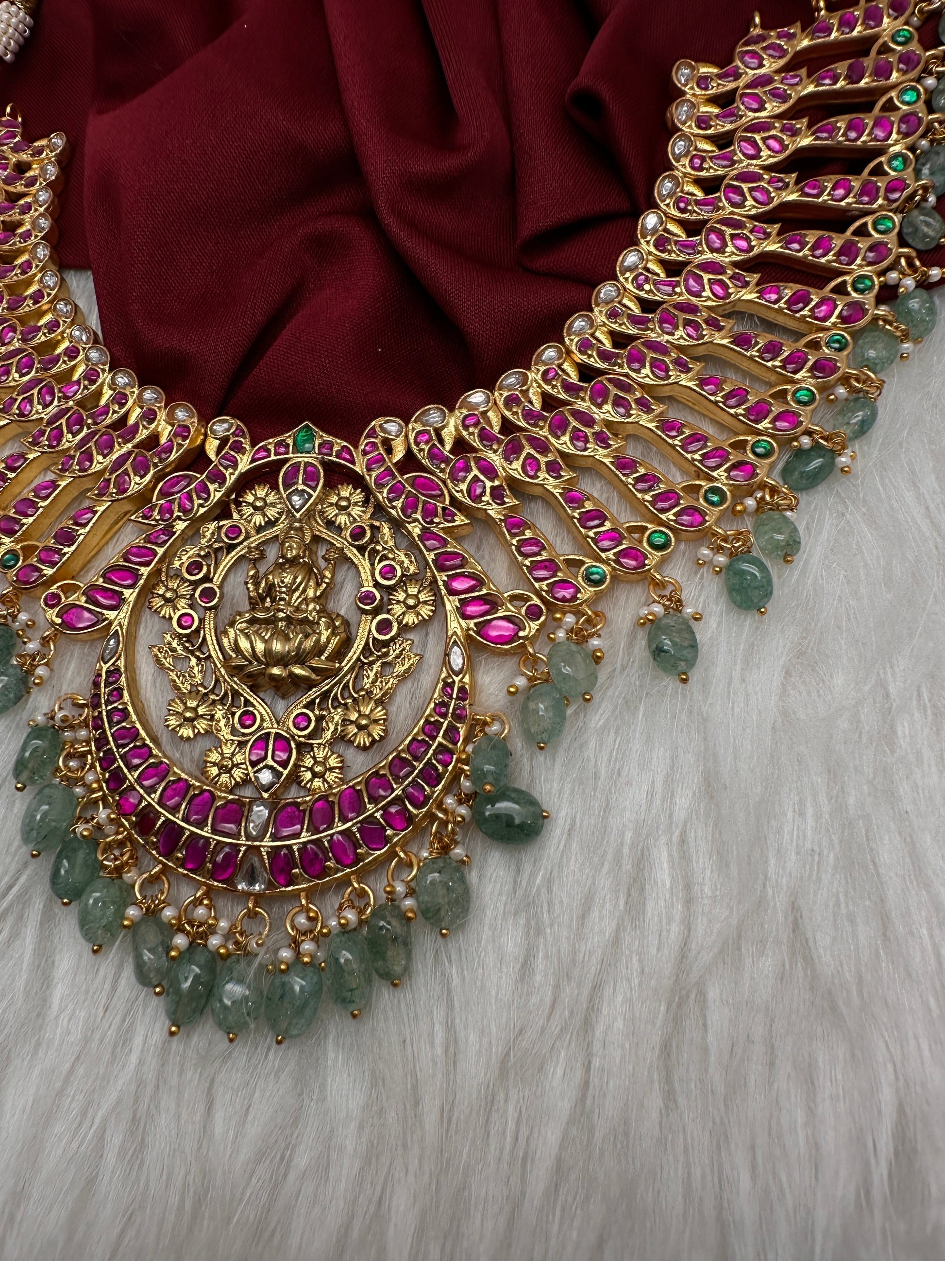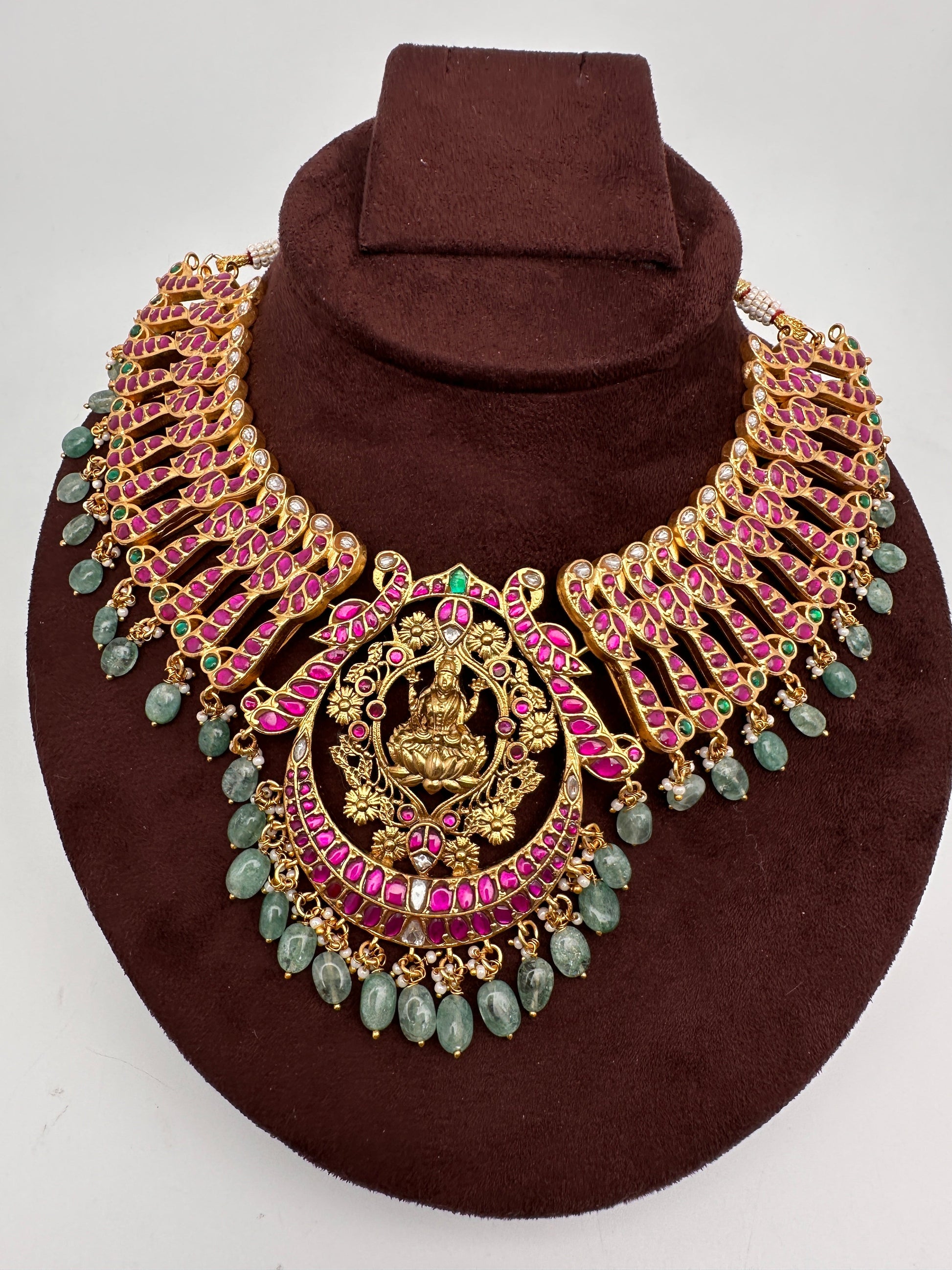 Goddess Lakshmi Broad Neckline Jadau Kundan Short Necklace Color : GoldenSize : Necklace Length : 16 Inches; No Earrings Stones : Red Green Clear Stones Coral Pearls