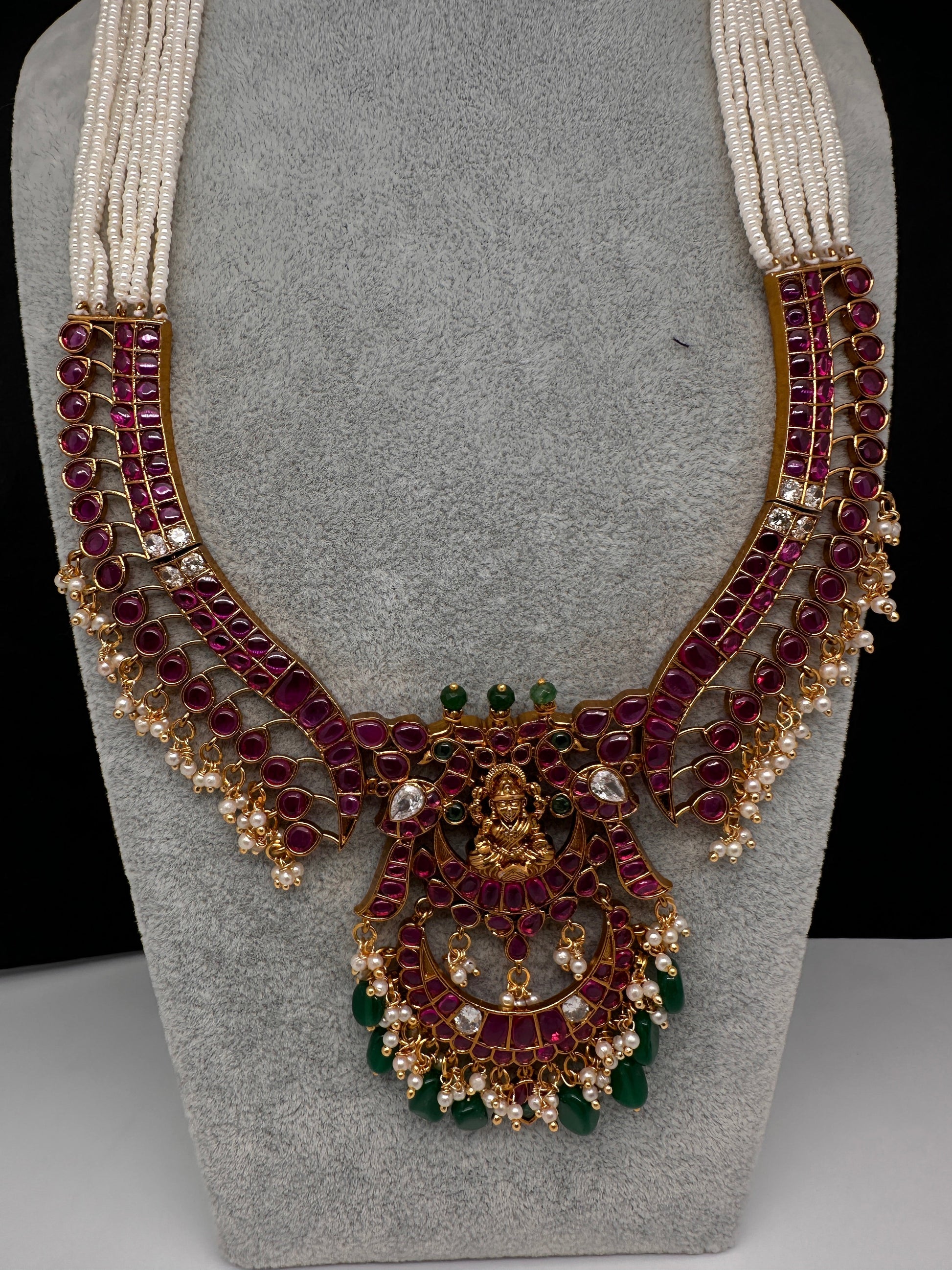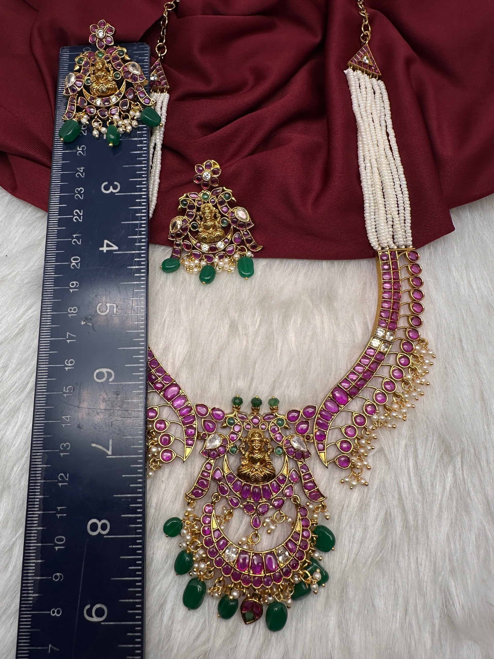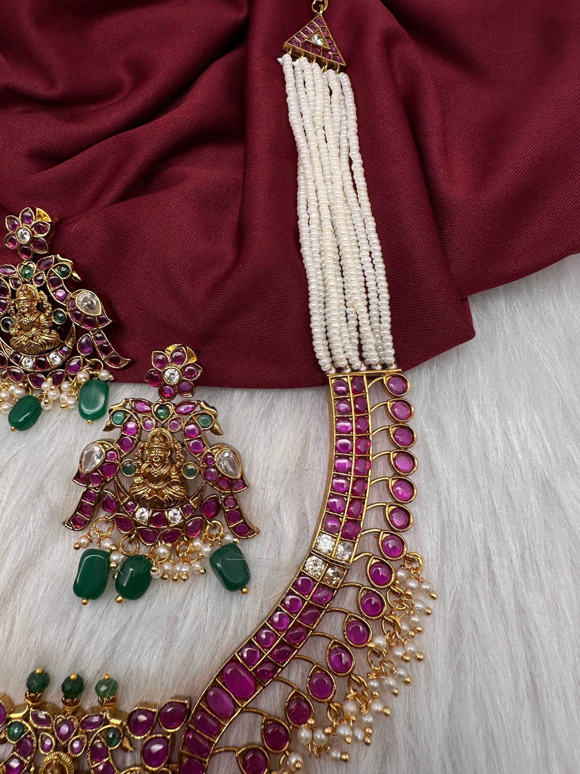 Goddess lakshmi Kemp Pearls Long Matte Necklace with matching earringsColor : MatteSize : Necklace Length : 20 Inches; Earring Length : 2.25 Inches Approx; Stones : Kemp CZ Pearls Green Beads