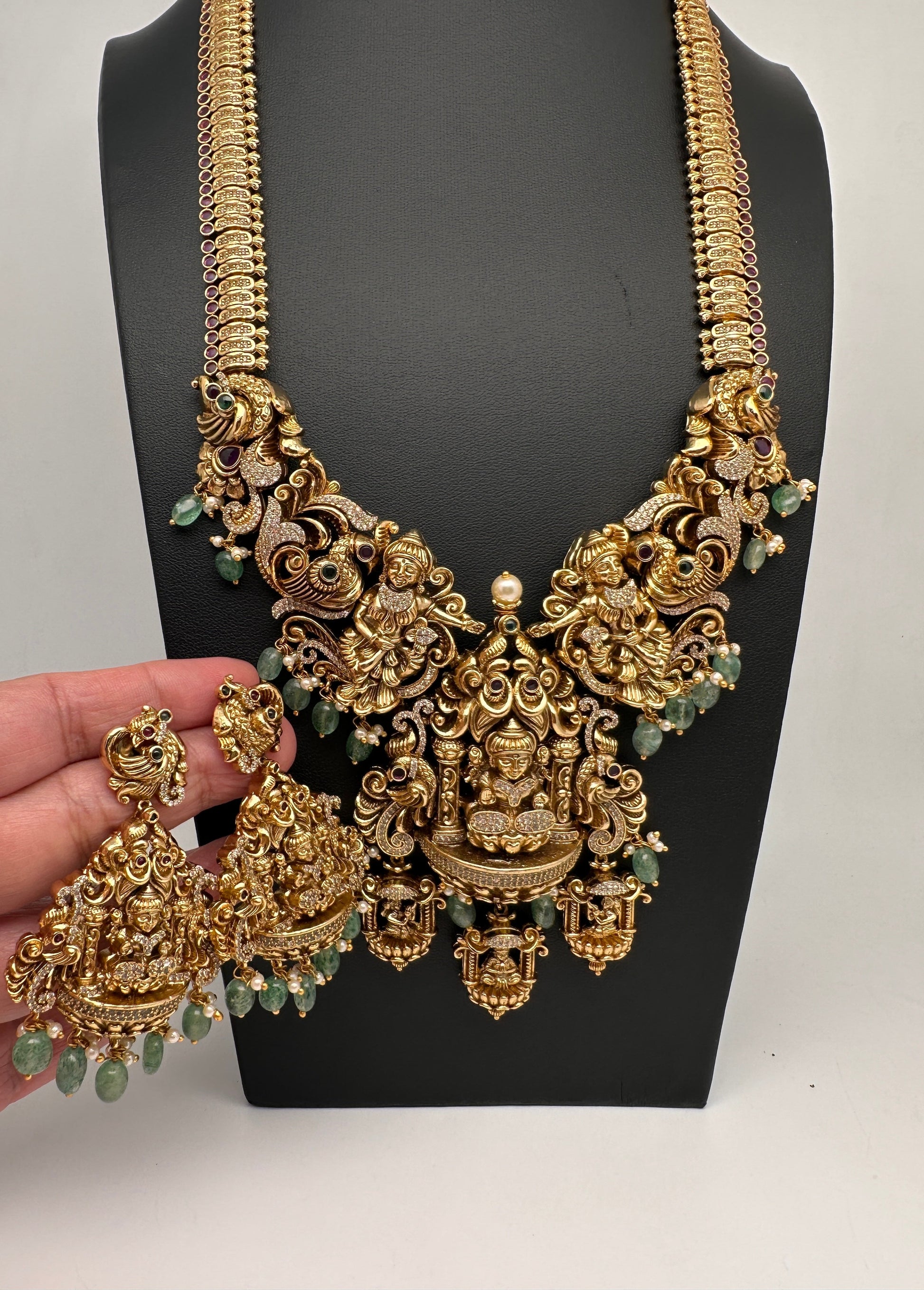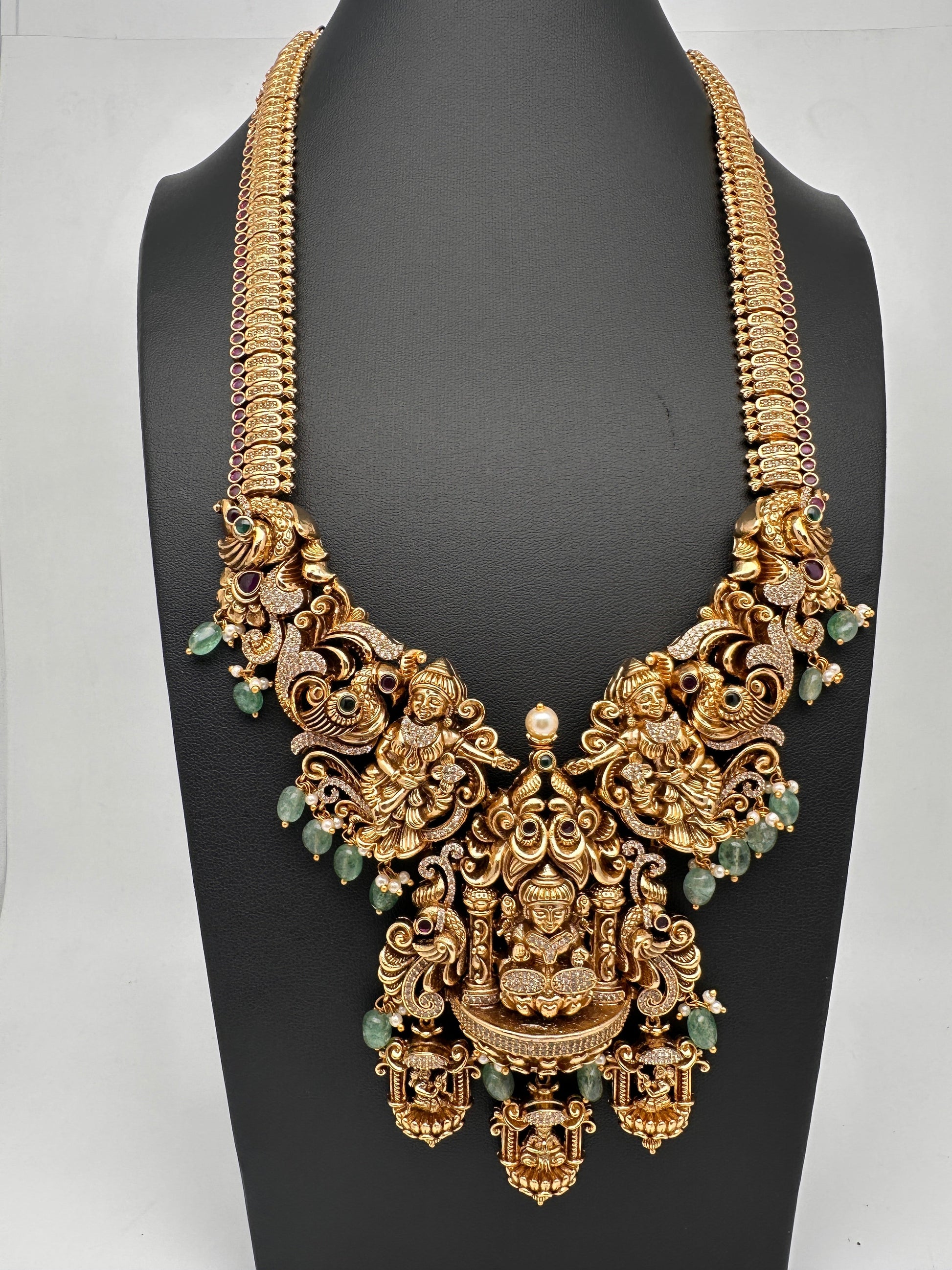 Goddess Lakshmi One Gram Gold Platted Nakshi Long Necklace with Matching EarringColor : GoldenSize : Necklace Length :24 Inches;; Earring Length : 3 Inches; Stones : Red Green Stone Green Beads CZ Pearls