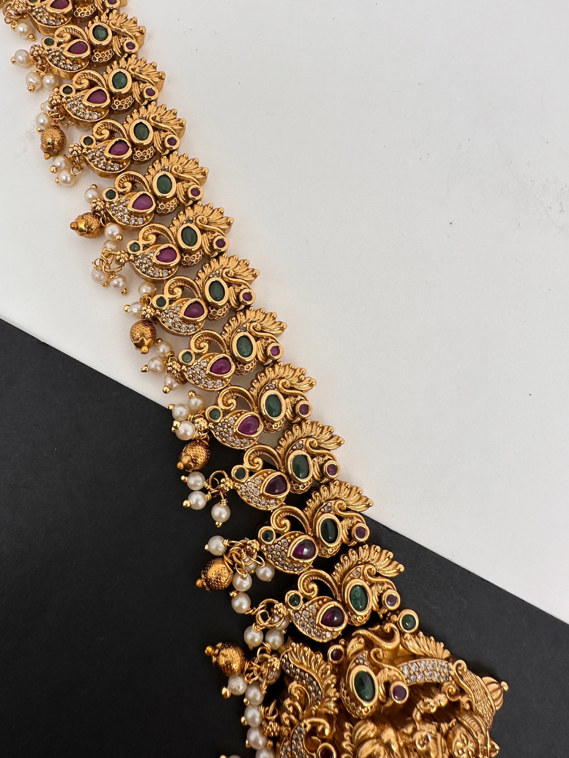 Goddess Lakshmi Peacock Nakshi Antique Matte Finish Hip Belt Kamarbandh long around waist adjustable waist chainColor : MatteSize : Maximum Length : 41 Inches; Minimum Length : 35 Inches; Front Design Length : 12 InchesStones : Red Green Stone CZ