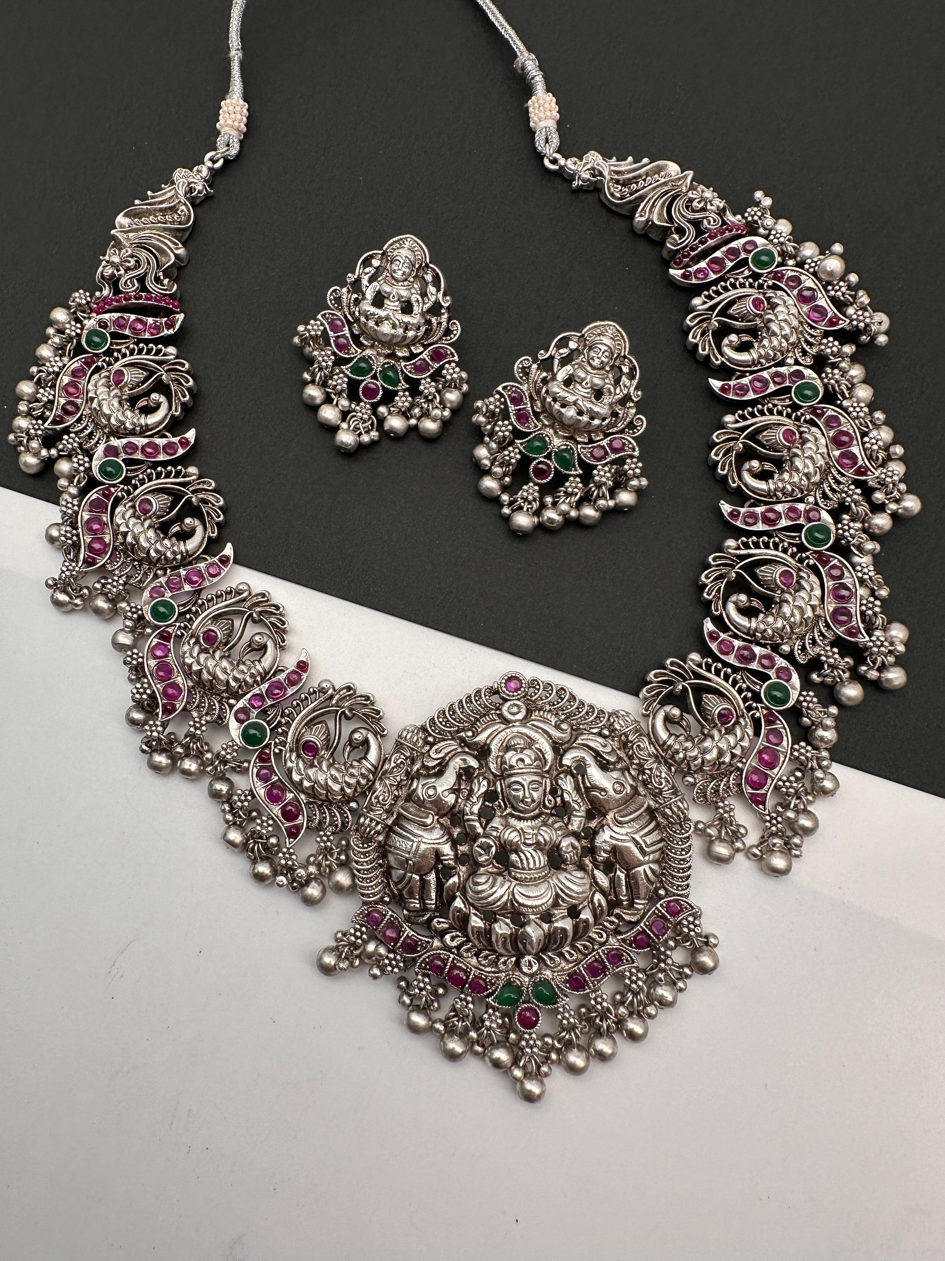 Goddess Lakshmi Peacock Pattern Silver Replica Short Necklace with matching earringsColor : SilverSize : Necklace Length : Approx 16 Inches; Earrings Length : 1.5 InchesStones : Red Green Stone