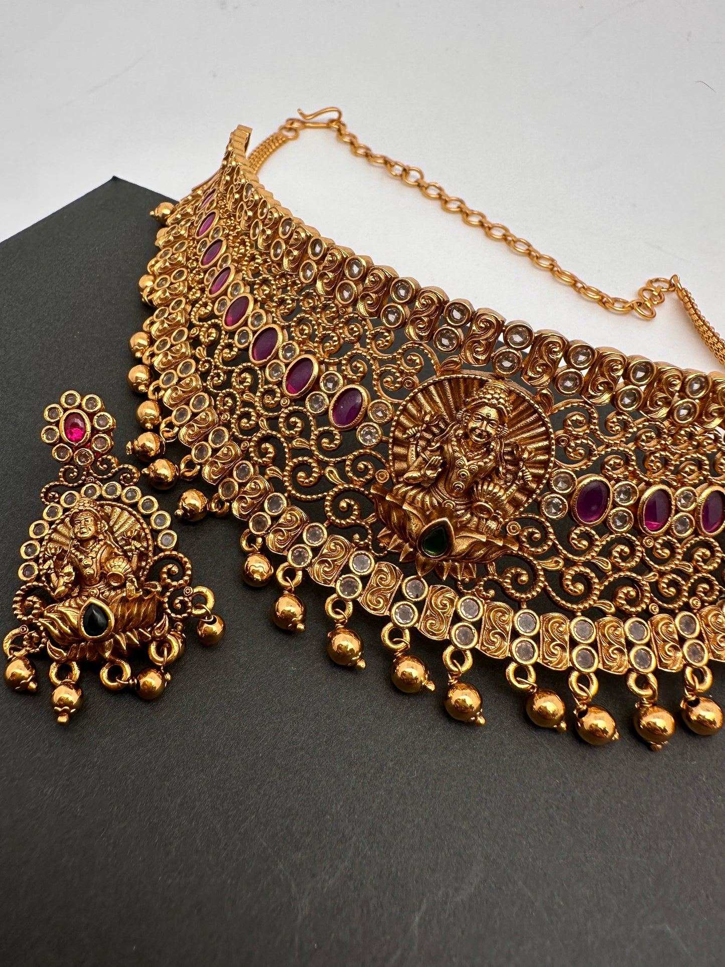 Goddess Lakshmi Premium Matte Finish CZ Red Kemp Stone Nakshi Choker with matching earringsColor : Matte GoldenSize : Earrings Length : 2 InchesStones : CZ Red Green Stone