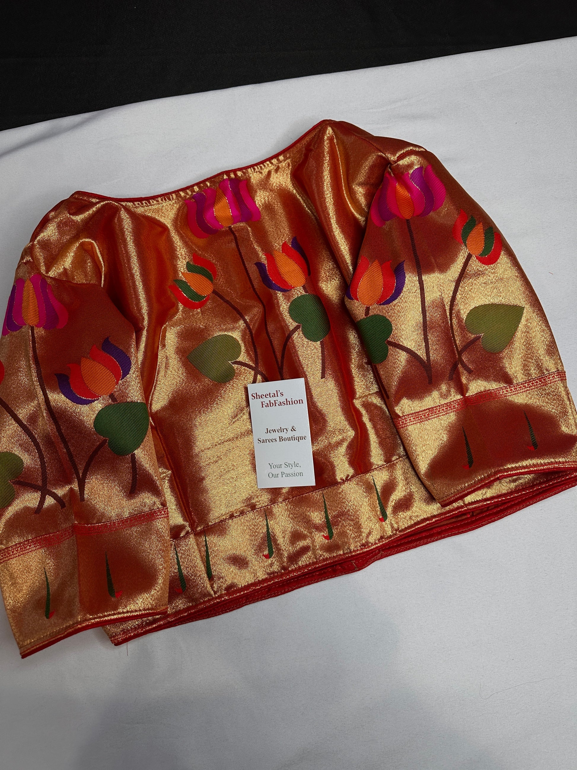 Blouse Details : Blouse Color : Orangish Red; Blouse stitched Size 42 and has margin to go upto size 48, Sleeves Length : 10.5 Inches, Blouse Length 15 Inches, FrontNeck : 4 Inches and Back Neck : High Neck
