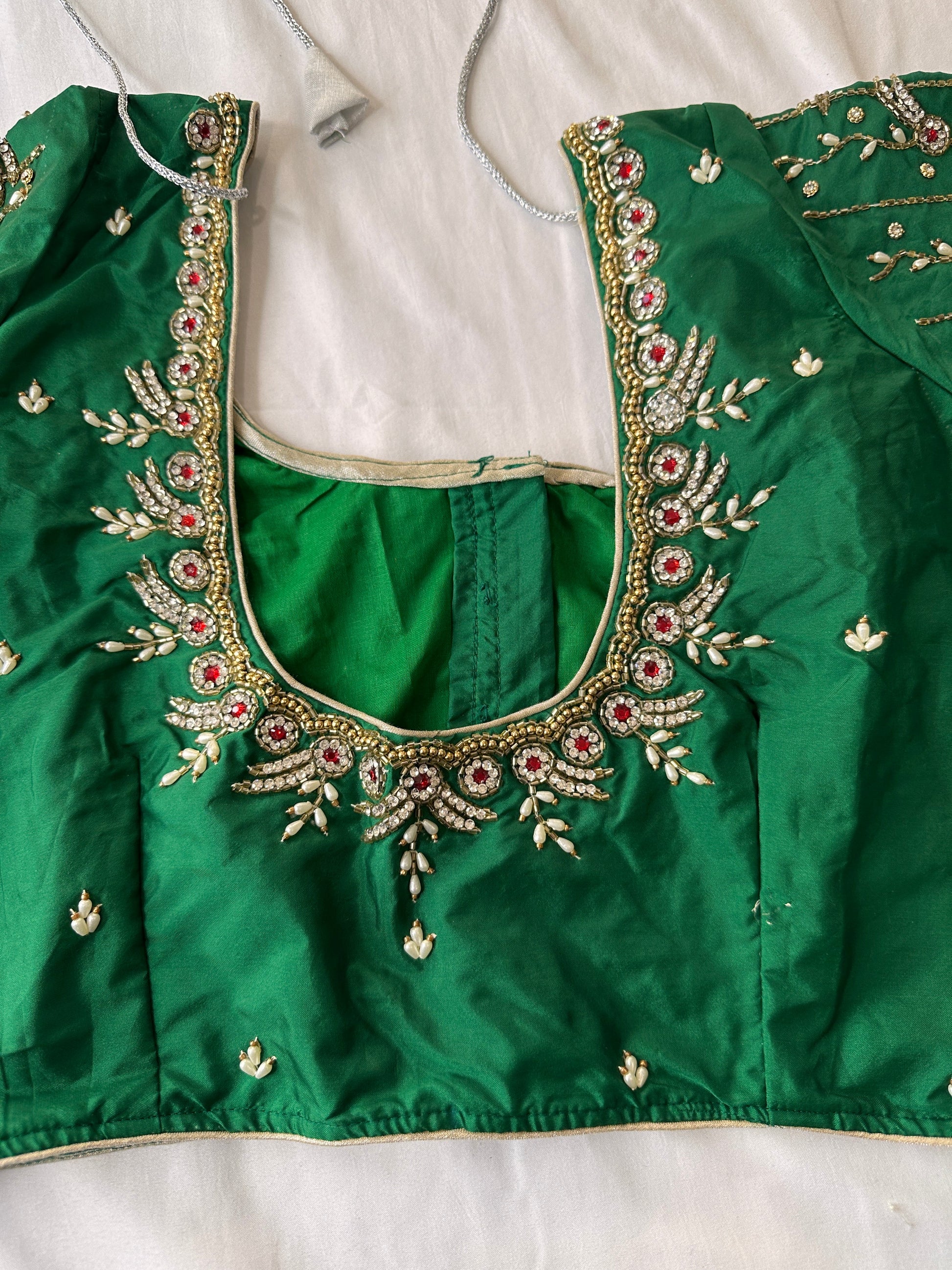 Green Maggam aari Silk Blouse workBlouse Details : Blouse Color : Marron Red; Blouse stitched Size 38 and can be altered from 36 to 44, Sleeves Length : 10 Inches, blouse Length 15 Inches, FrontNeck : 7 Inches and Back Neck : 10 Inches;