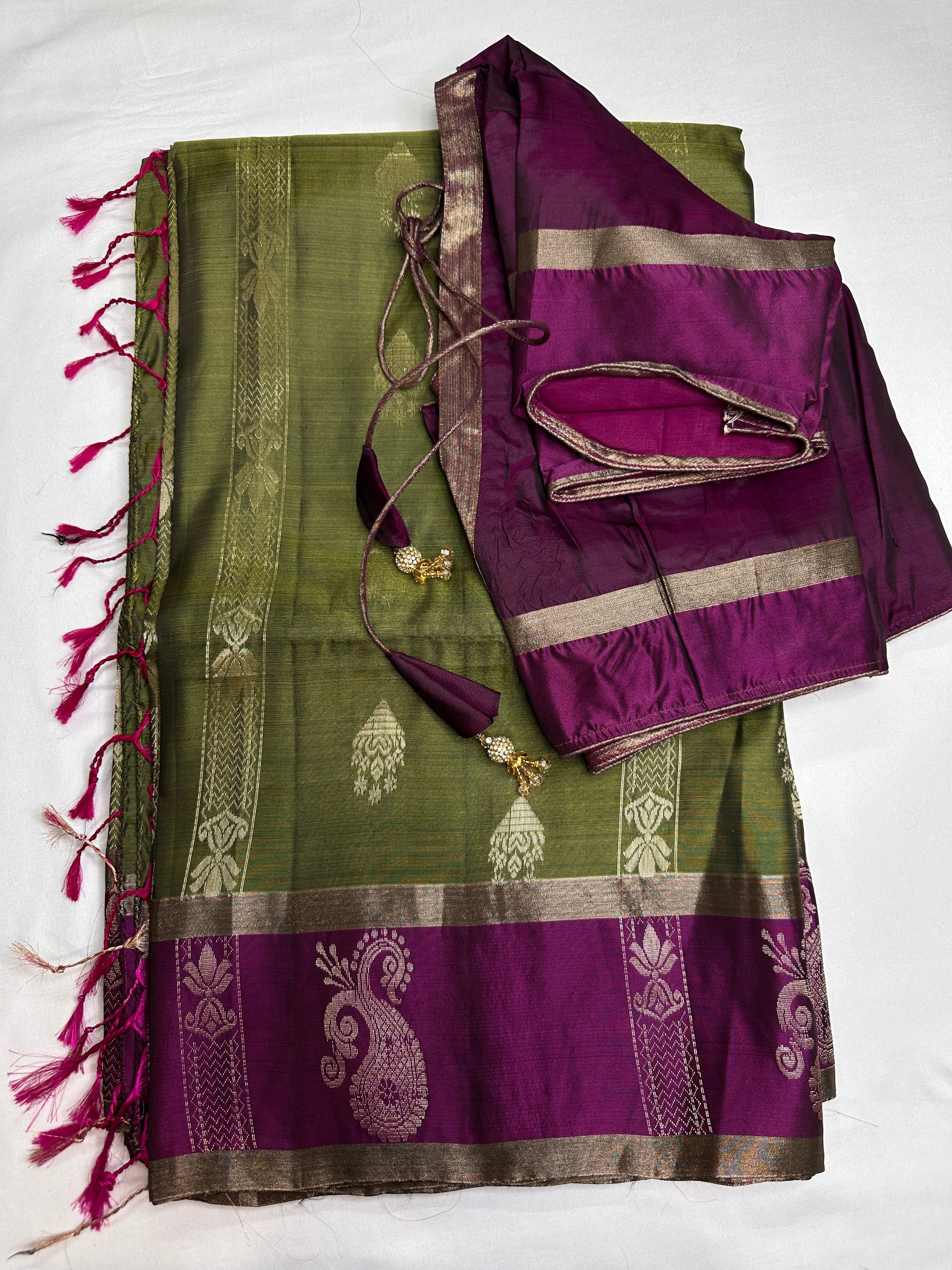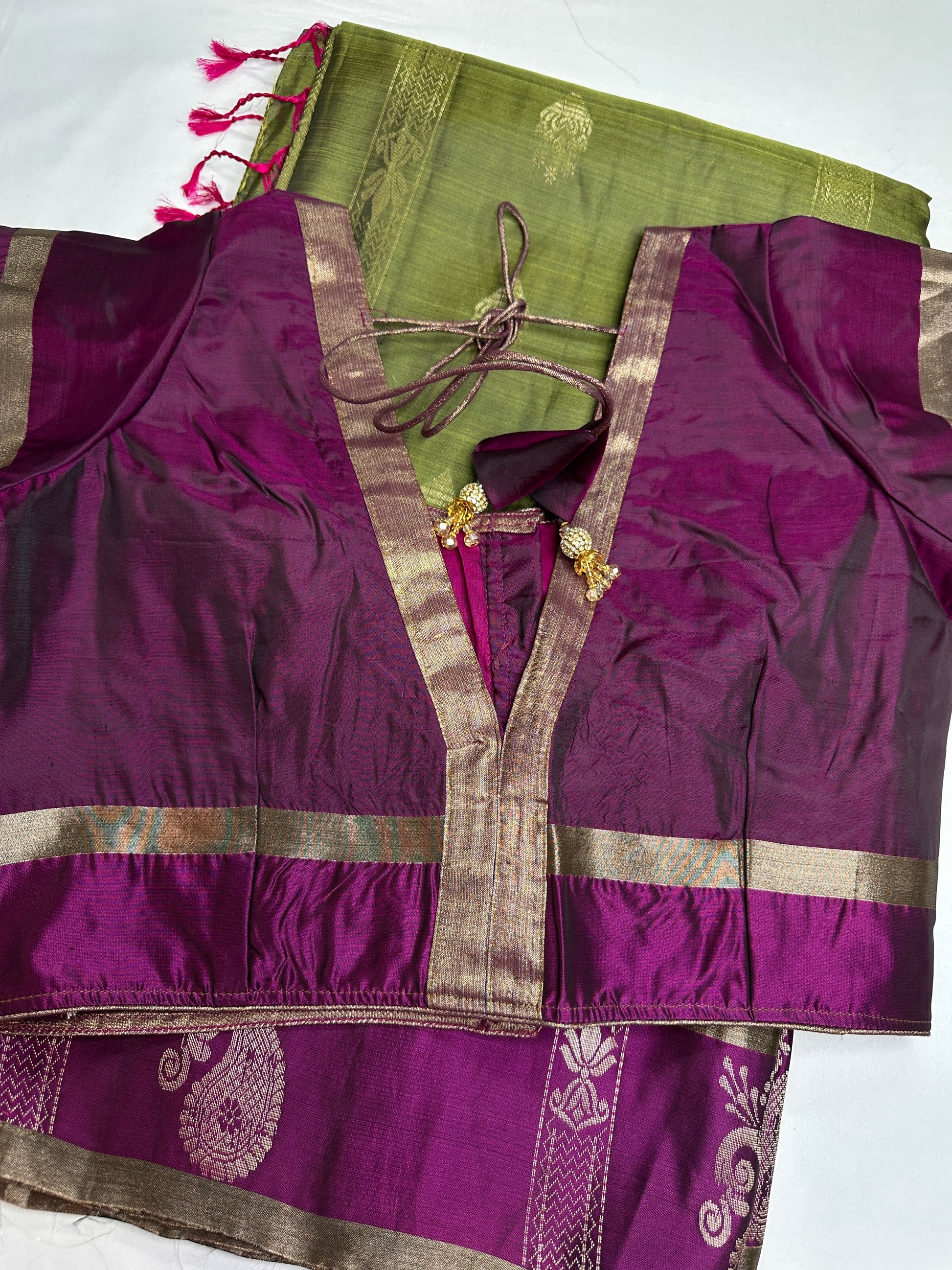 Green Purple Light Weight Kanchi Soft Silk Saree Saree Details : Green Color Saree Purple Pallu Fall and Pico done Blouse Details : Purple Blouse Size 38 and has margin to go up to Size 44; Sleeves Length : 8 Inches: Blouse Length : 15 Inches; Front Neck : 7 Inches; Back Neck : 10 Inches