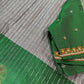 Grey Pure Kanchi Pattu Saree Saree Details : Grey Color Saree and Green Pallu with Fall and Pico done Blouse Details : Green Maggam work Blouse Size 38 and has margin to go up t0 Size 44; Sleeves Length : 10 Inches: Blouse Length : 15 Inches; Front Neck : 7 Inches; 8.5 Inches;