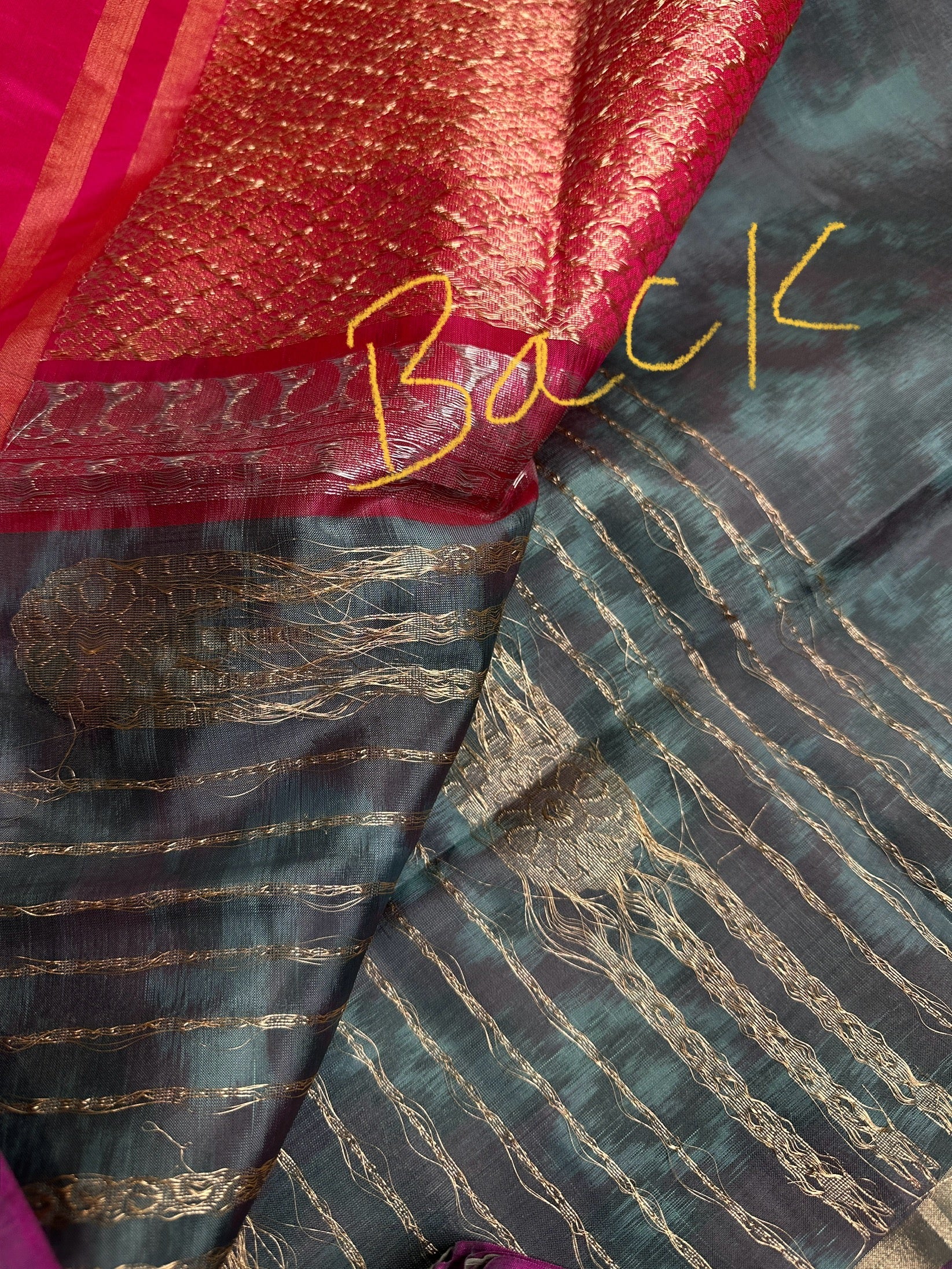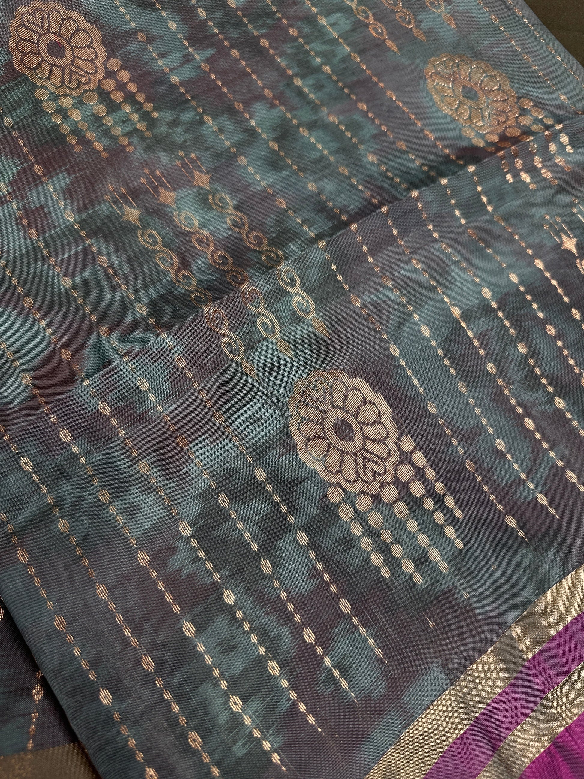 Greyish Blue Pink Uppada light Weight Silk Saree Saree Details : Blue Color Saree with Pink Pallu Fall and Pico done Blouse Details : Pink Blouse Size 40 and has margin to go up to Size 46; Sleeves Length : 7 Inches: Blouse Length : 15 Inches; Front Neck : 6 Inches; Back Neck : 10 Inches