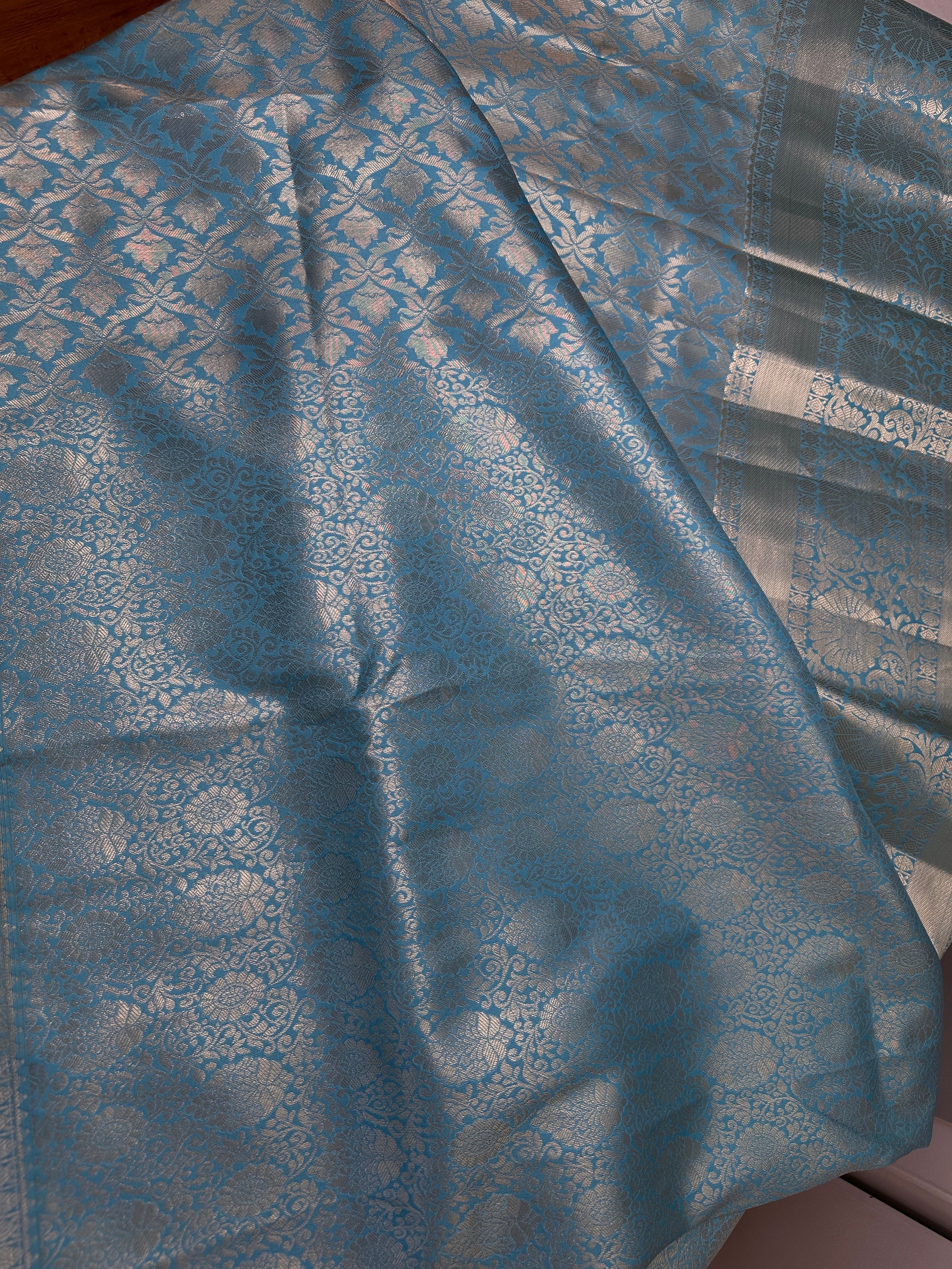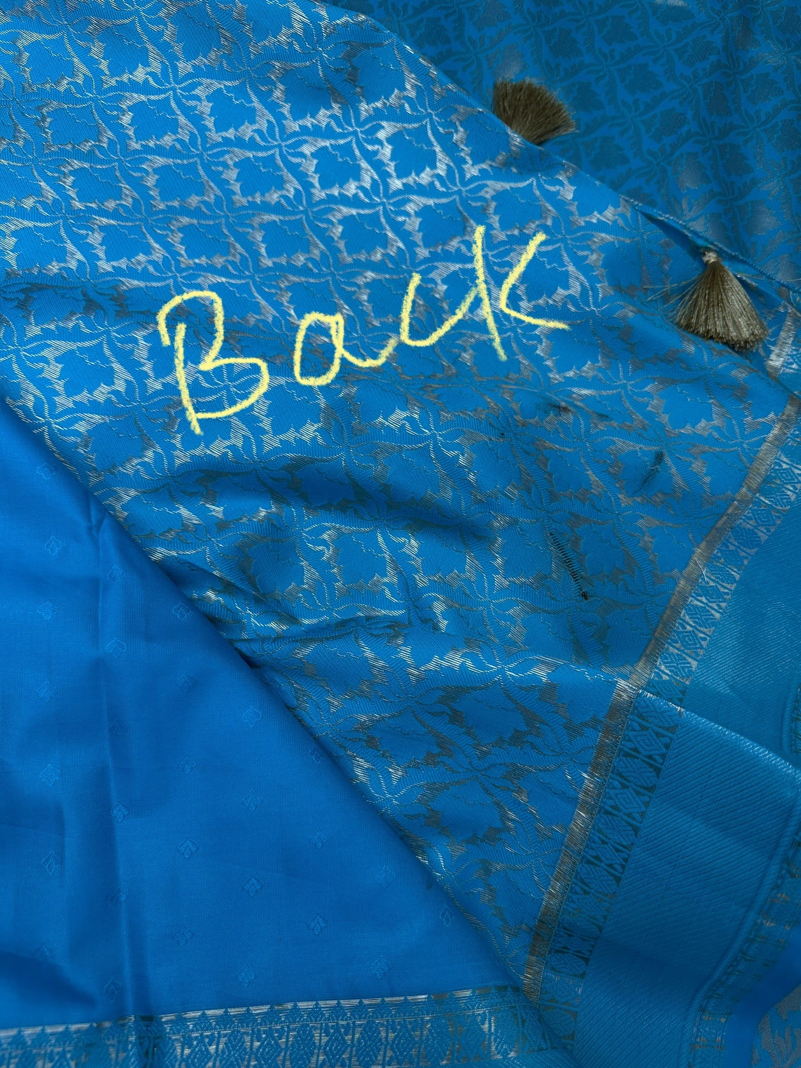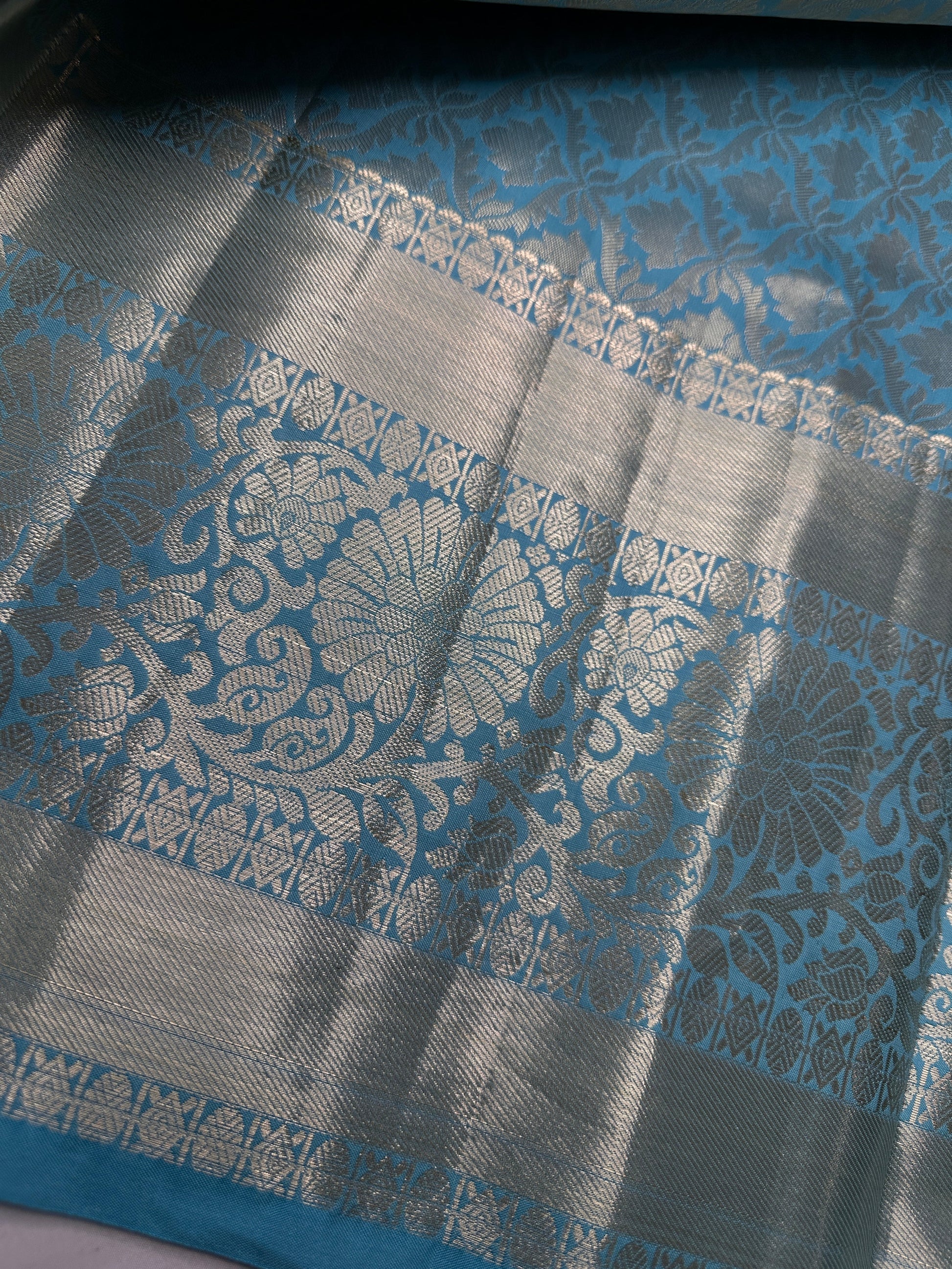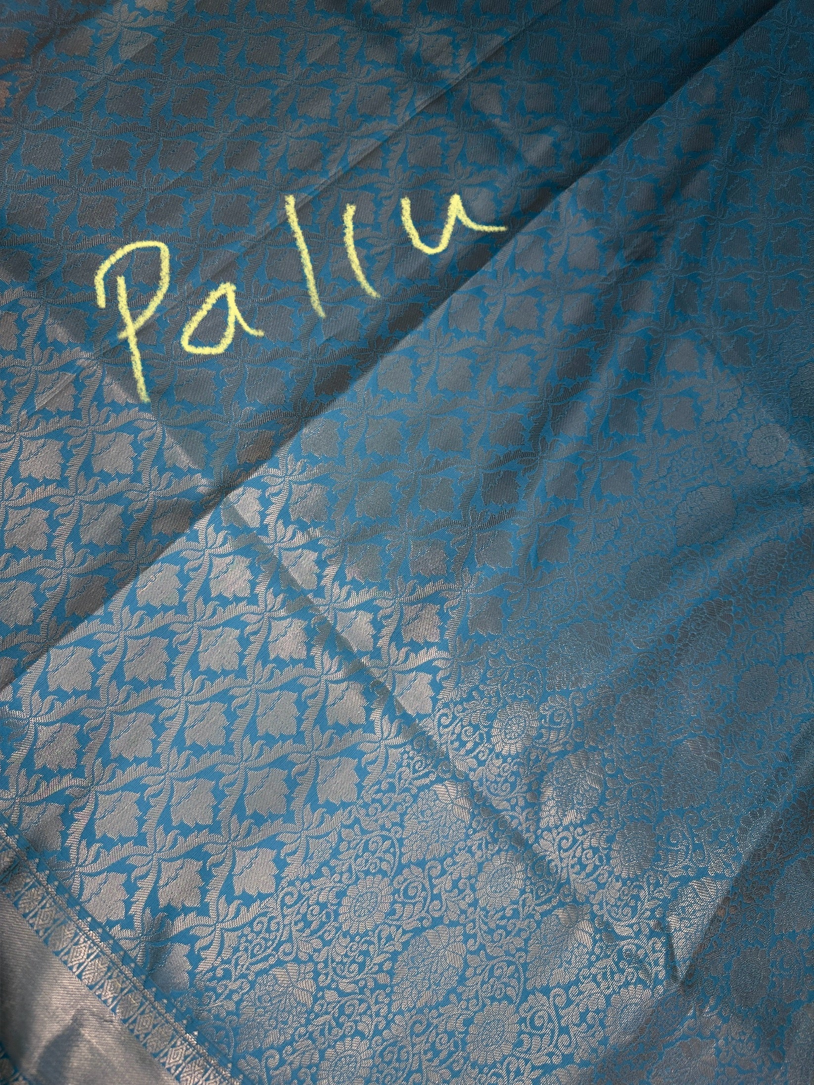 Kanchi Pattu Light Weight Soft Semi Silk Saree Saree Details : Blue Color Saree with Zari Weaving Fall and Pico done Blouse Details : Blue Blouse Size 38 and has margin to go up to Size 46; Sleeves Length : 9.5 Inches: Blouse Length : 15 Inches; Front Neck : 8 Inches; Back Neck : 10 Inches Inches
