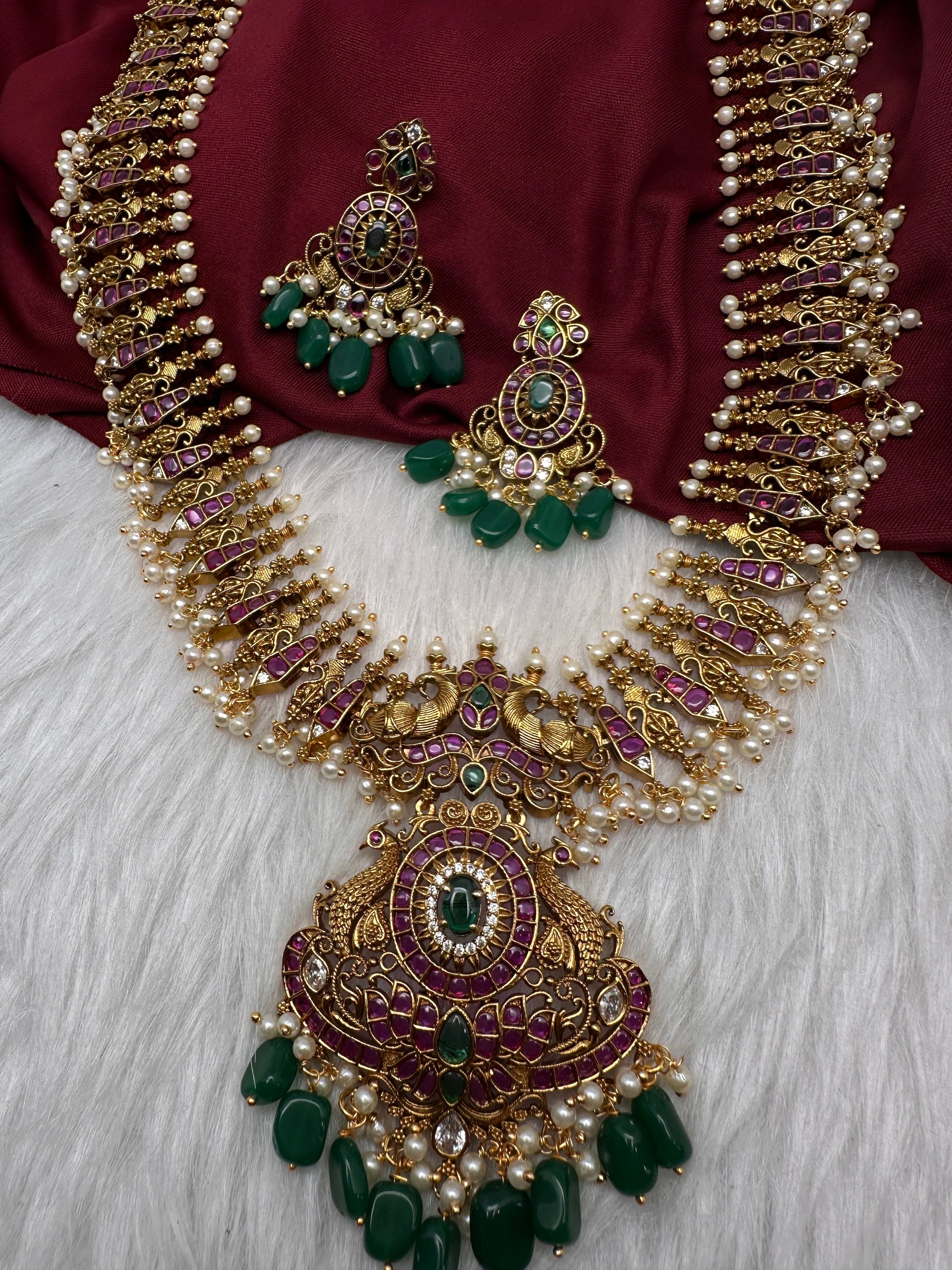 Kemp Long Haram Guttapusalu Traditonal Necklace with matching earringsColor : GoldSize : Necklace Length : 24 Inches; Earring Length : 2 Inches ApproxStones : Red Kemp Green Beads Pearls