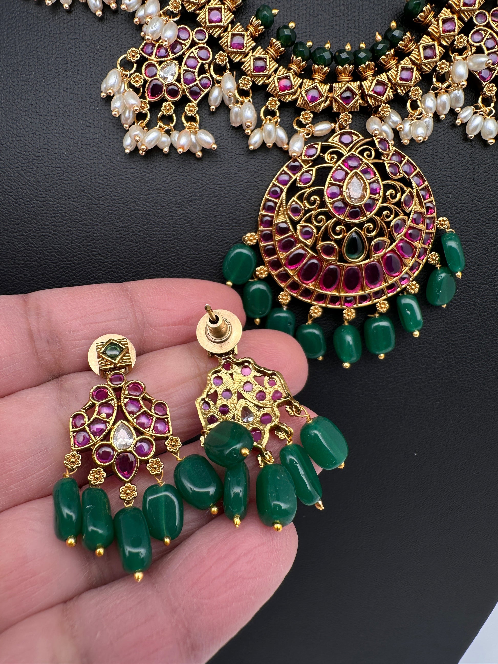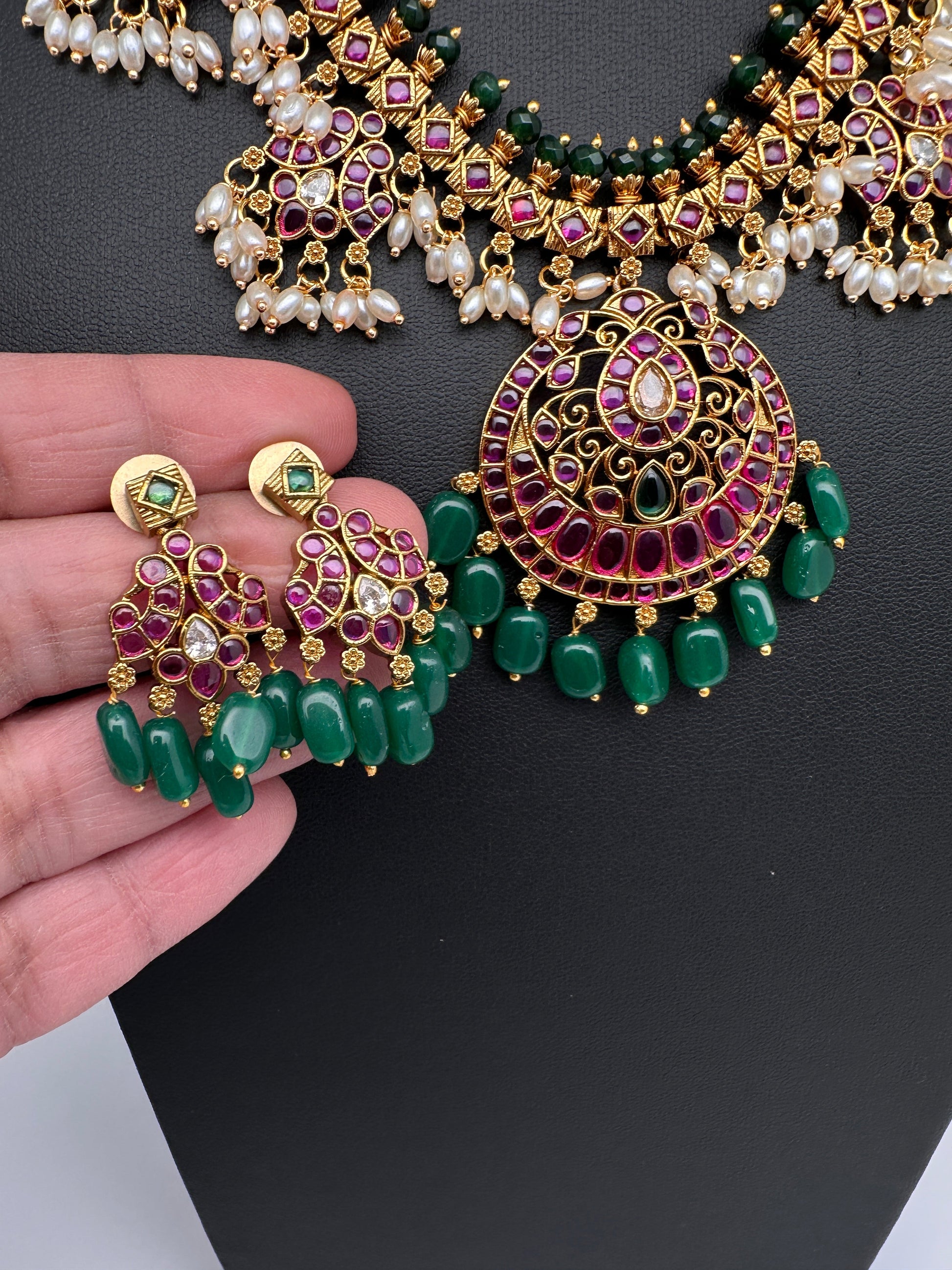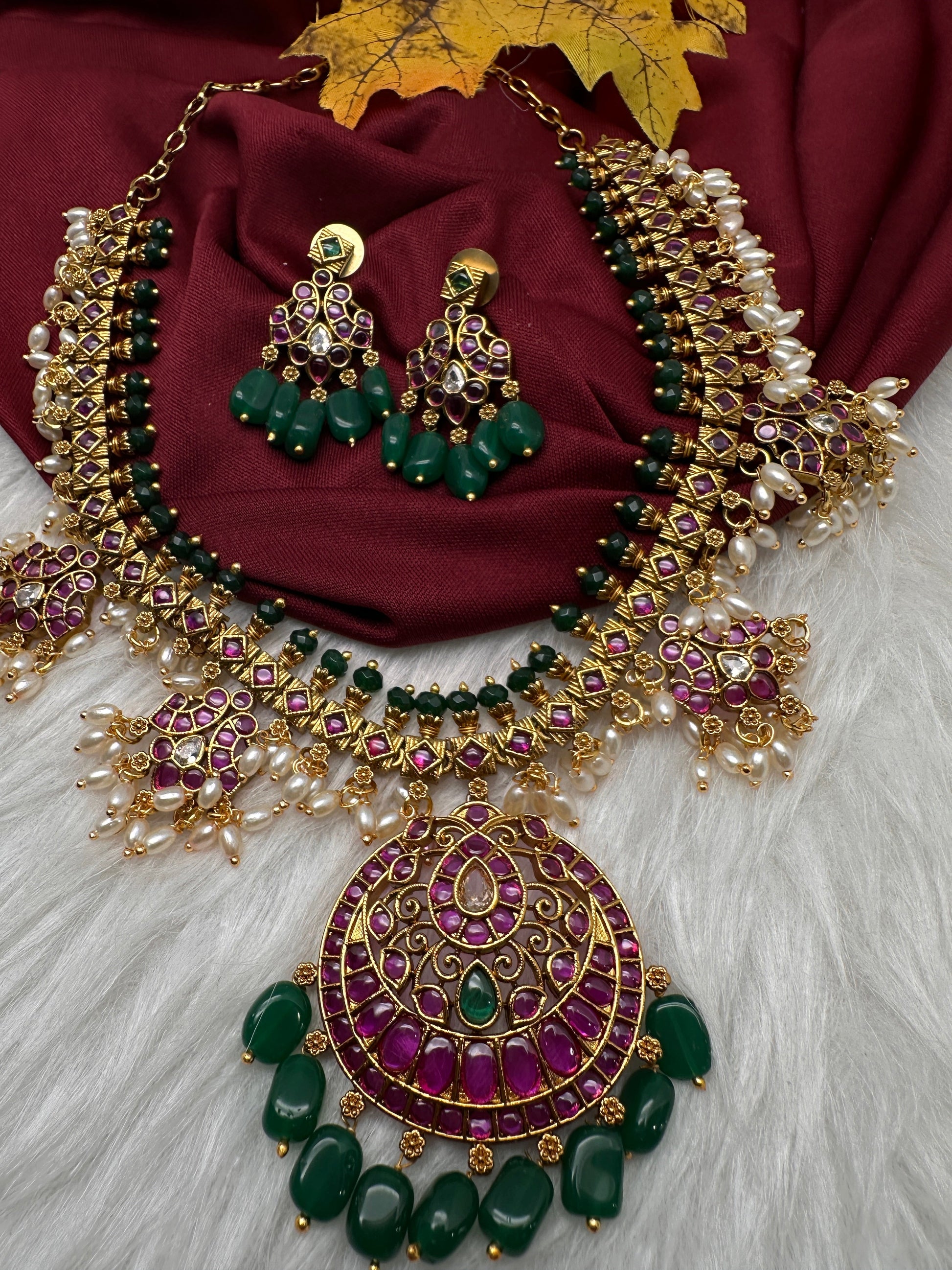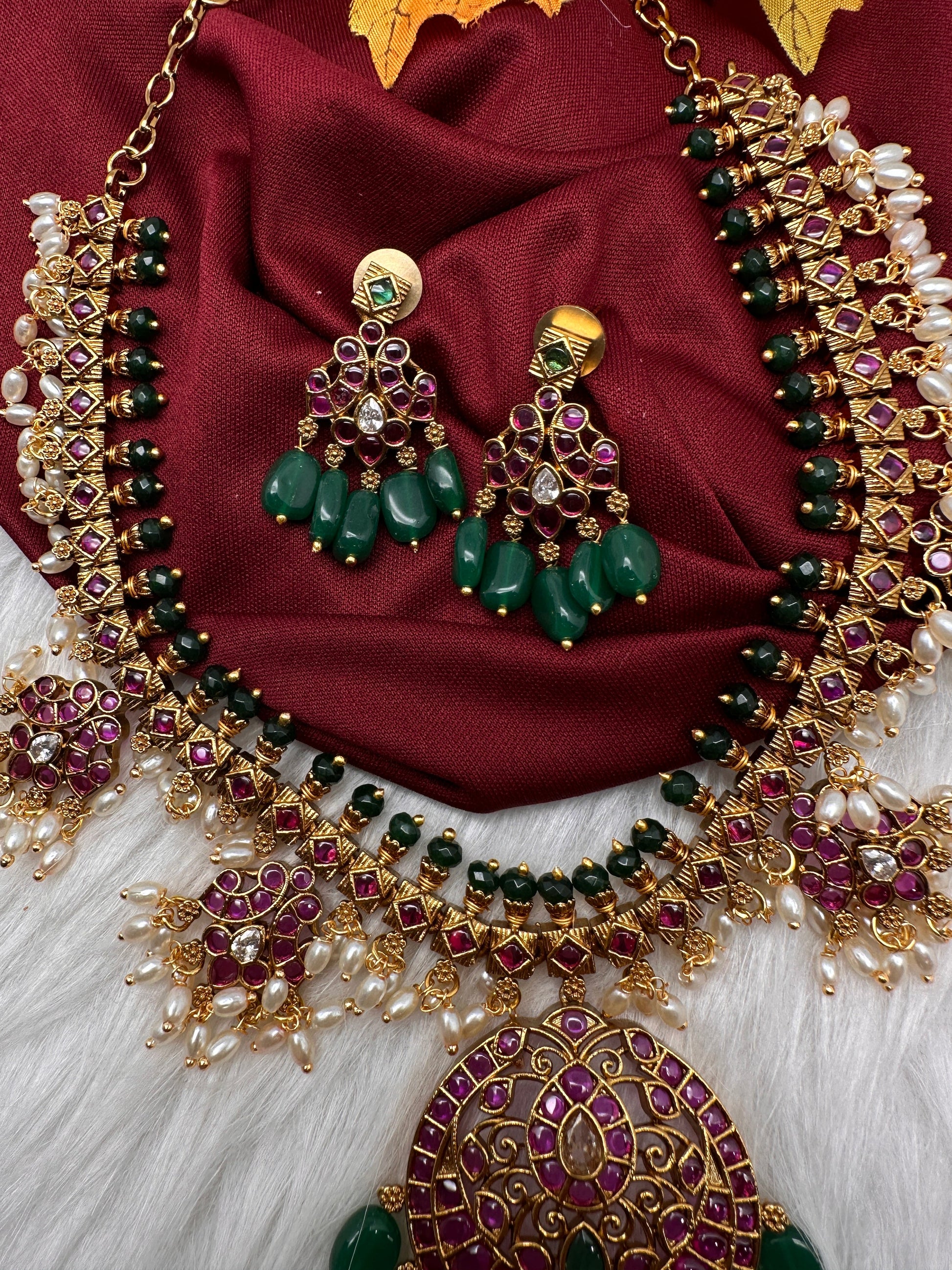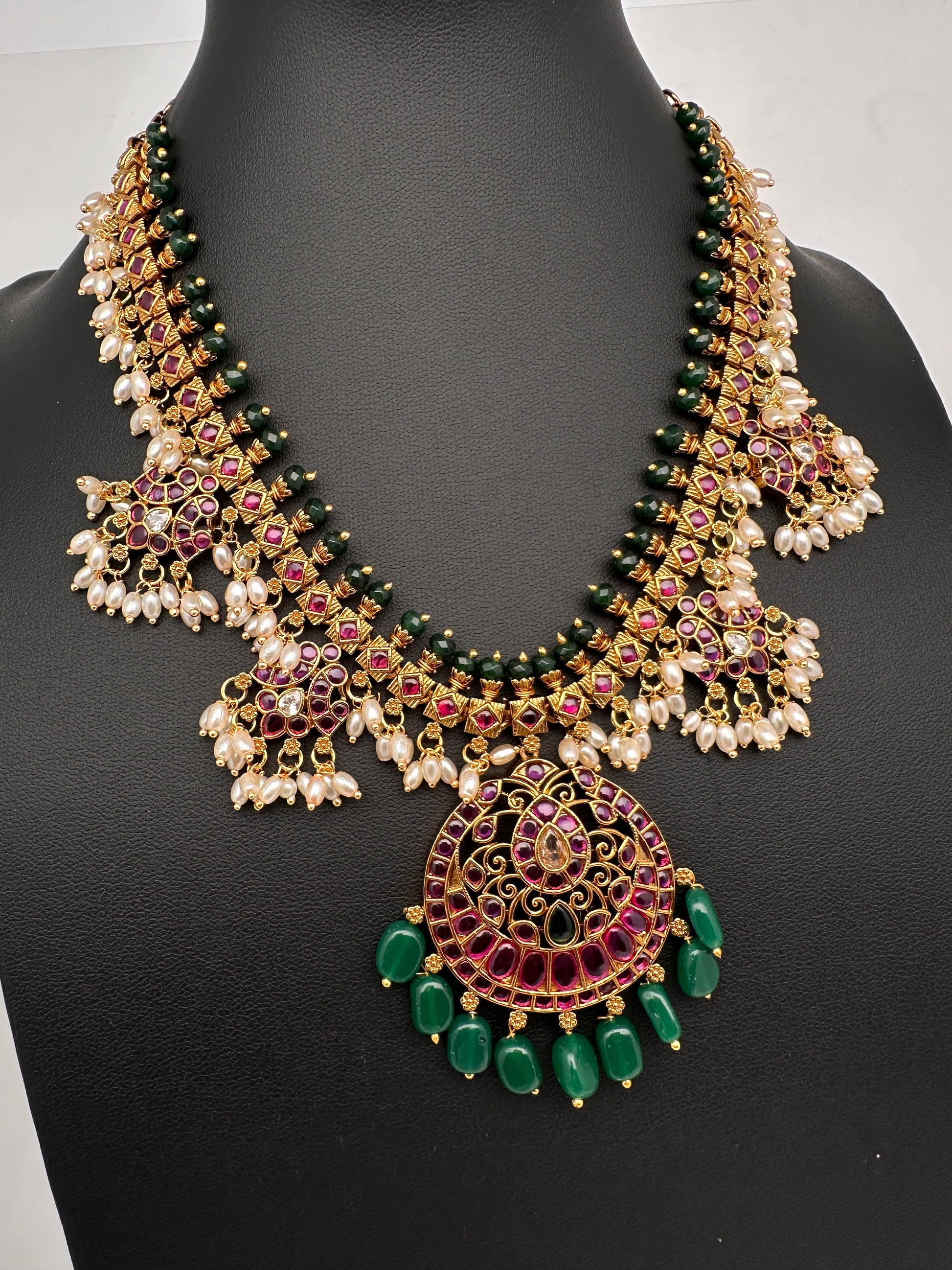 Kemp Premium Matte Guttapusalu Short Necklace with Matching JhumkasColor : MatteSize : Necklace Length : 16 Inches; Earring Length : 1.5 Inches ApproxStones : Kemp Red Green Stones Pearls Green Beads