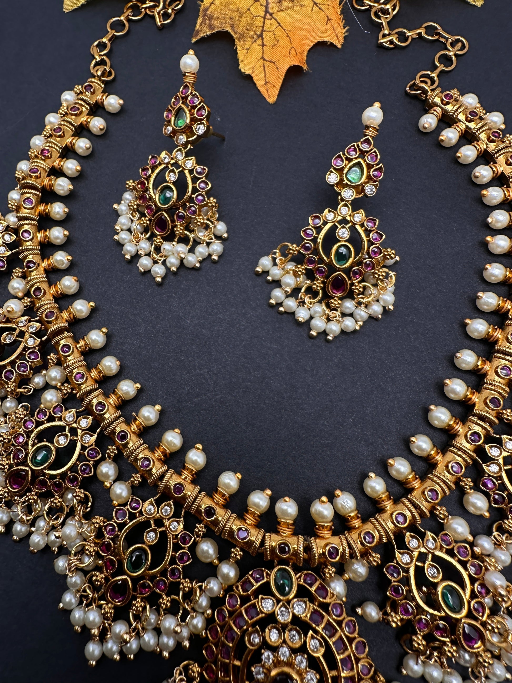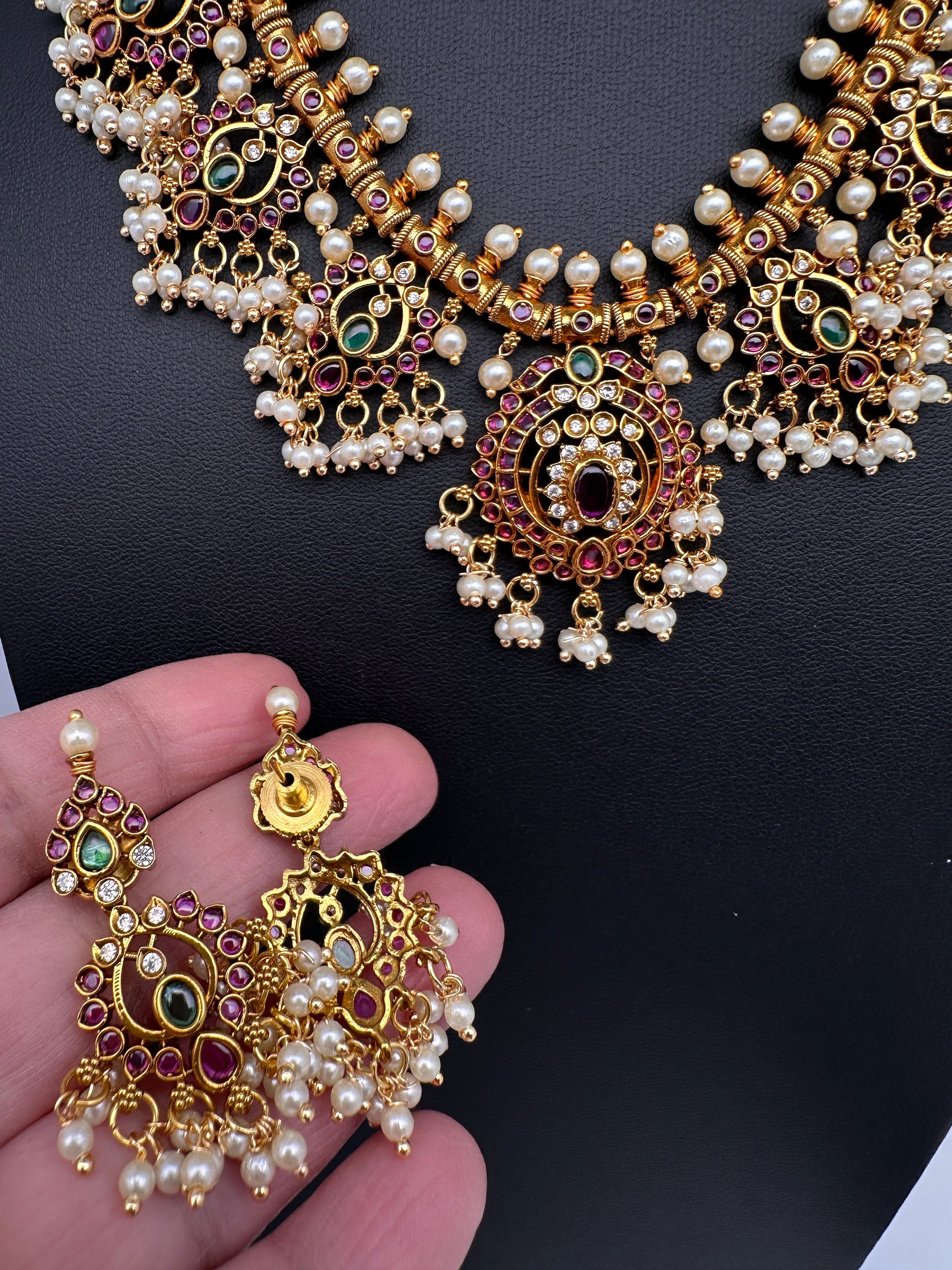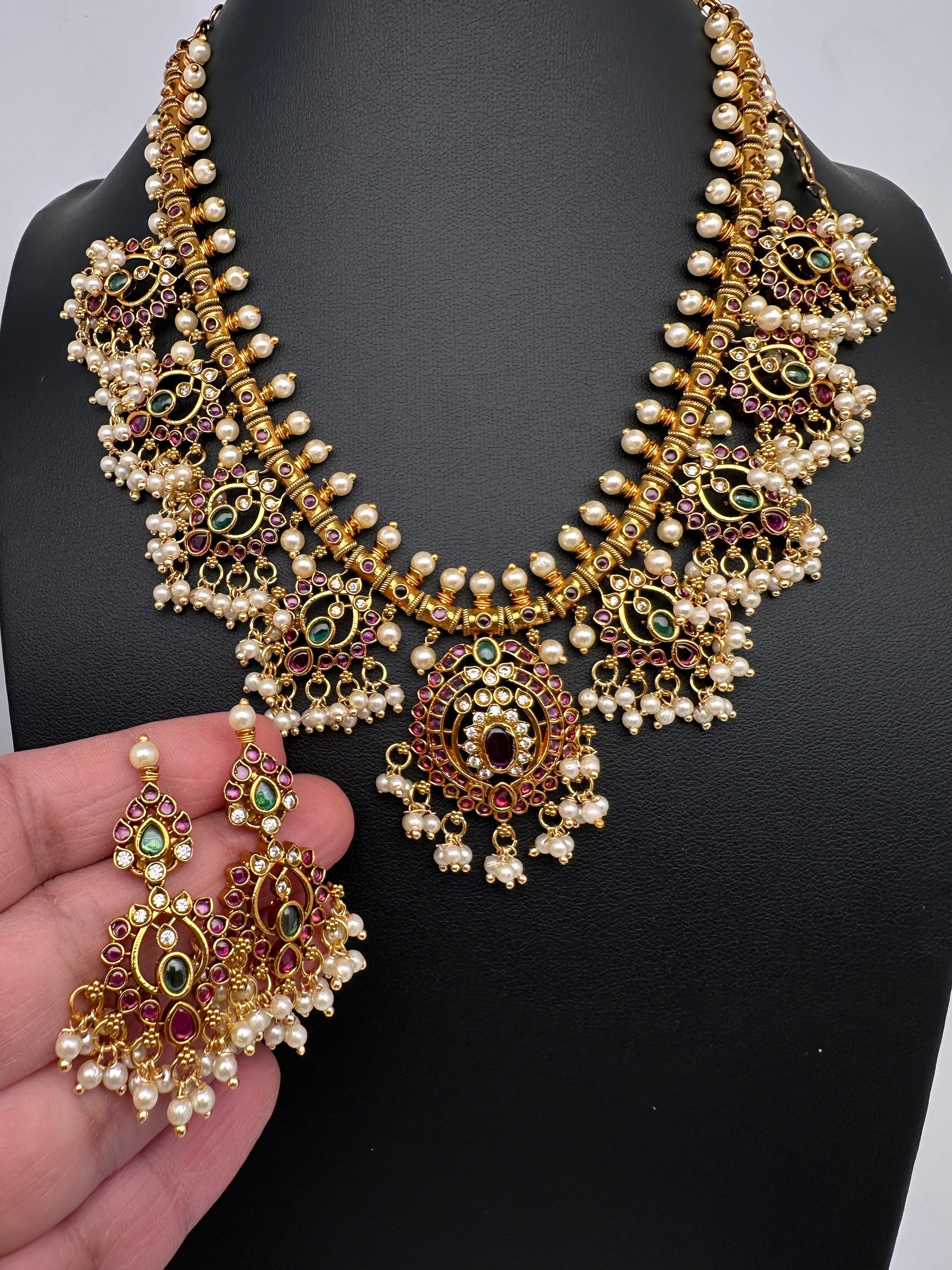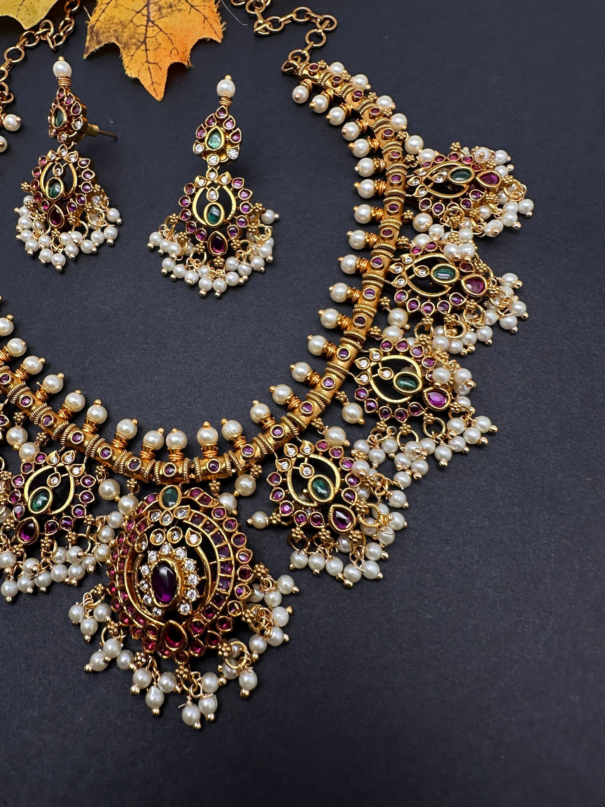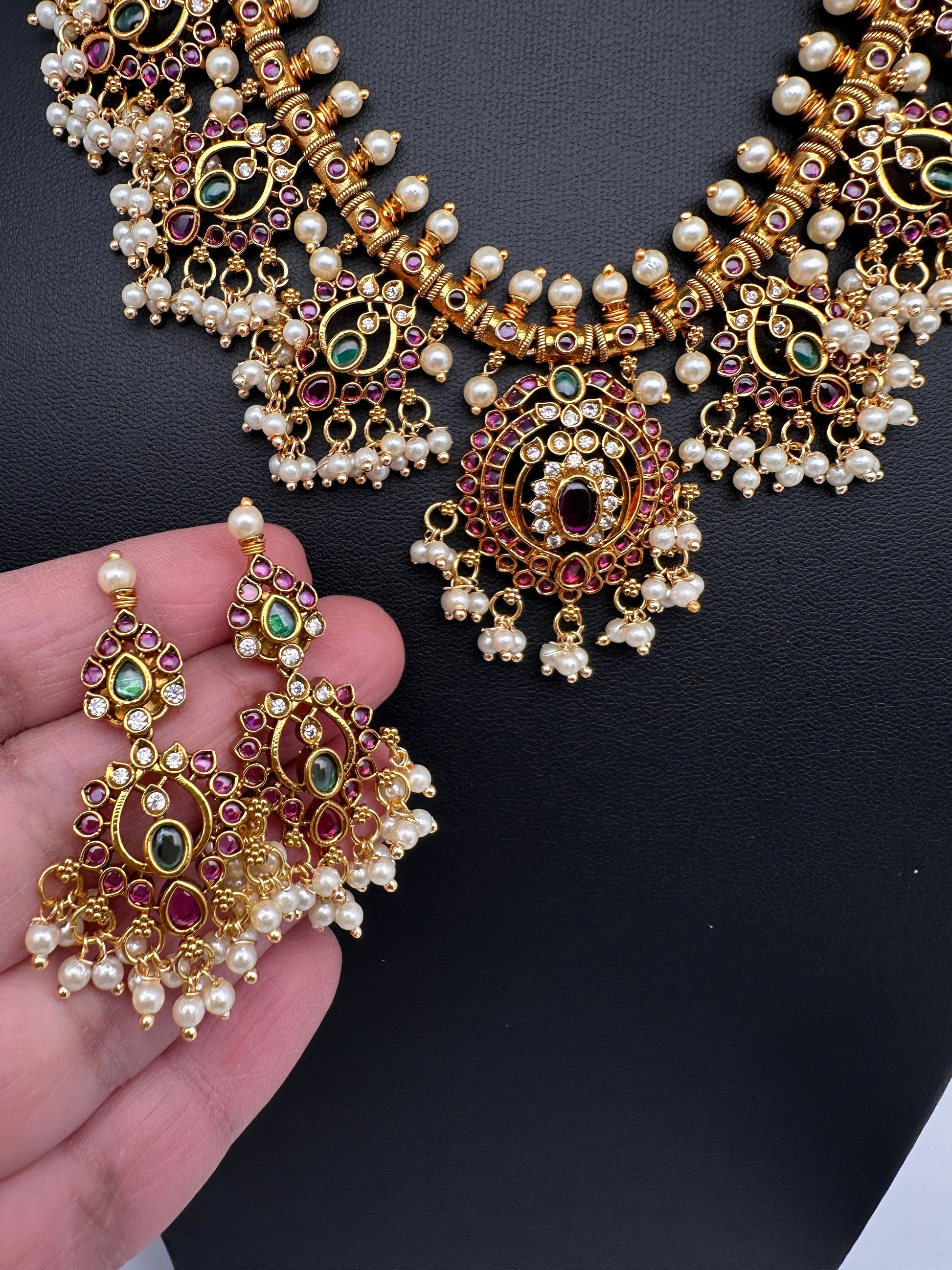 Kemp Premium Matte Guttapusalu Short Necklace with Matching JhumkasColor : MatteSize : Necklace Length : 16 Inches; Earring Length : 2 Inches ApproxStones : Kemp Red Green Stones Pearls Green Beads
