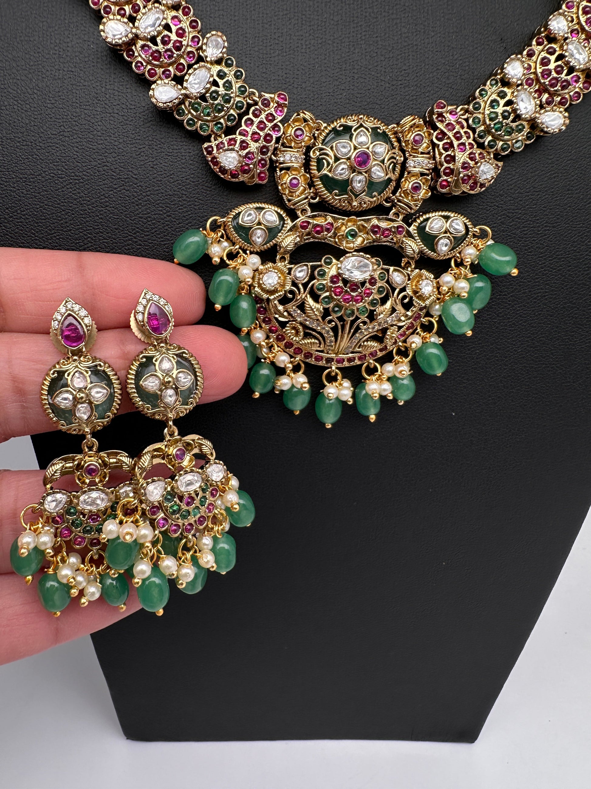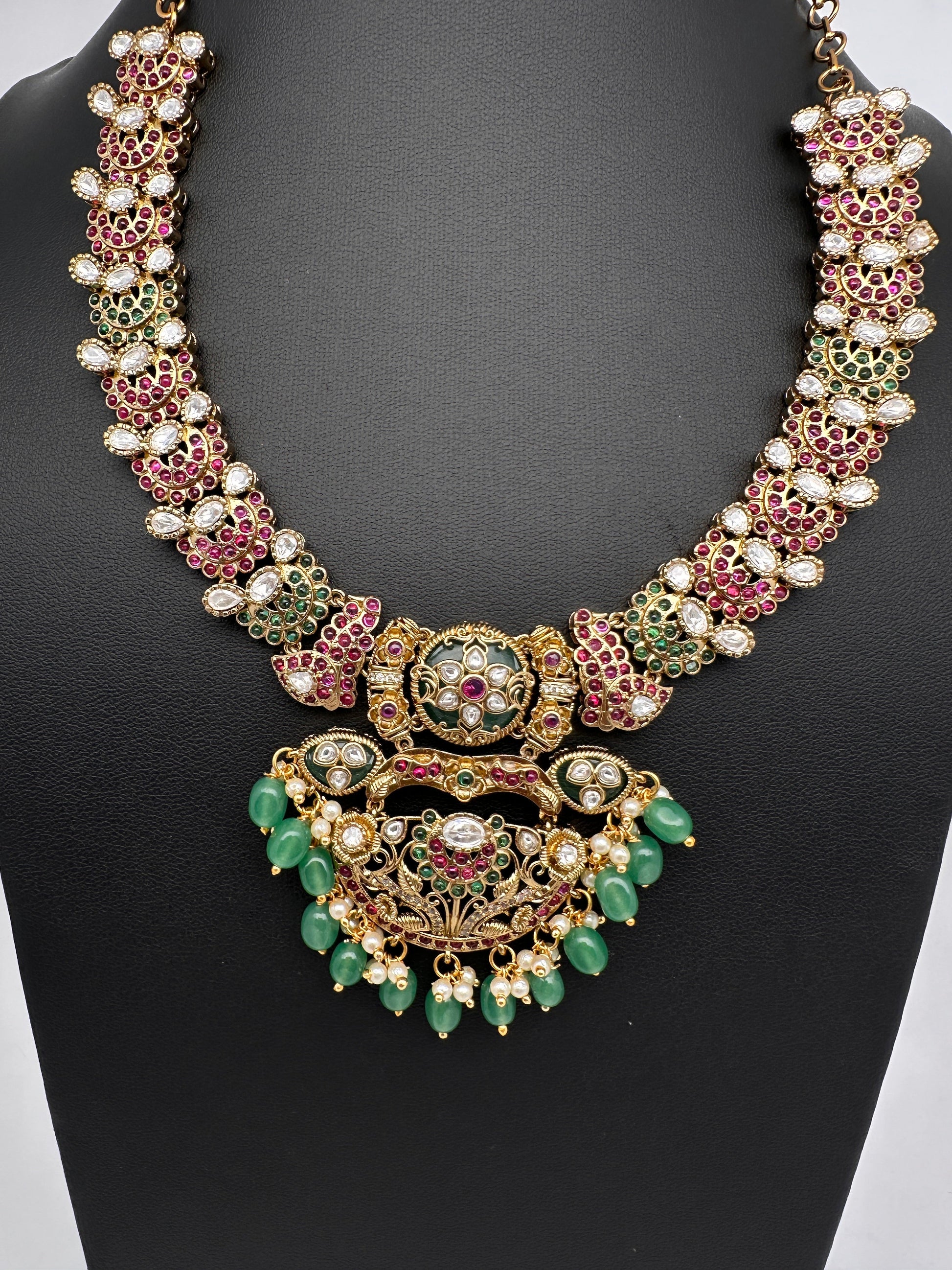 Kempu Matte Heritage Style Ethnic Short Necklace with Matching EarringsColor : MatteSize : Necklace Length : 16 Inches; Earring Length : 2 .25Inches Approx; Stones : CZ Kemp Red Green Pearls