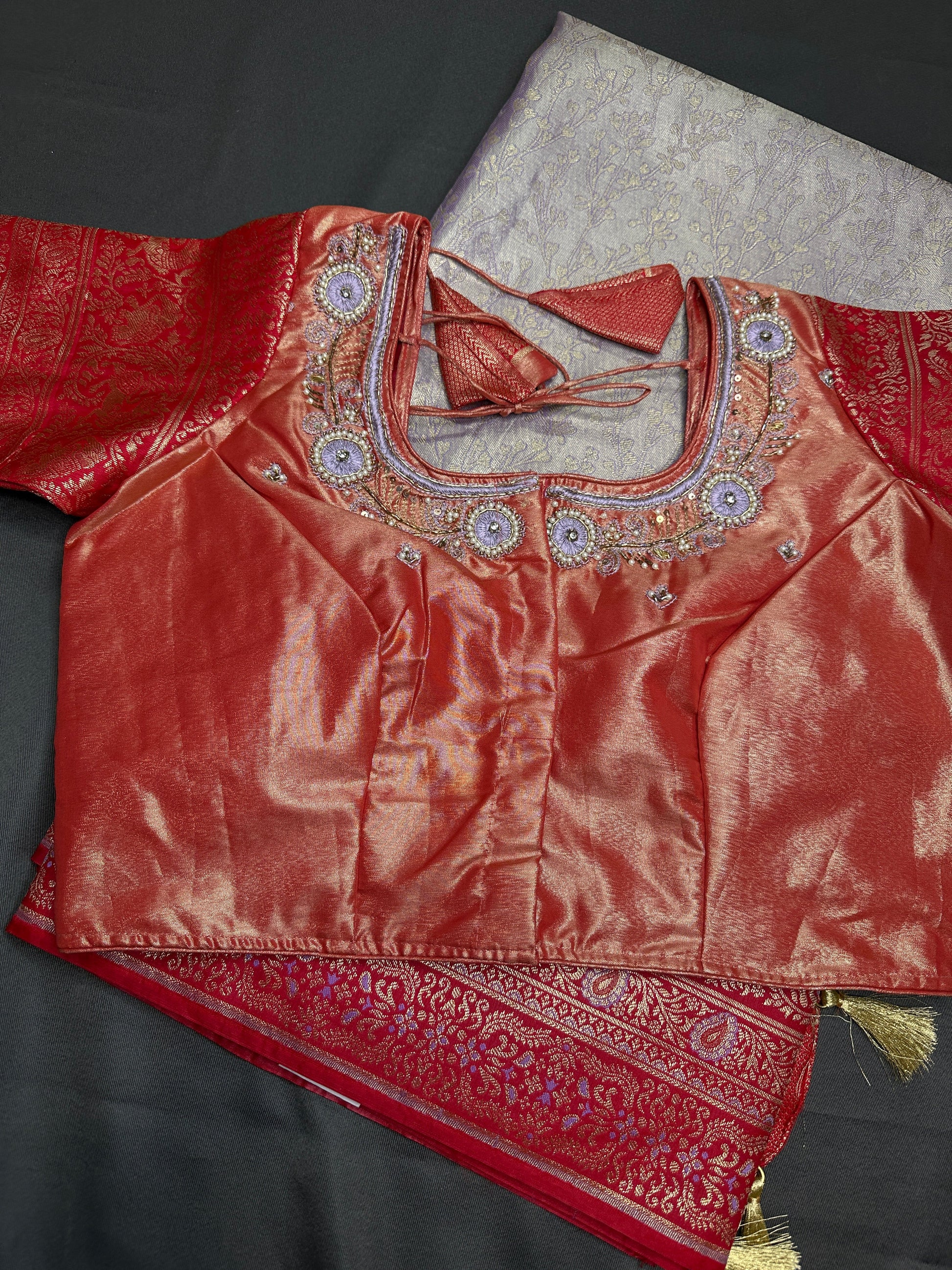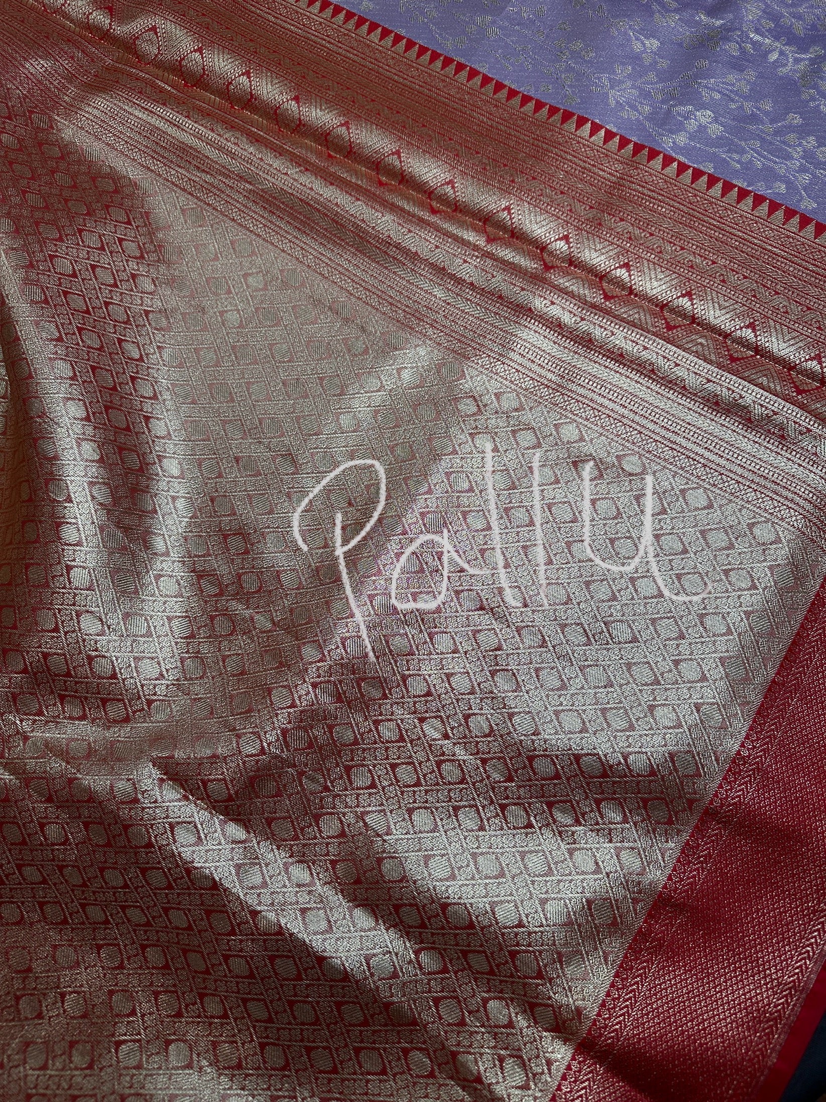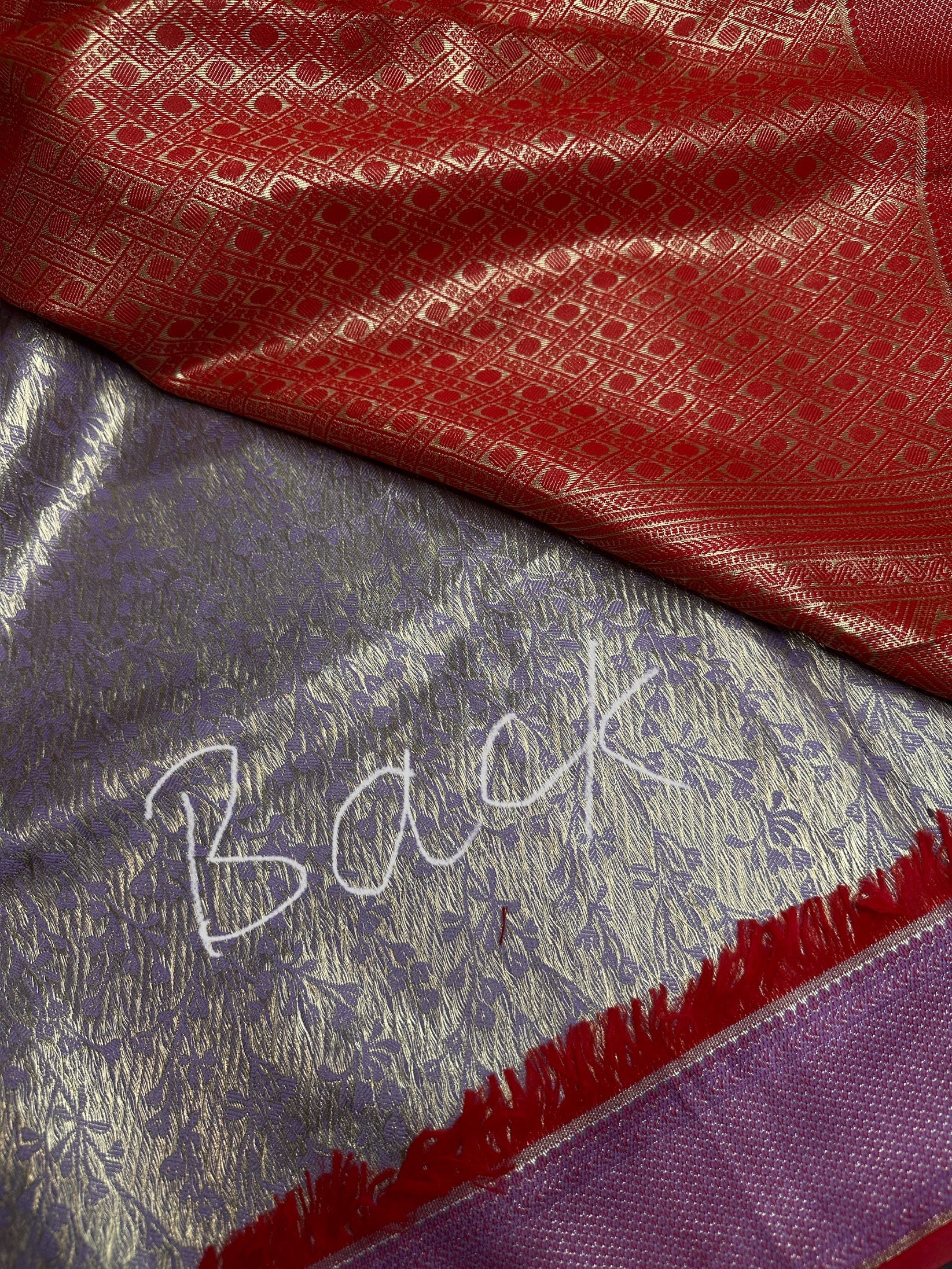Lavender Brocade Semi Kanchi Silk Saree Saree Details : Lavender Color Saree Red Pallu Fall and Pico done Blouse Details : Red Blouse Size 40 and has margin to go up to Size 46; Sleeves Length : 8 Inches: Blouse Length : 15 Inches; Front Neck : 6 Inches; Back Neck : 9 Inches