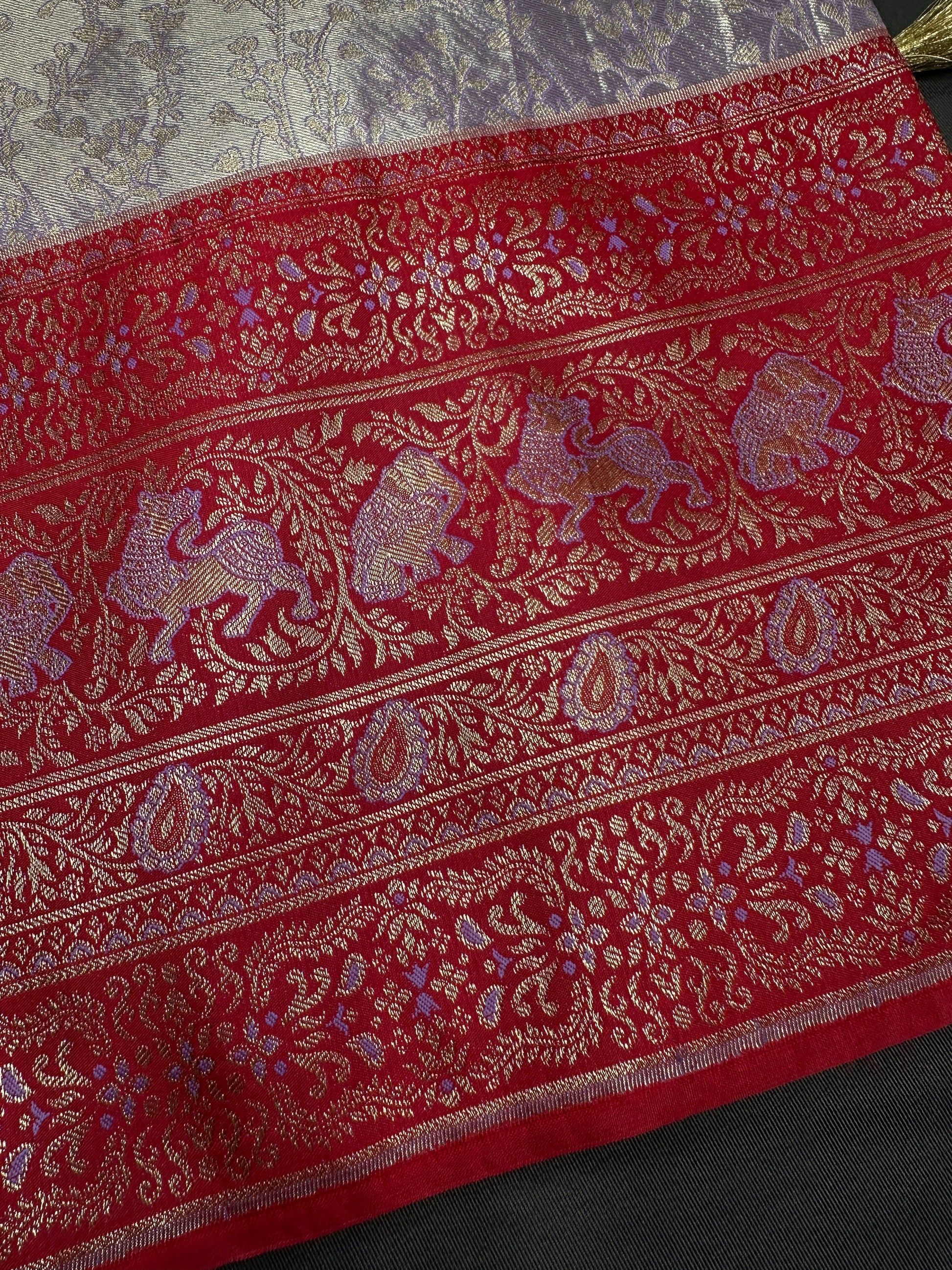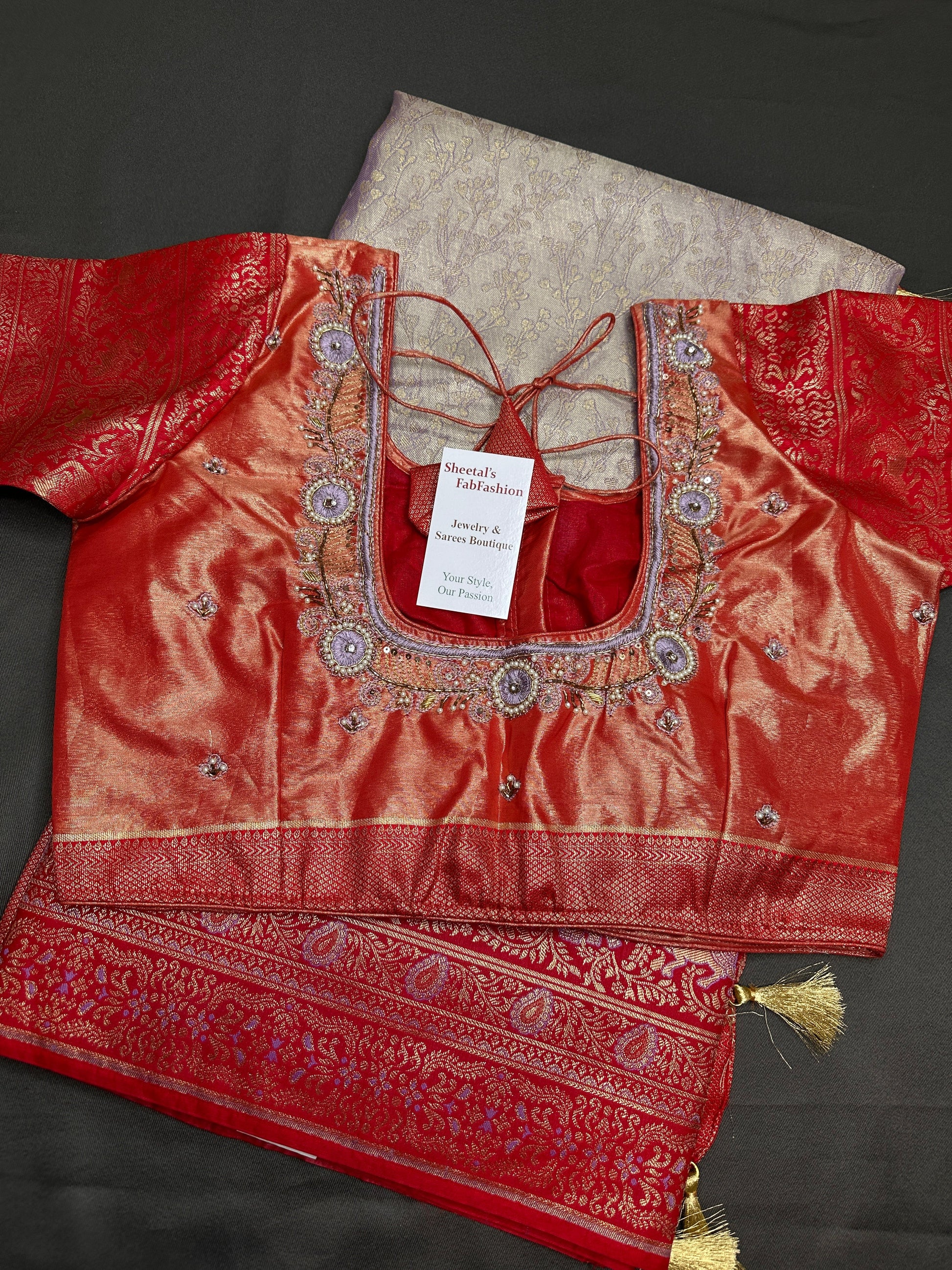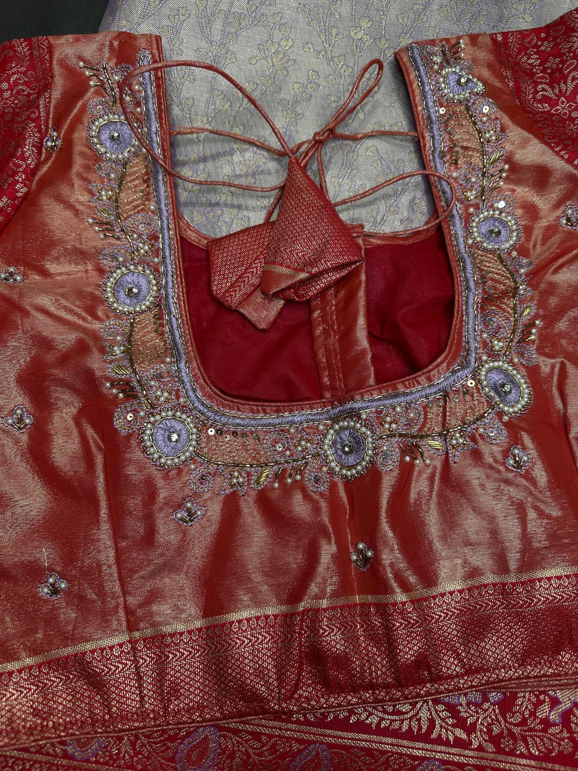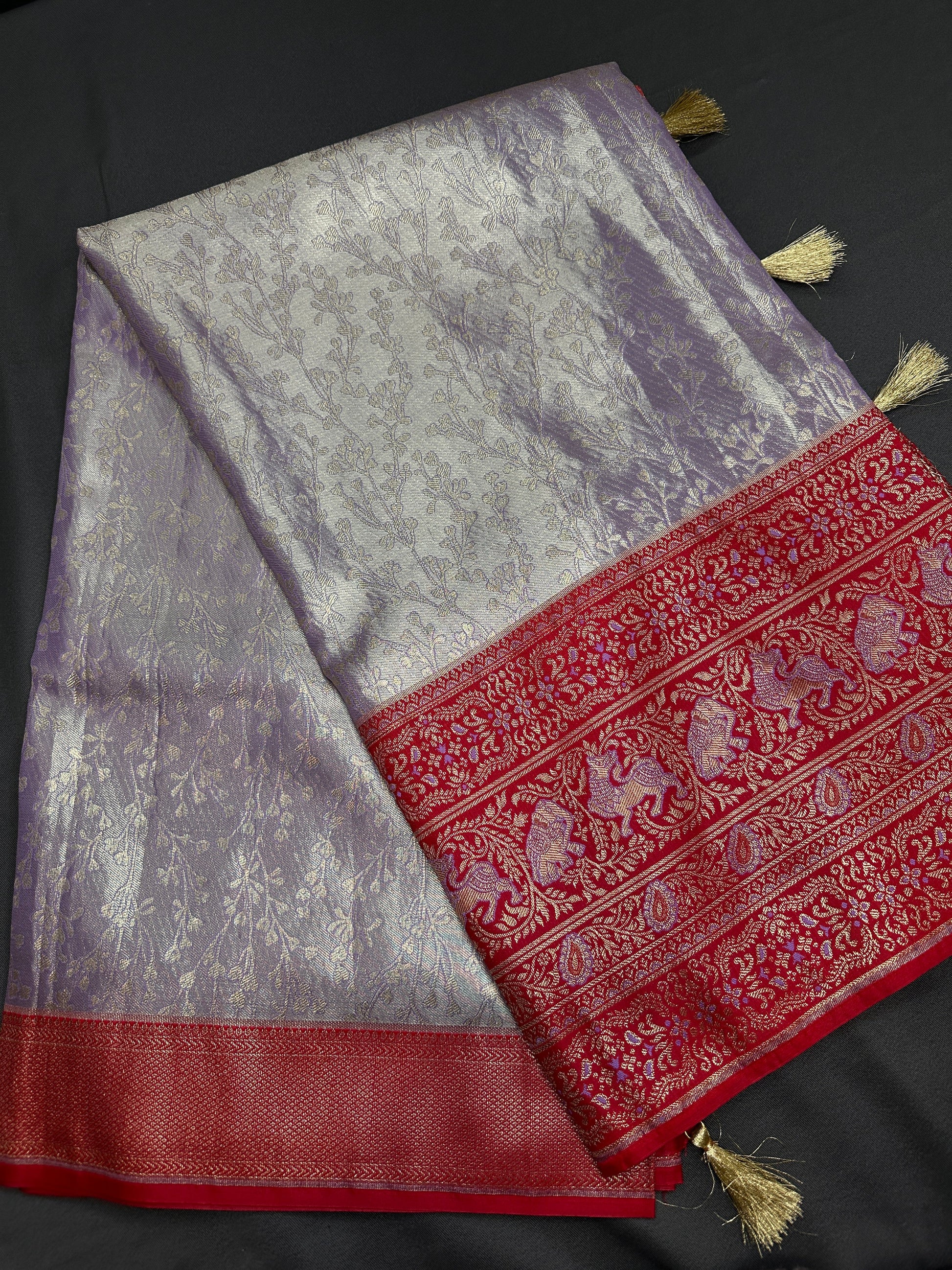 Lavender Brocade Semi Kanchi Silk Saree Saree Details : Lavender Color Saree Red Pallu Fall and Pico done Blouse Details : Red Blouse Size 40 and has margin to go up to Size 46; Sleeves Length : 8 Inches: Blouse Length : 15 Inches; Front Neck : 6 Inches; Back Neck : 9 Inches