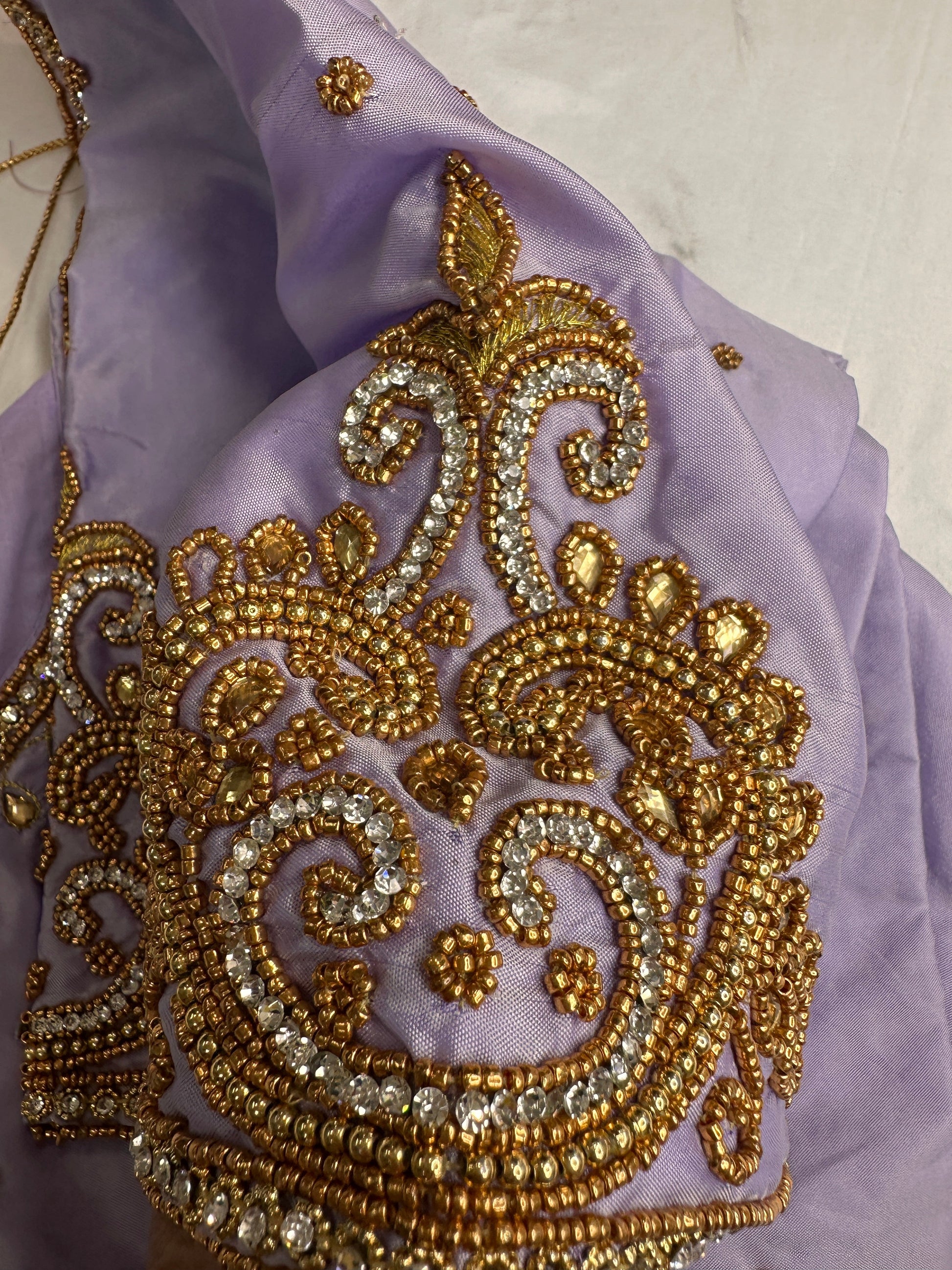 Lavender Maggam Aari Embroidery BlouseBlouse Details : Blouse Color : Lavender; Blouse stitched Size 38 and can be altered from 36 to 44, Sleeves Length : 10 Inches, blouse Length 15 Inches, FrontNeck : 7 Inches and Back Neck : 9.5 Inches;