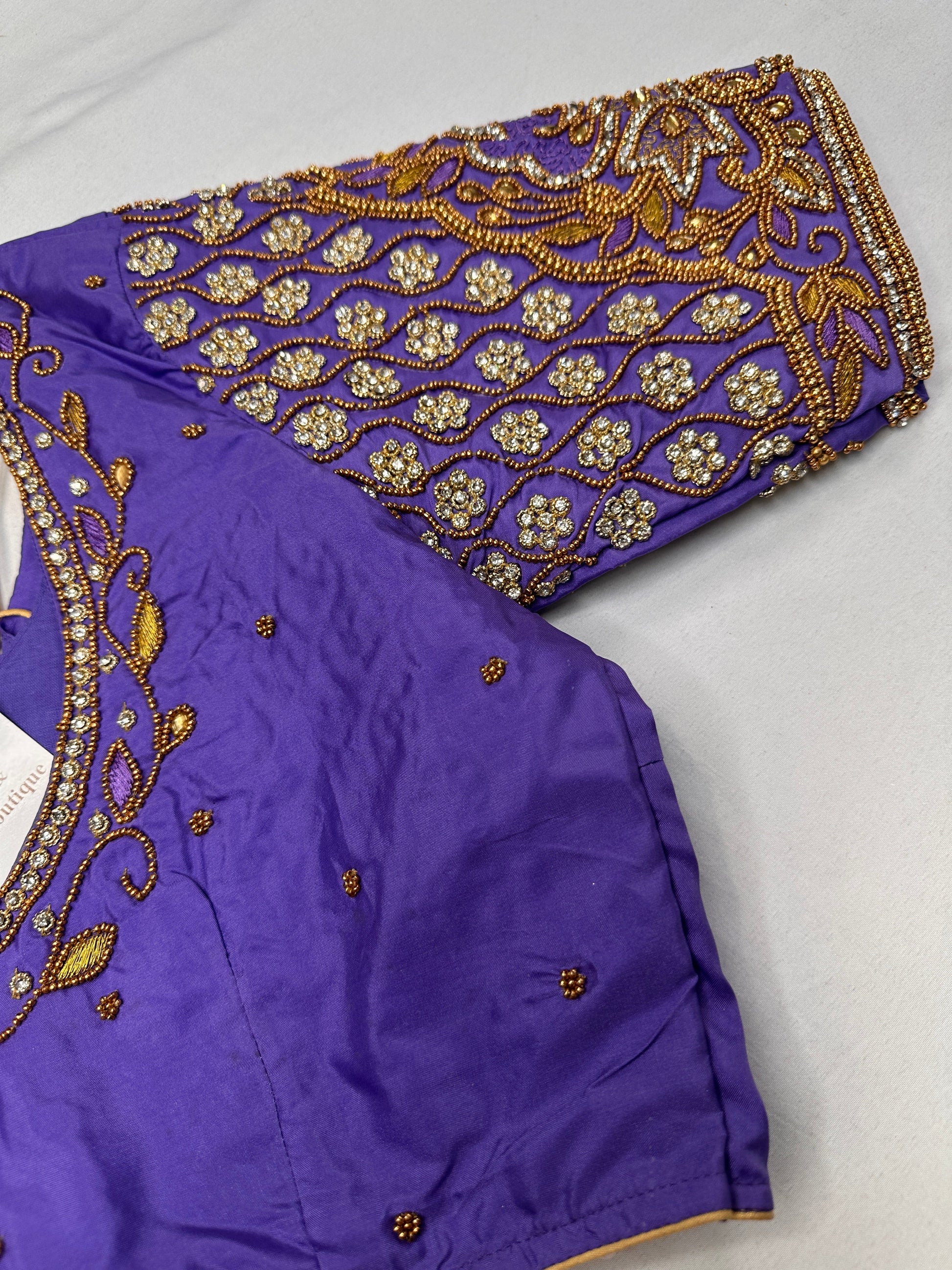 Lavender Purple Maggam Aari BlouseBlouse Details : Blouse Color : Lavender; Blouse stitched Size 38 and can be altered from 36 to 46, Sleeves Length : 10 Inches, blouse Length 15 Inches, FrontNeck : 8 Inches and Back Neck : 10 Inches;