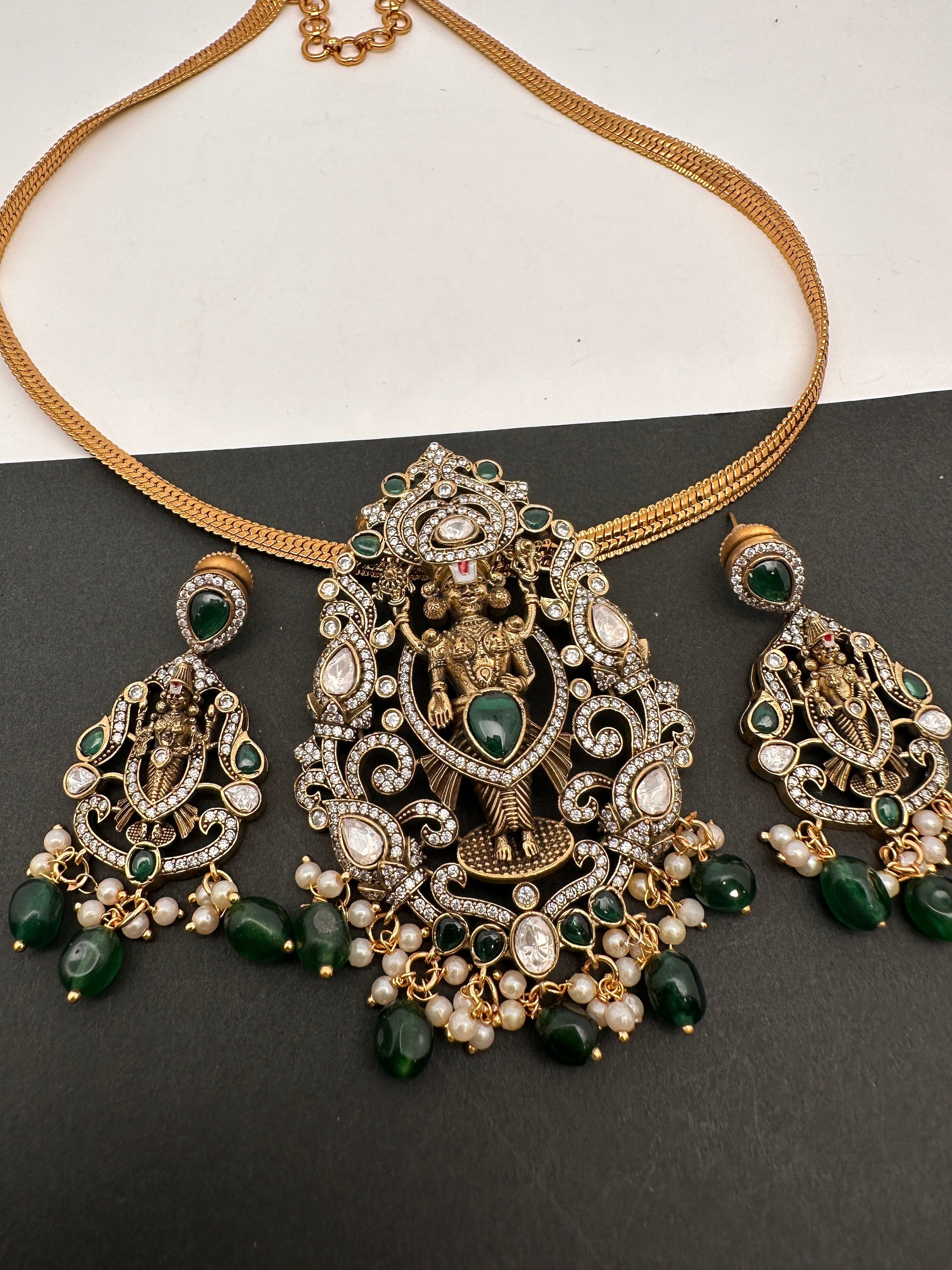 Lord Balaji Nakshi Color Stone Kundan Victorian Mehndi Finish Pendent Set with matching earrings, comes with complementary matte golden finish chain Color : Victorian Mehndi Size : Chain Length : Approx 18 Inches; Pendent Length : Approx 3 Inches; Earring Length : Approx 2.25 Inches; Stones : Kundan --Color-- Stone --Color-- Beads Pearls