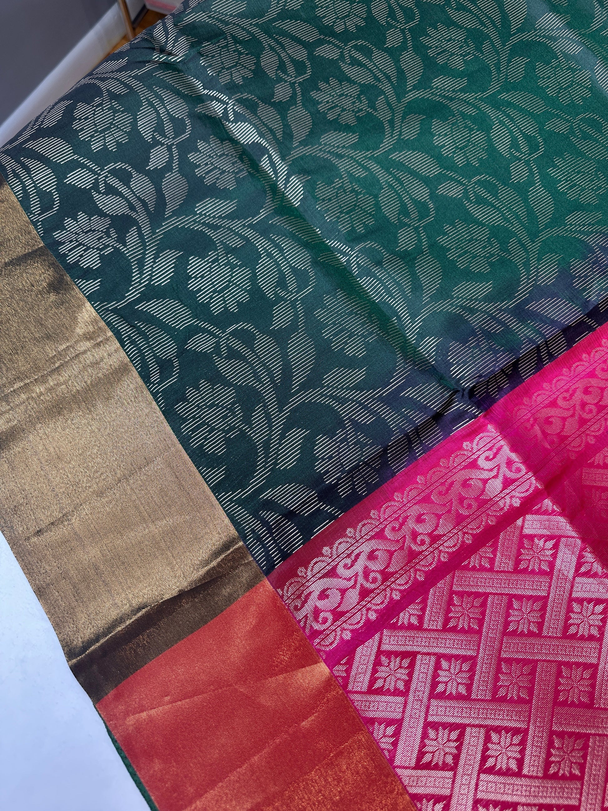 Magalgiri Soft Silk SareeSaree Details : Green Color Saree Pink Pallu Fall and Pico doneBlouse Details : Blouse Piece
