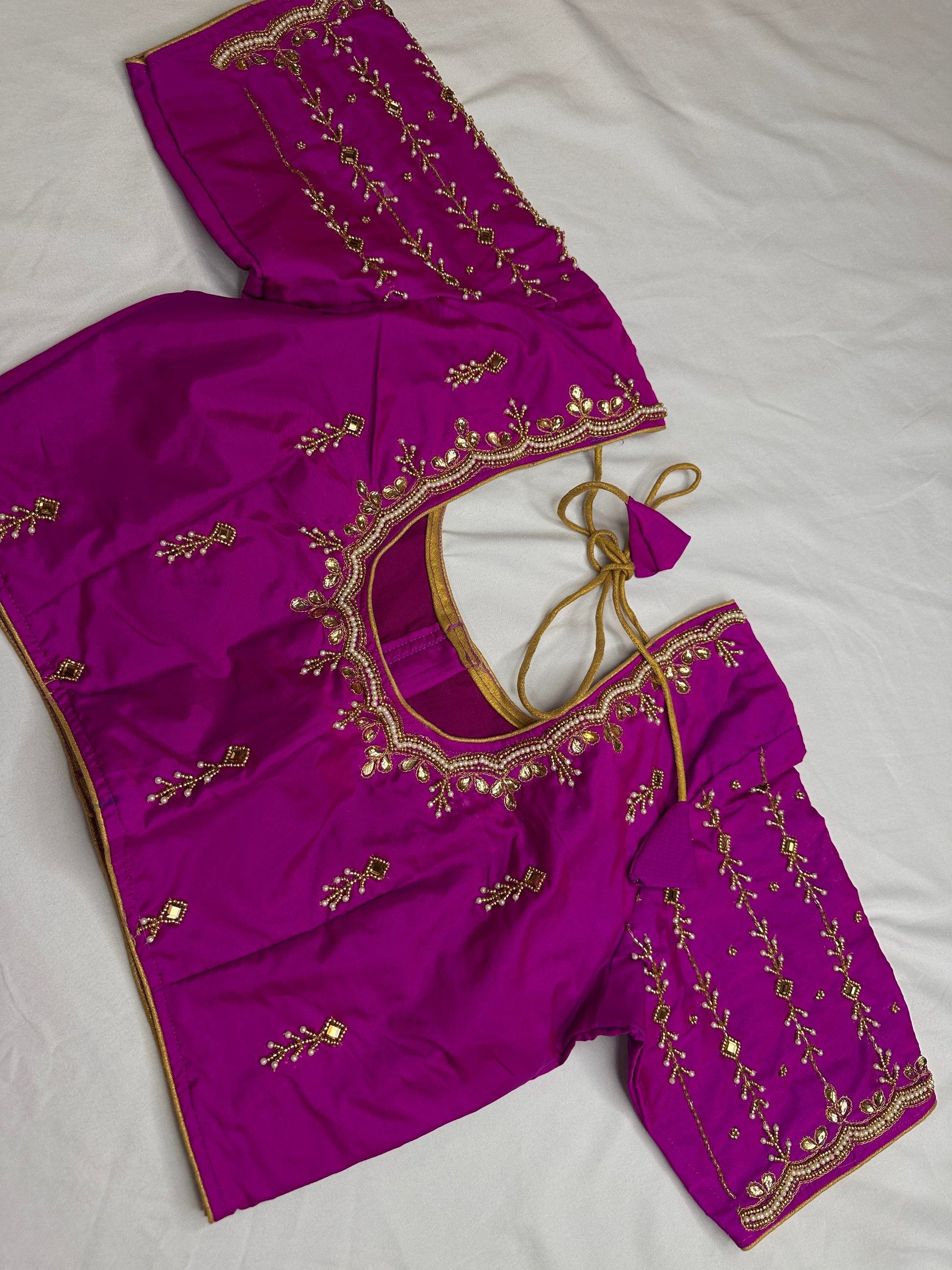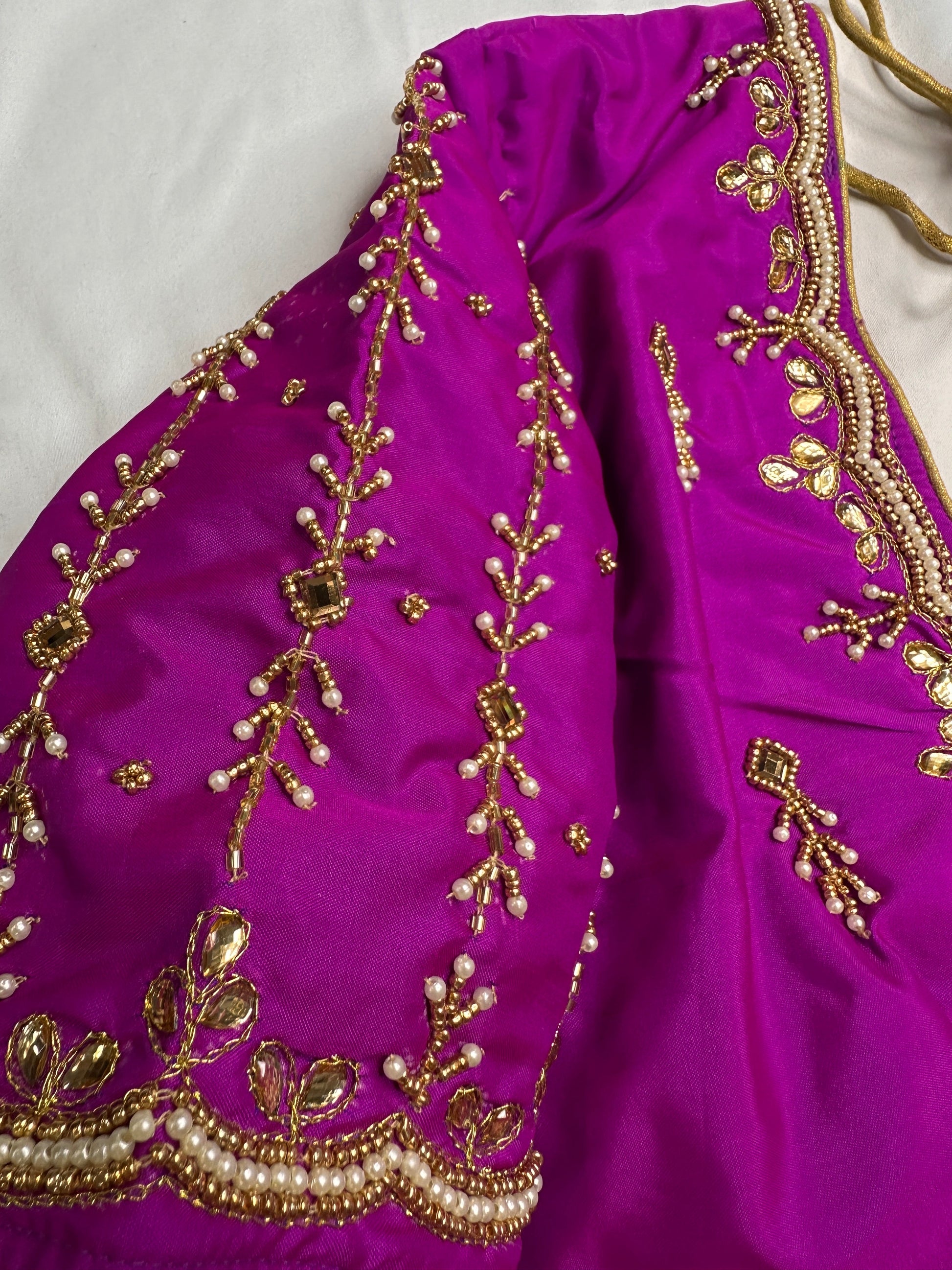 Magenta Purple Maggam BlouseBlouse Details : Blouse Color : Black; Blouse stitched Size 40 and can be altered from 36 to 44, Sleeves Length : 10 Inches, blouse Length 15 Inches, FrontNeck : 6.5 Inches and Back Neck : 8 Inches;