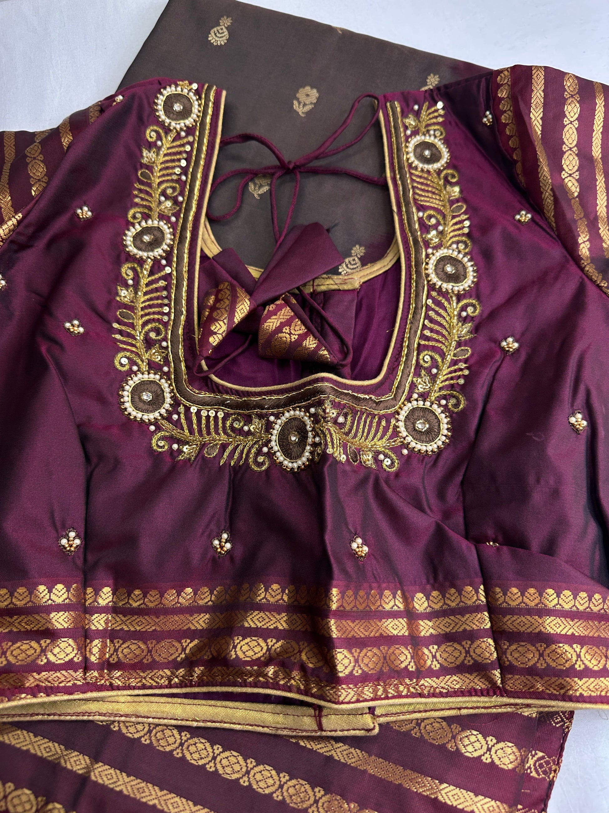 Saree Details : Brown Color Saree Maroon Blue Fall and Pico done