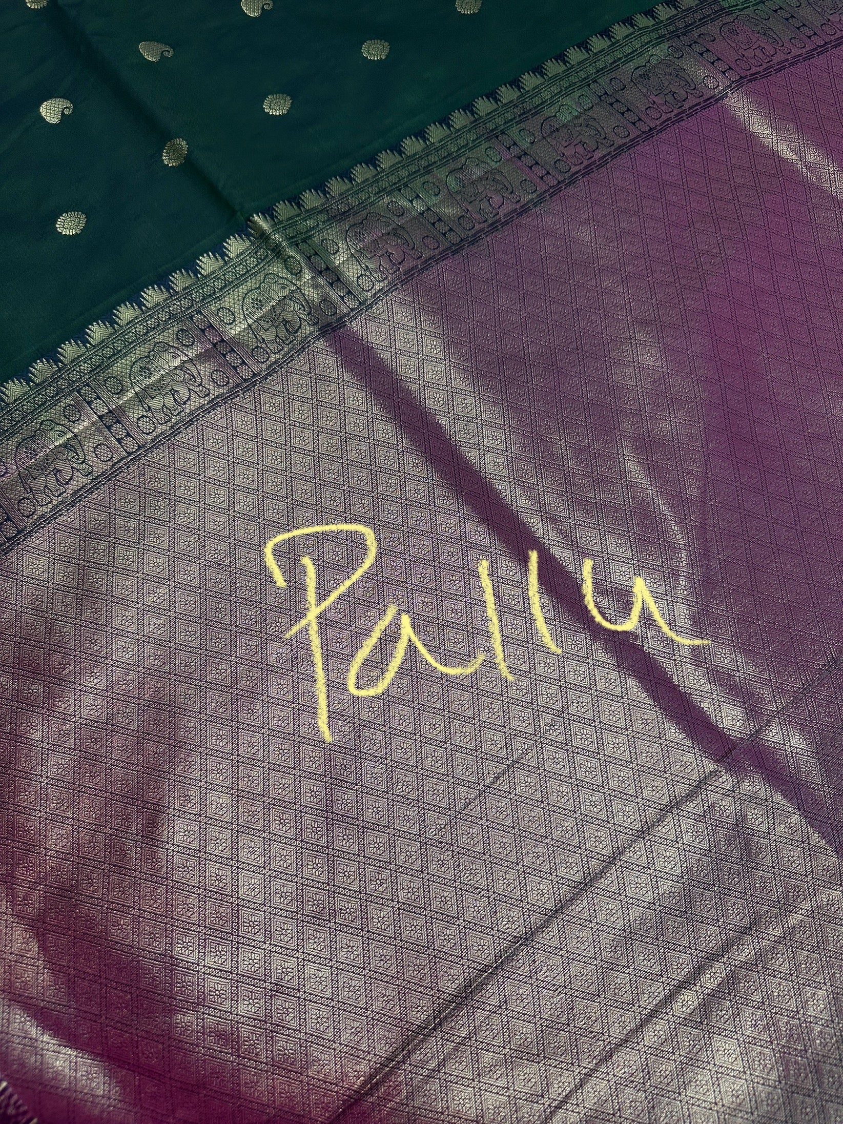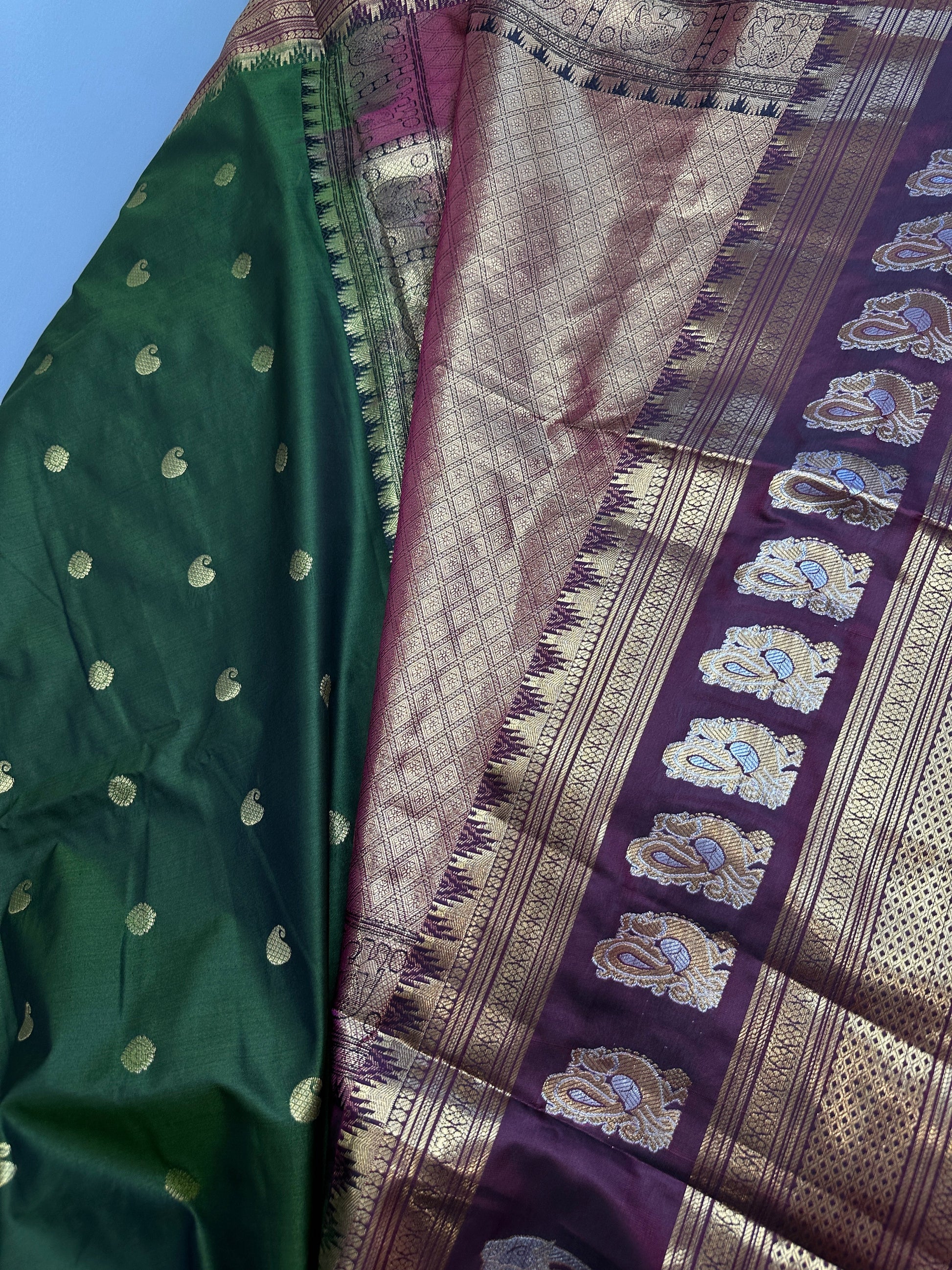 Mangalgiri Pattu Elephant Peacock Border Green Silk Saree Saree Details : Green Color Saree Maroon Pallu Fall and Pico done Blouse Details : Maroon Blouse Size 38 and has margin to go up to Size 46; Sleeves Length : 9.5 Inches: Blouse Length : 15 Inches; Front Neck : 8 Inches; Back Neck : 10 Inches Inches