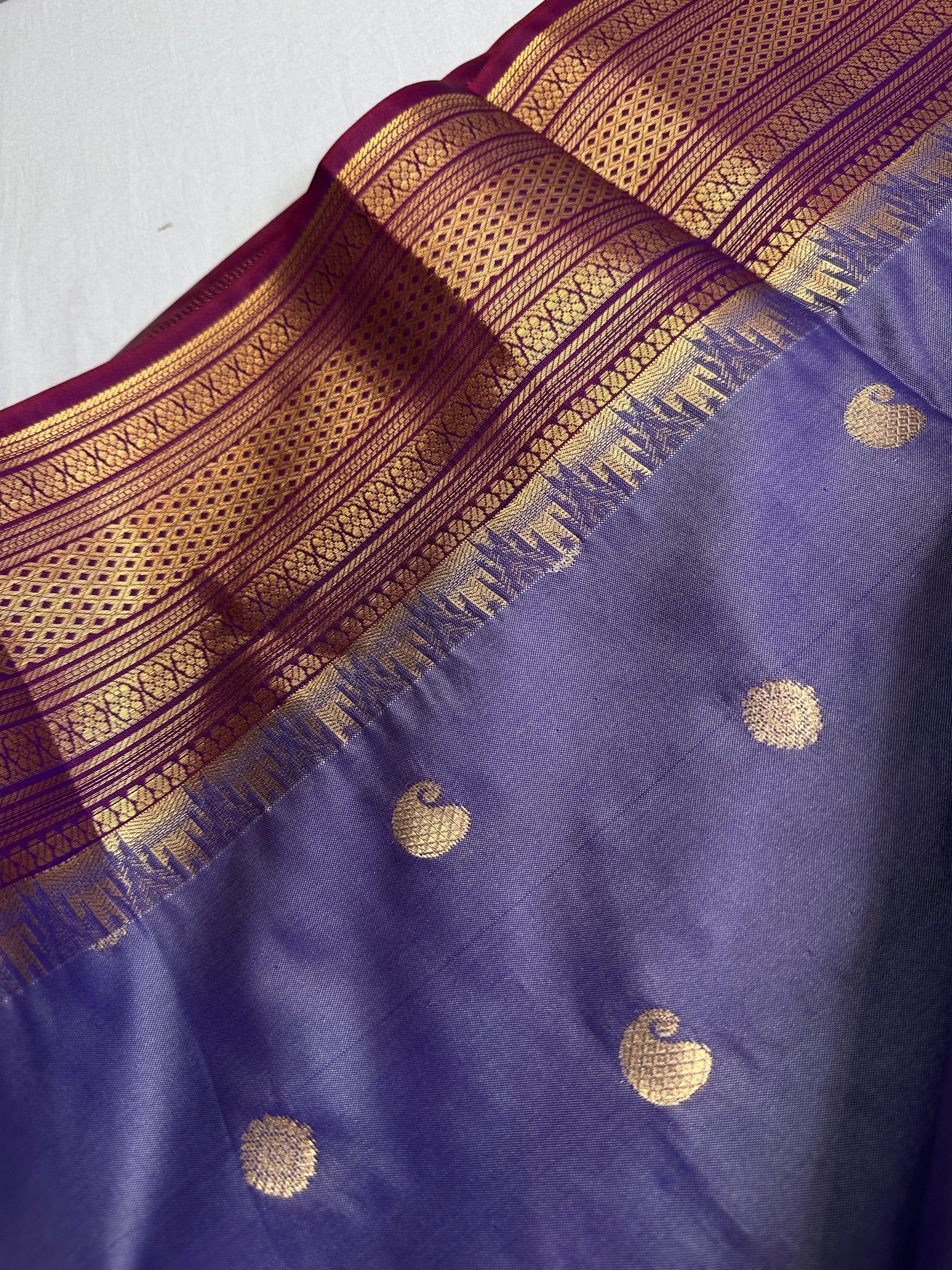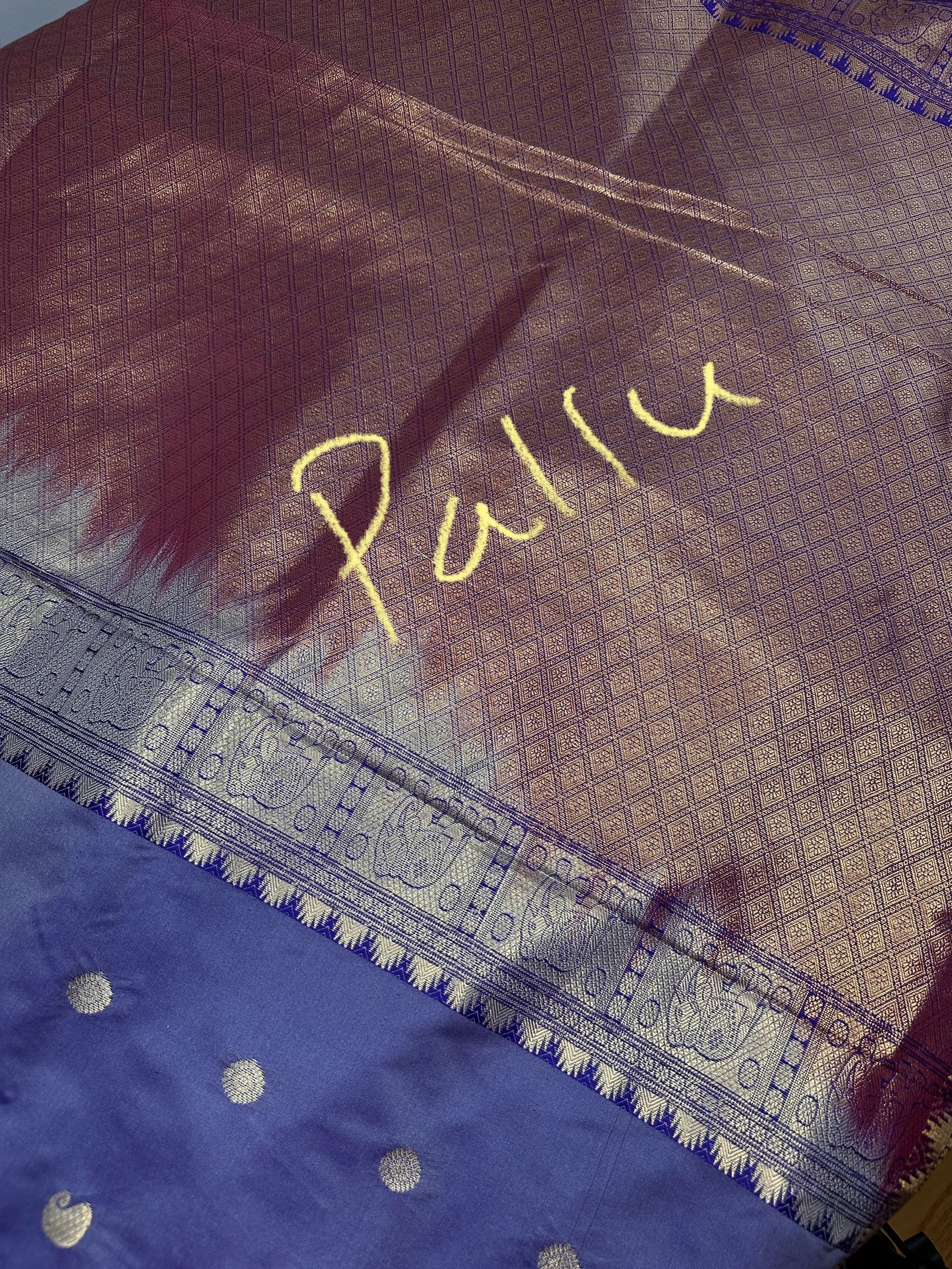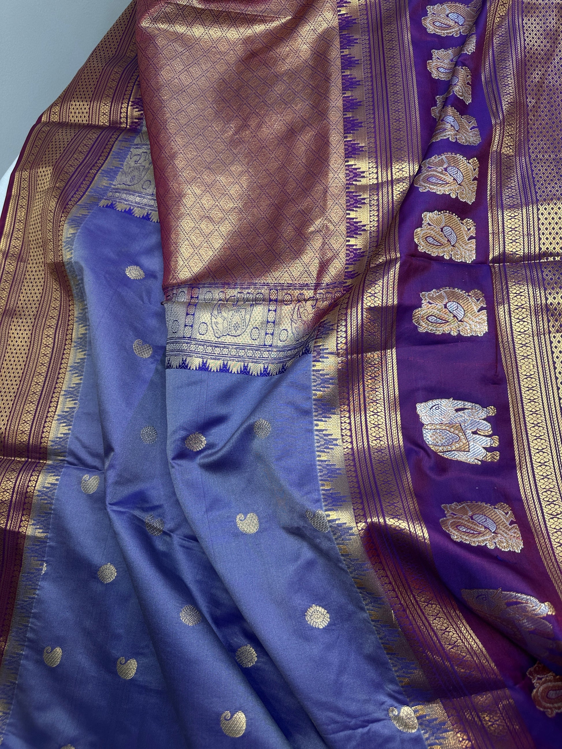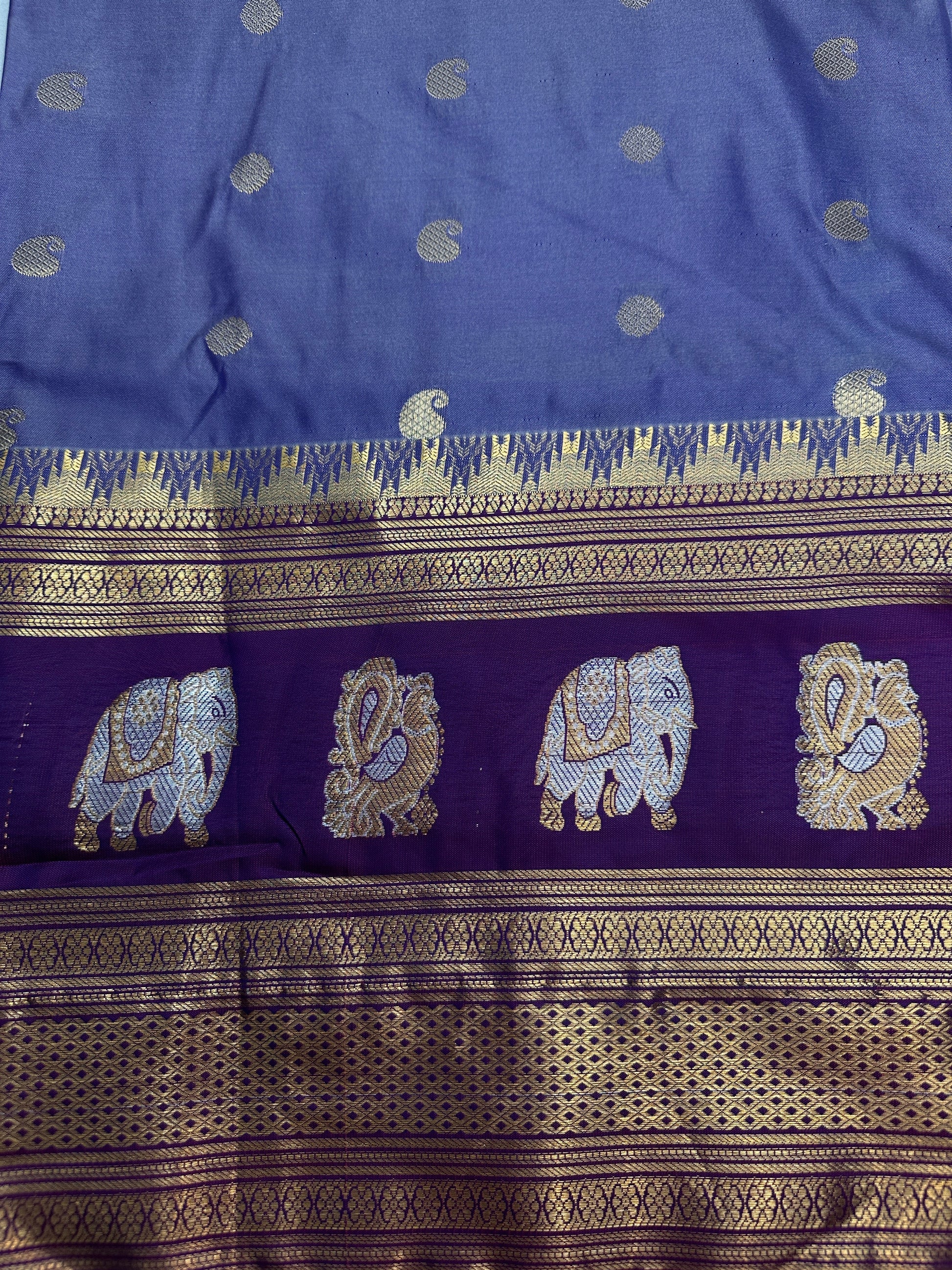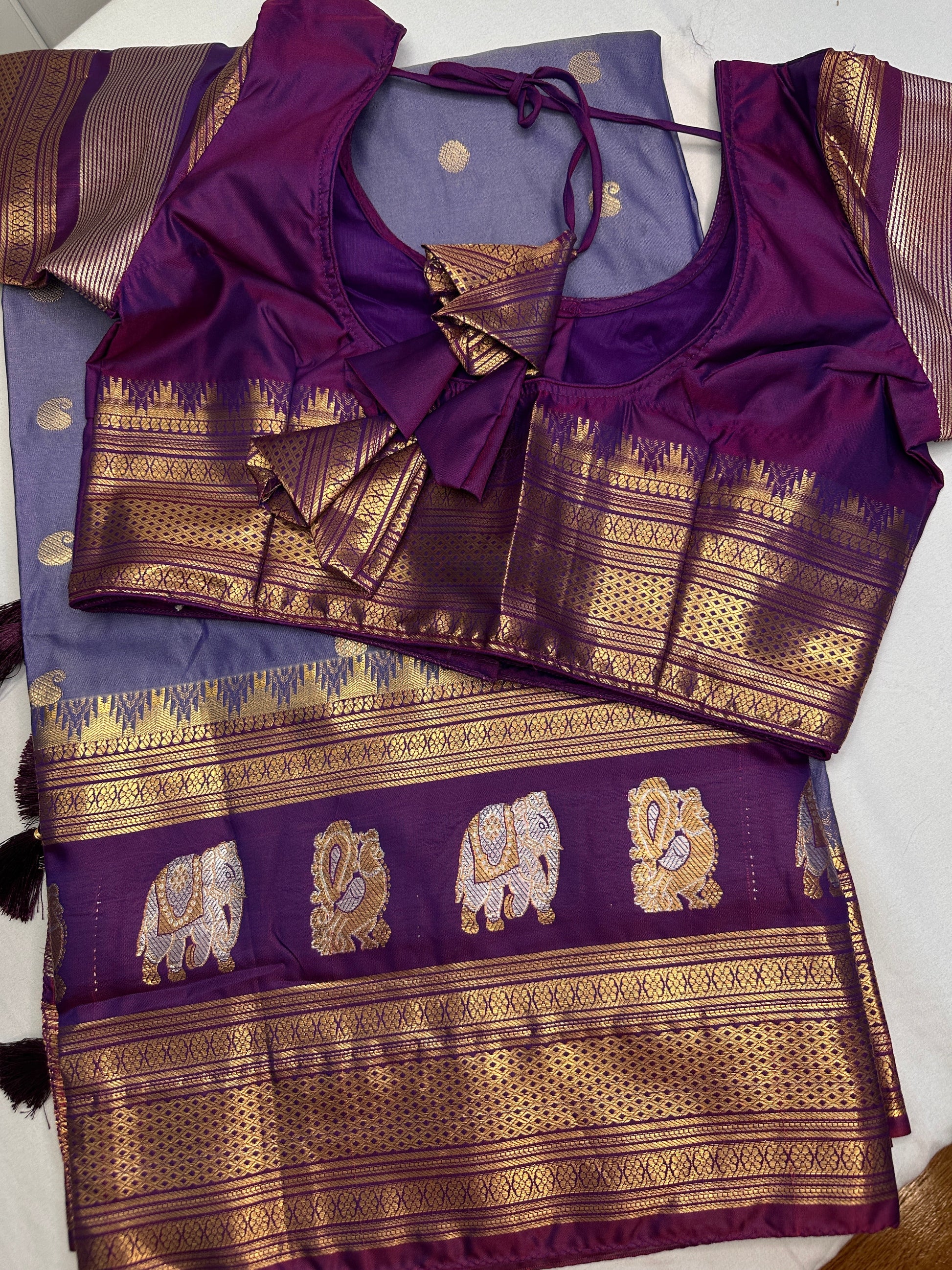 Mangalgiri Pattu Elephant Peacock Border LavenderSilk SareeSaree Details : Lavender Color Saree Purple Pallu Fall and Pico doneBlouse Details : Purple Blouse Size 38 and has margin to go up to Size 46; Sleeves Length : 9.5 Inches: Blouse Length : 15 Inches; Front Neck : 8 Inches; Back Neck : 10 Inches Inches
