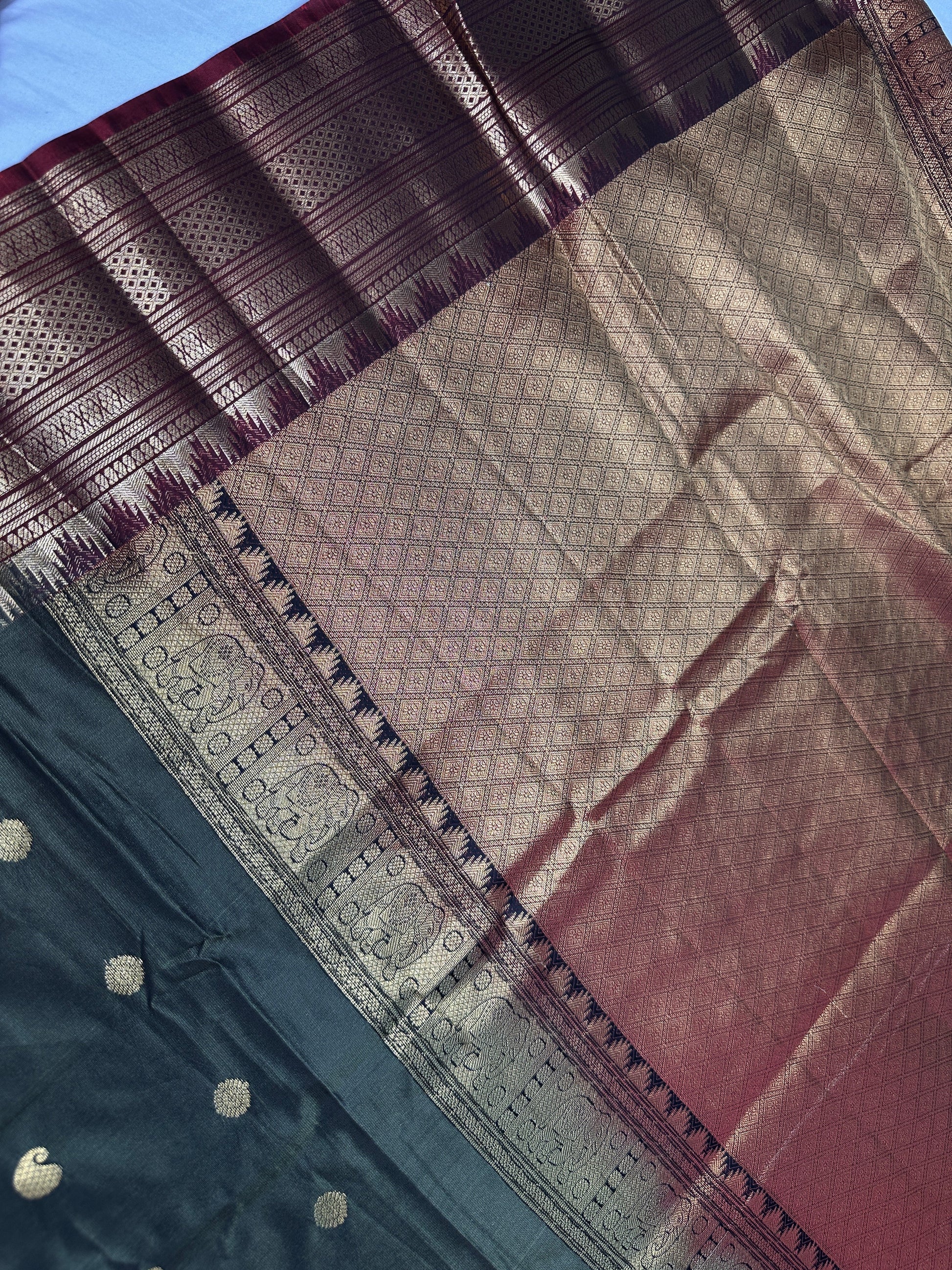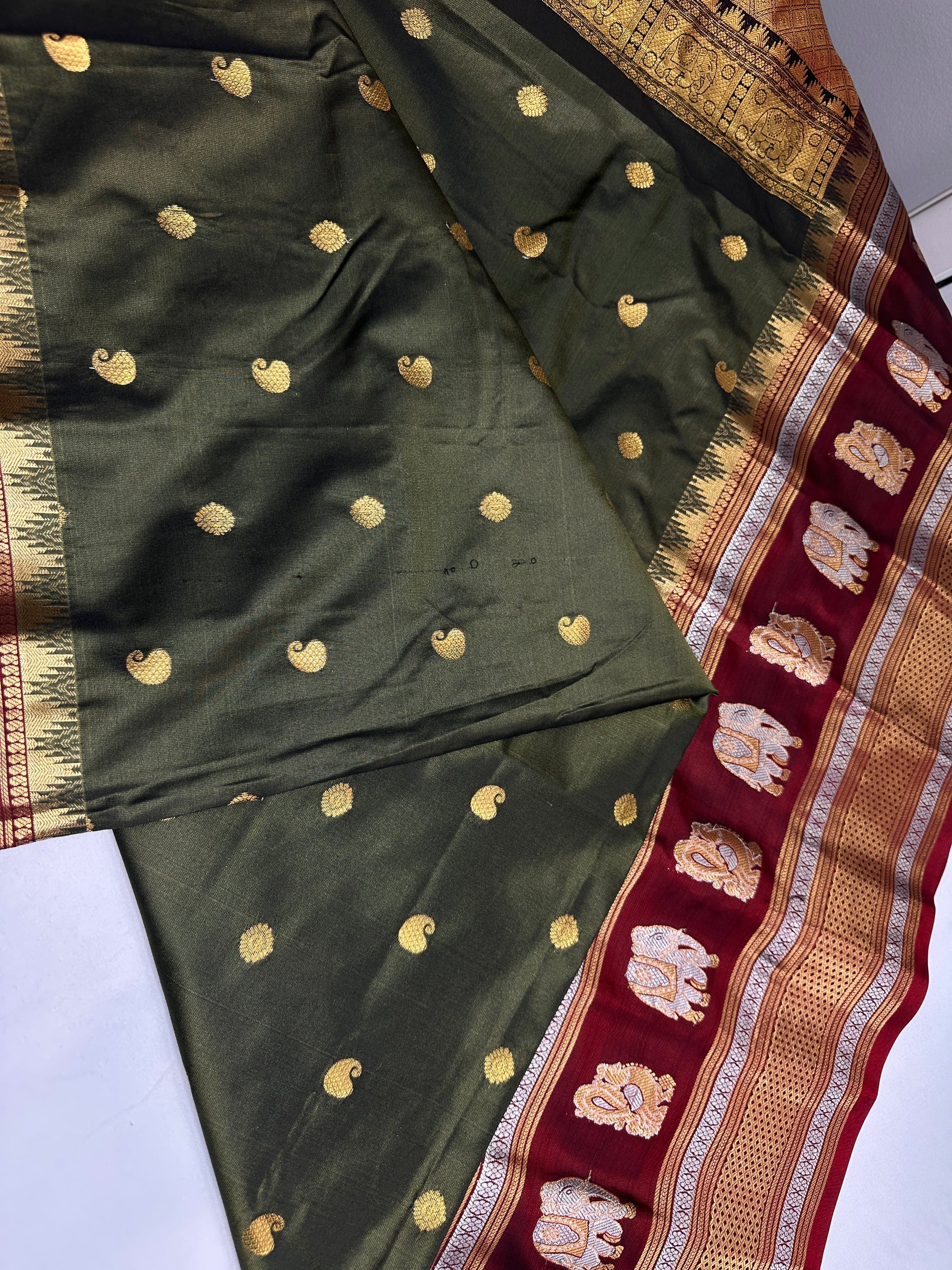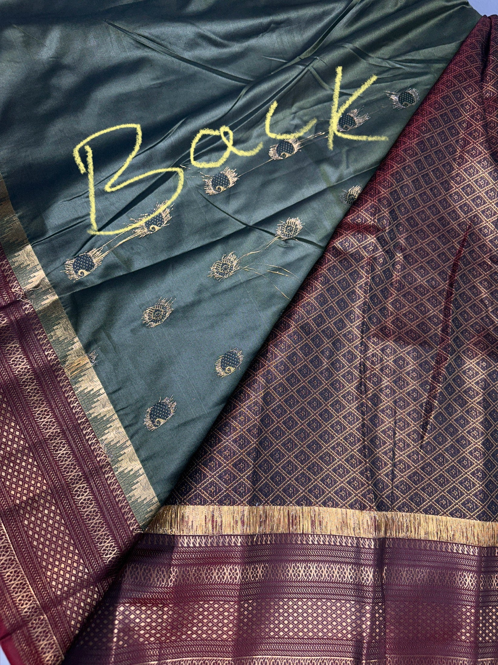 Mangalgiri Pattu Green Red Soft Silk Saree Saree Details : Green Color Saree Maroon Pallu Fall and Pico done Blouse Details : Maroon Blouse Size 38 and has margin to go up to Size 46; Sleeves Length : 10 Inches: Blouse Length : 15 Inches; Front Neck : 8 Inches; Back Neck : 10 Inches Inches