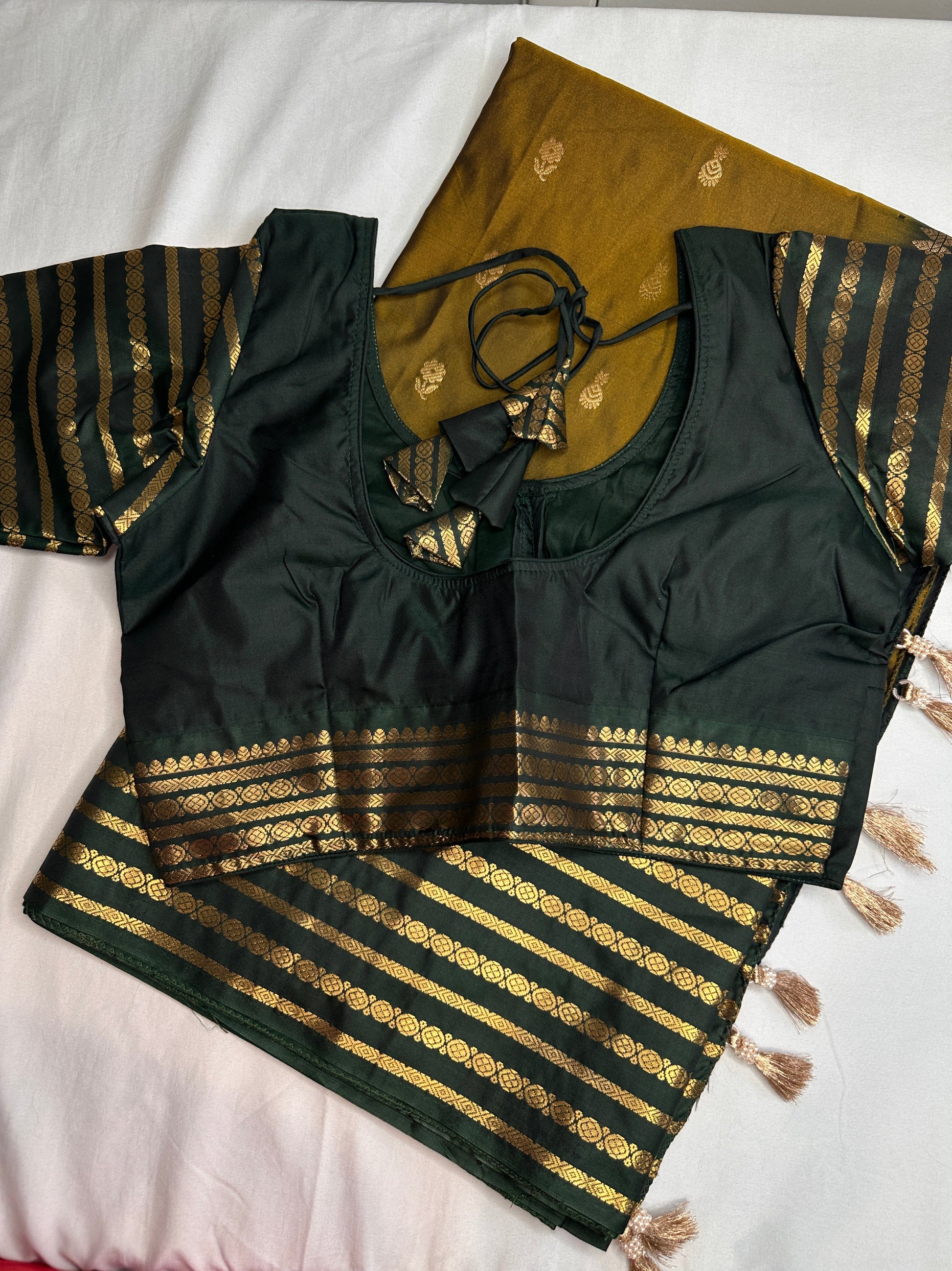 Blouse Details : Green Blouse Size 38 and has margin to go up to Size 46; Sleeves Length : 9.5 Inches: Blouse Length : 15 Inches; Front Neck : 8 Inches; Back Neck : 10 Inches Inches
