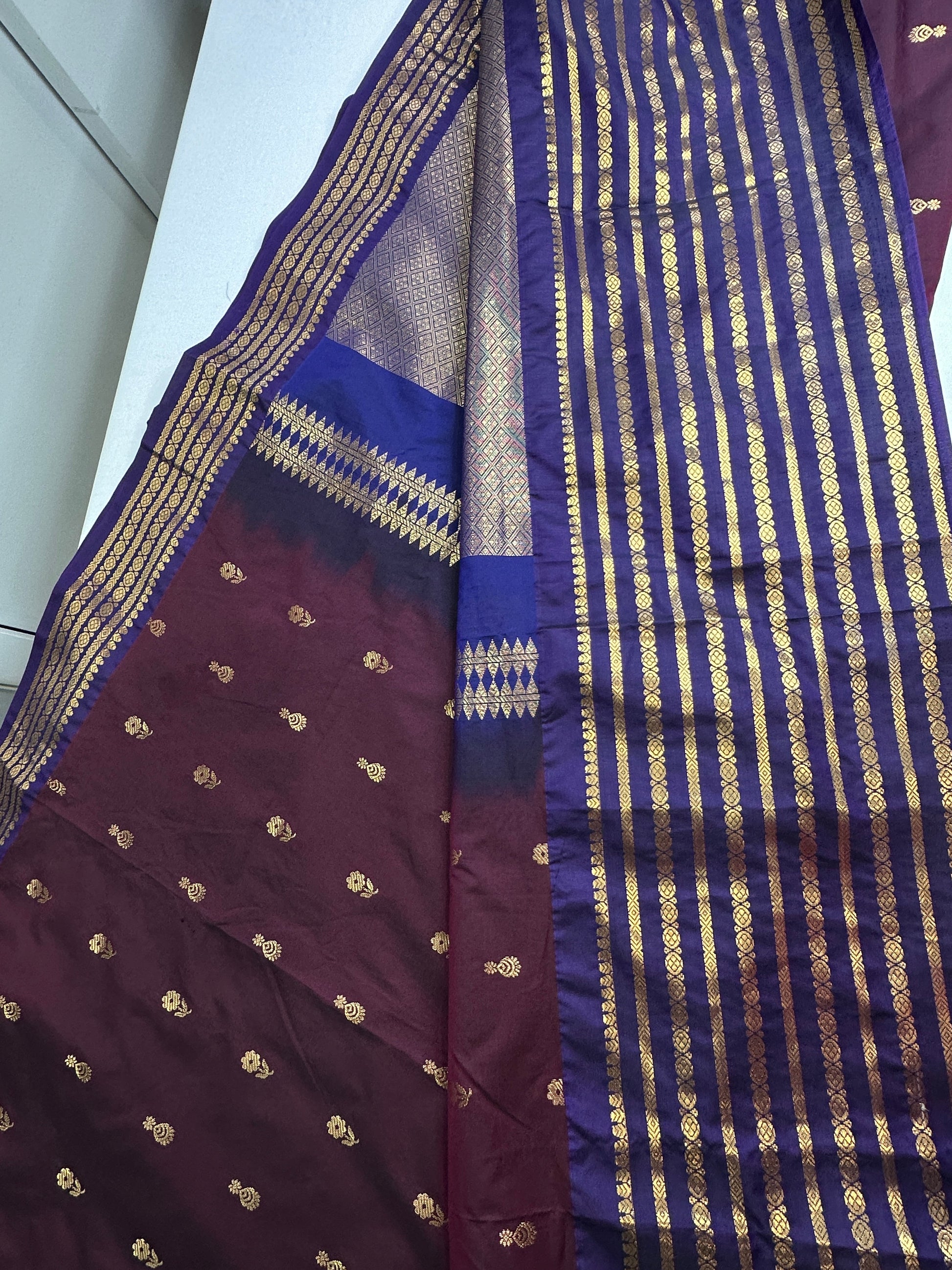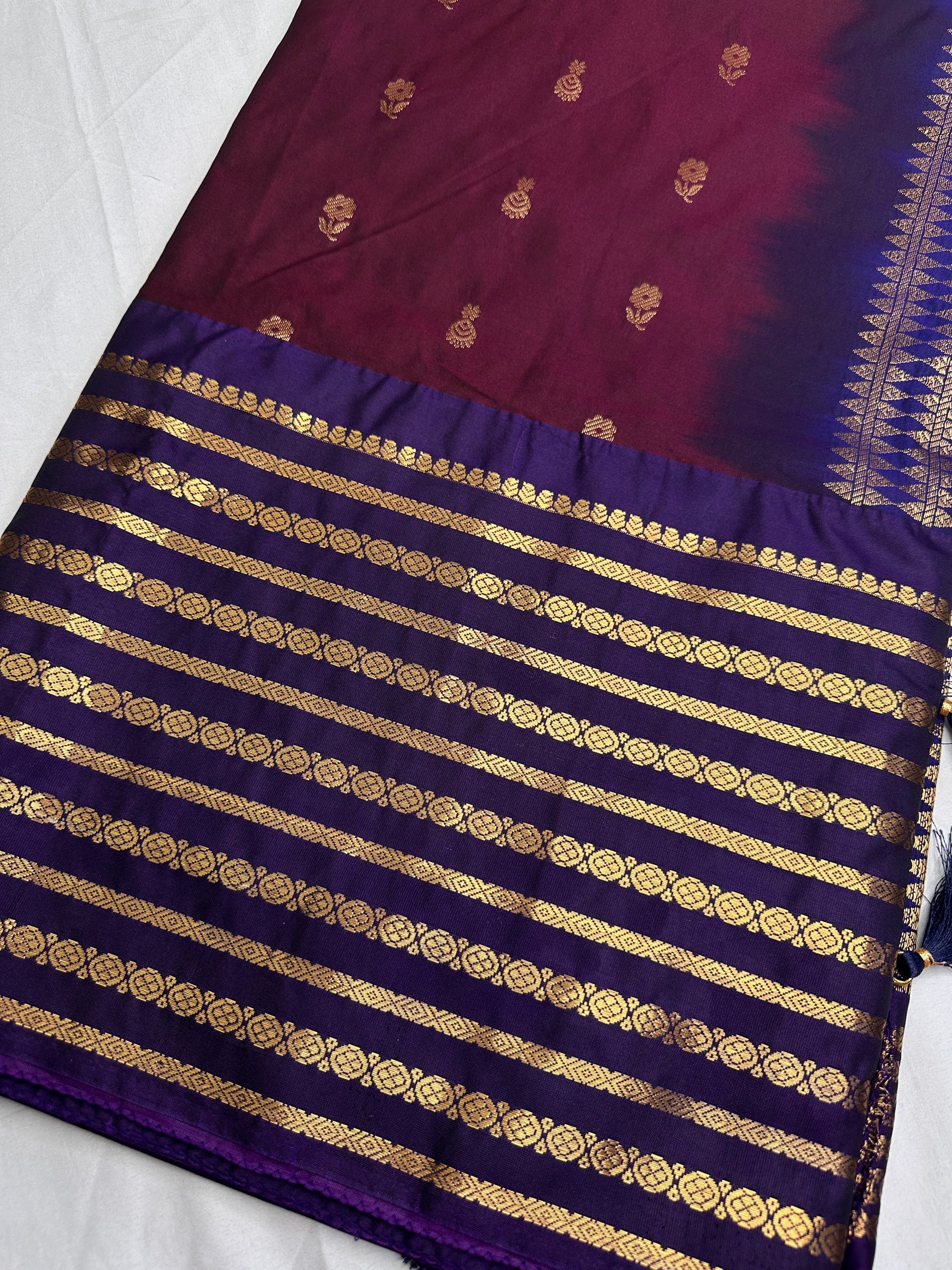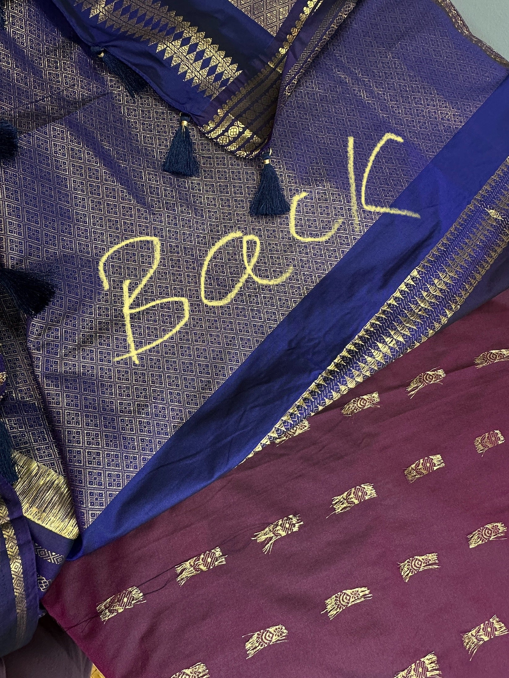 Mangalgiri Pattu Wine Purple Soft Silk SareeSaree Details : Wine Color Saree Purple Pallu Fall and Pico doneBlouse Details : Purple Blouse Size 38 and has margin to go up to Size 46; Sleeves Length : 9.5 Inches: Blouse Length : 15 Inches; Front Neck : 8 Inches; Back Neck : 10 Inches Inches