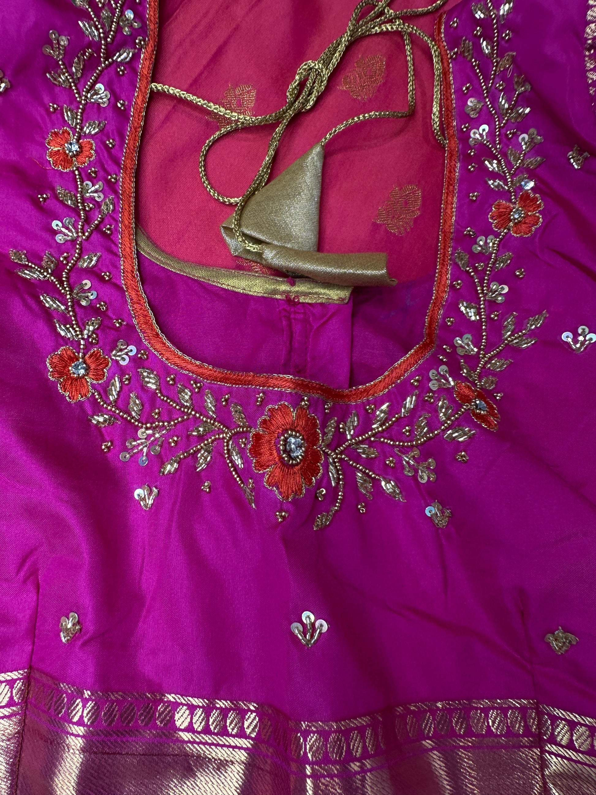 Blouse Details : Pink Blouse Size 38 and has margin to go up to Size 44; Sleeves Length : 9.5 Inches: Blouse Length : 15 Inches; Front Neck : 7 Inches; Back Neck : 10 Inches Inches