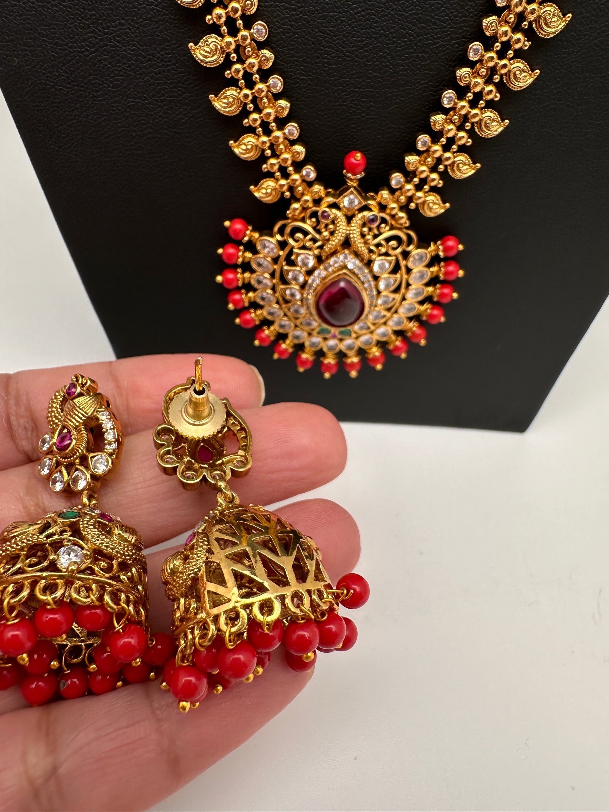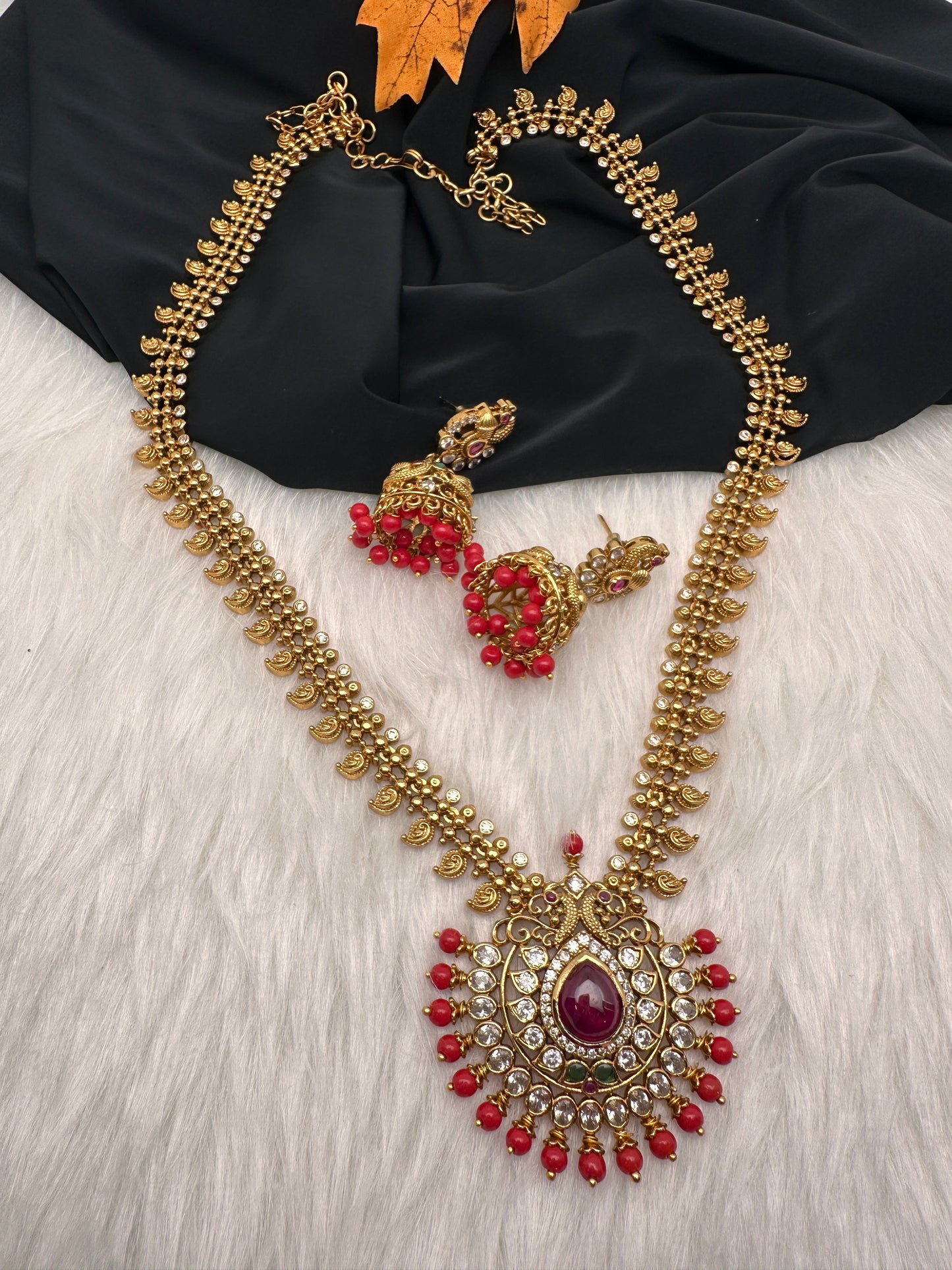 Mango Pattern Coral CZ Long Matte Ethnic Necklace with Matching JhumkasColor : MatteSize : Necklace Length : 22 inches; Earring Length : 1.75 Inches ApproxStones : CZ Red Green Stone Coral Beads