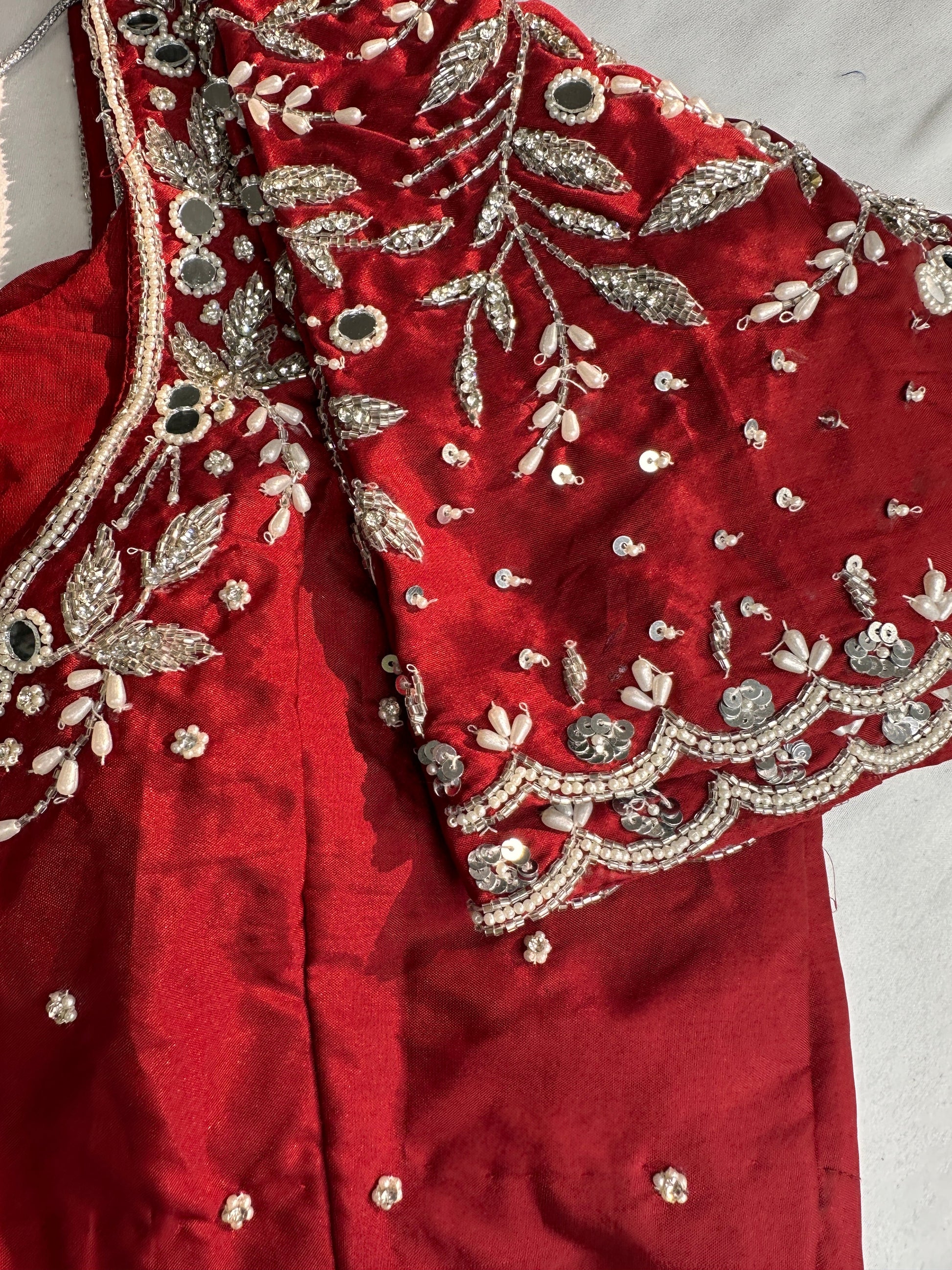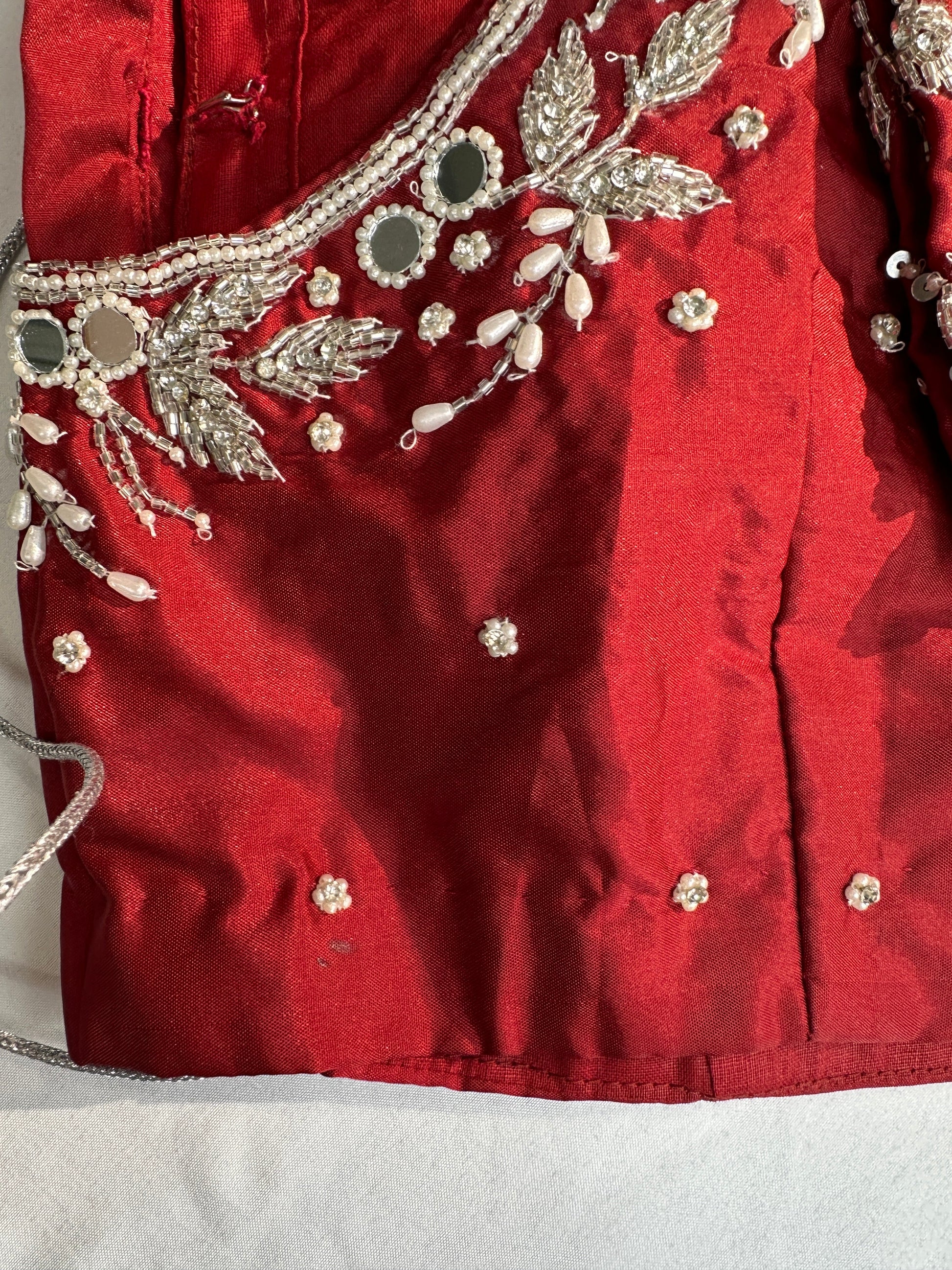 Marron Red Mirror work Maggam Aari Embroidery BlouseBlouse Details : Blouse Color : Red; Blouse stitched Size 38 and can be altered from 36 to 44, Sleeves Length : 10 Inches, blouse Length 15 Inches, FrontNeck : 7 Inches and Back Neck : 9.5 Inches;