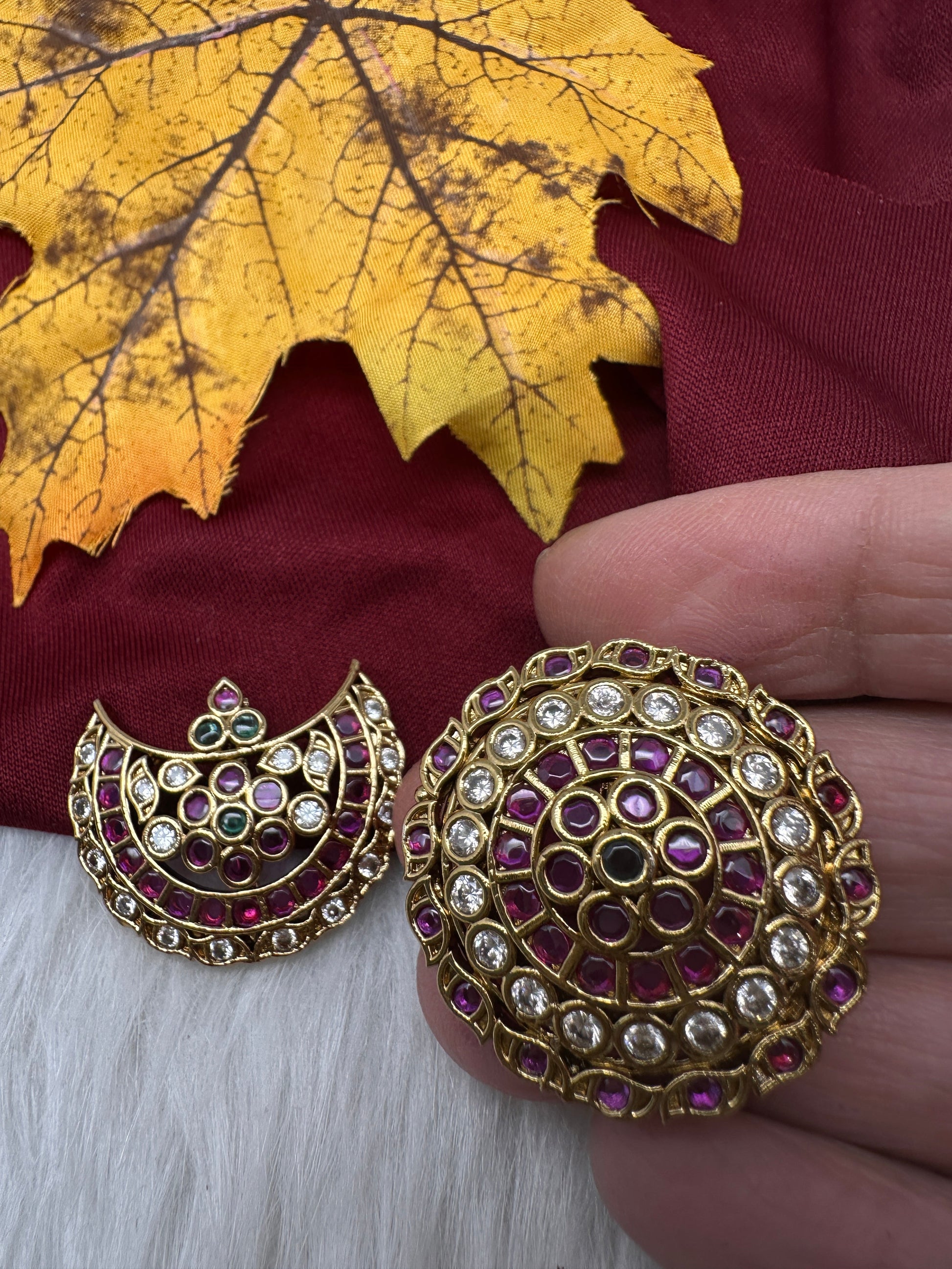 Matte Finish CZ Sun Moon Surya Chandra Hair Pin.Set of 9 Hair Pins 3 Small 3 Medium and 3 Large Classical Dance Jewelry accessoriesColor : MatteStones : AD Red Green Stone