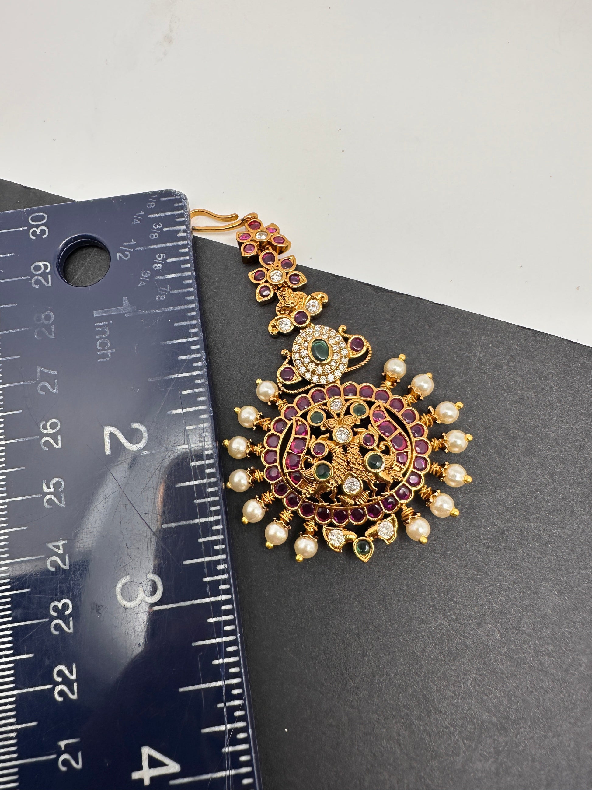Matte Kempu Mang TikaColor : MatteSize : Length : Approx 3.25 inchesStones : Red Green Stone CZ Pearls