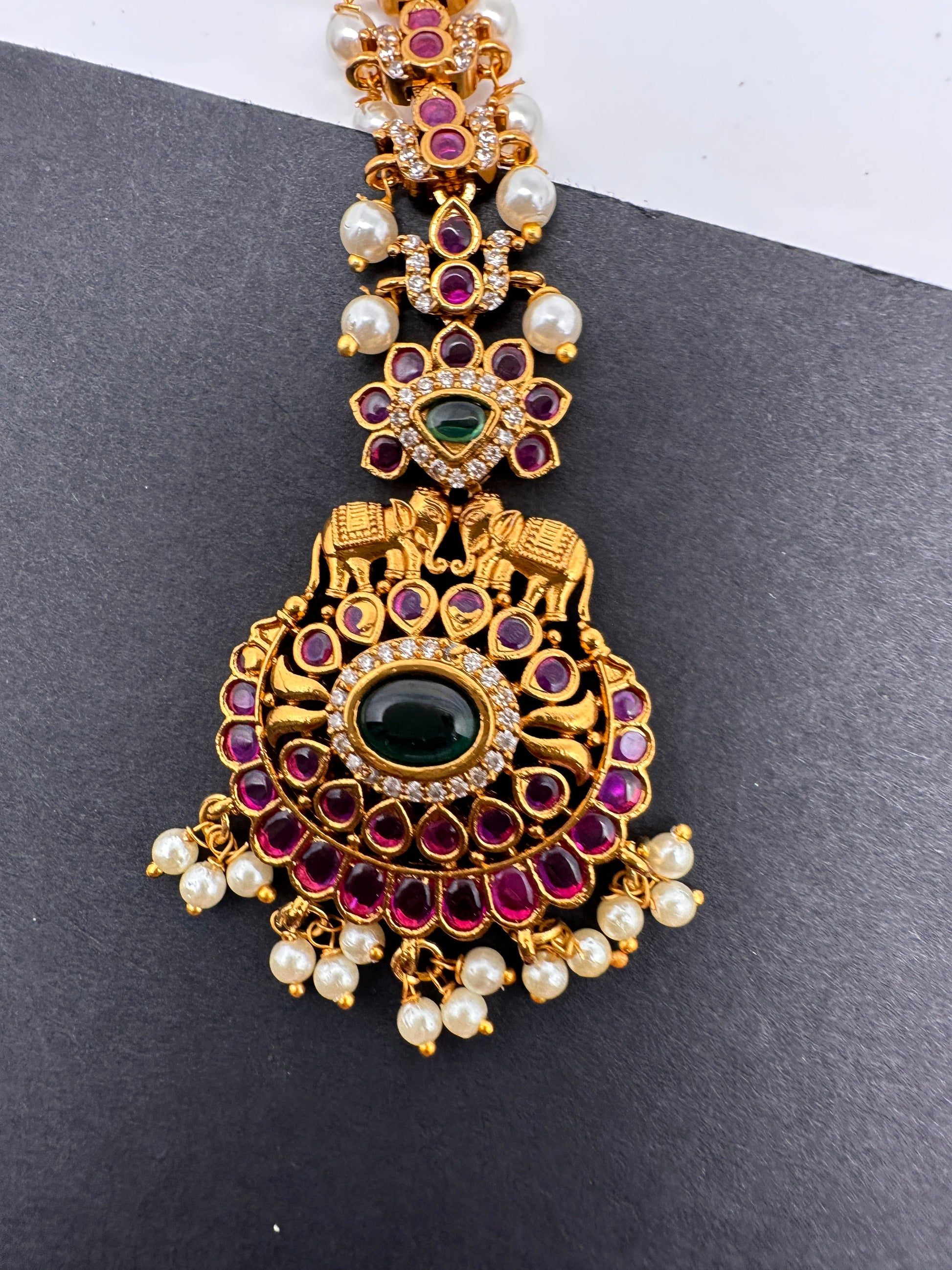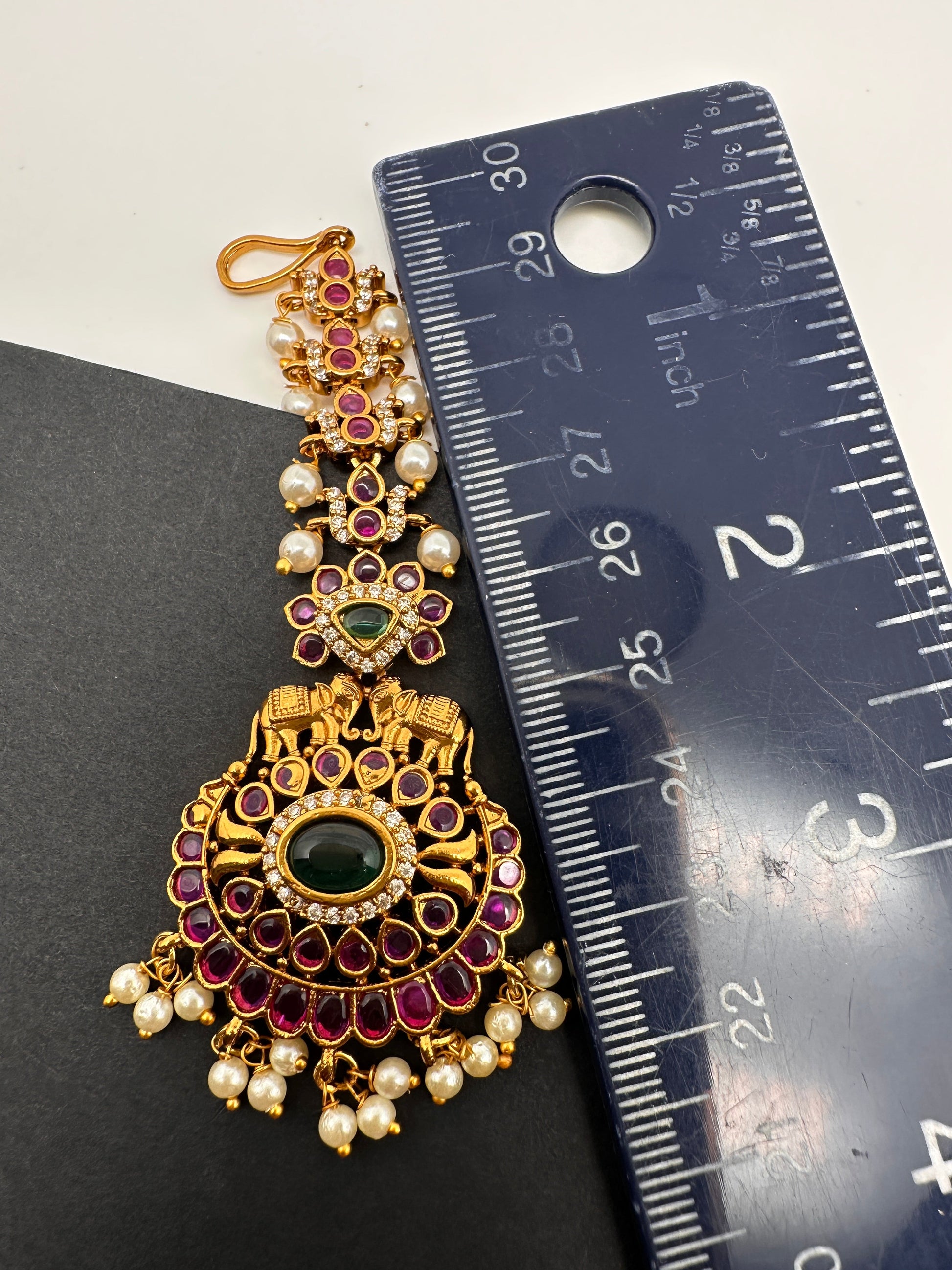 Matte Kempu Mang TikaColor : MatteSize : Length : Approx 3.25 inchesStones : Red Green Stone CZ Pearls